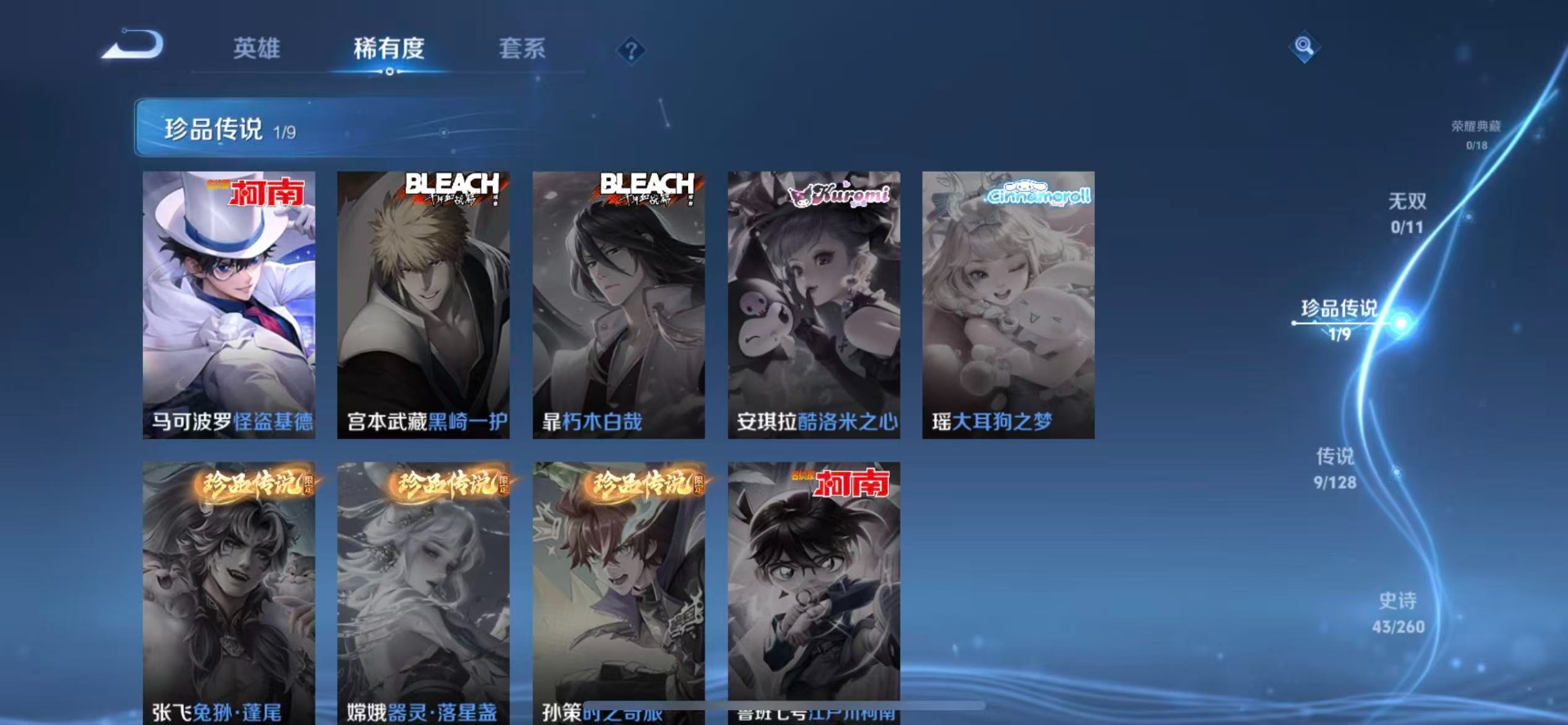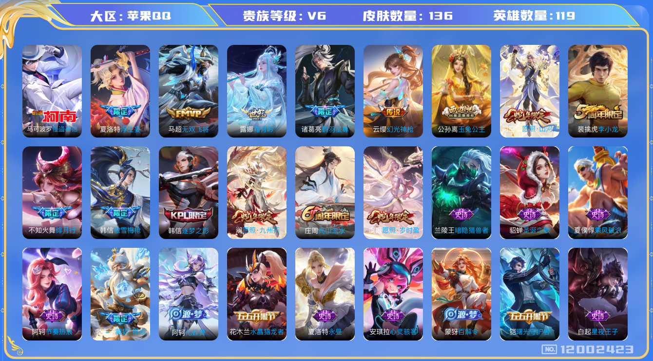 [12002423]V6 1珍品传说 9传说 119英雄 136皮肤 可修改实名 优质装备:怪盗基德,无双飞将,浮生妄,鹤羽星尊,霜月吟 传说皮:幻光神枪 珍宝阁皮:万物之道,蔷薇恋人 限定皮:愿照·九州拓(澜年限),愿照·岁时盈(虞姬年限),愿照·山河定(司空震年限),傲雪梅枪,绯月行,高山流水,李小龙,逐梦之影,玉兔公主 史诗皮:器灵·浮梦炉,化蝶舞,龙之律动,藏狐·褐绒,茶境仙,芈月浮光幕影,黄金分割率,特工魅影,永昼,江河有灵,百解令(蒙犽),冰冠公主,猫狗日记-孙策,时之恋人-孙尚香,乱世虎臣,节奏热浪,修罗,女仆咖啡,水果甜心,天才门将,星夜王子,心灵骇客,暗隐猎兽者,乘风破浪,逐浪之夏,水晶猎龙者,曙光守护者,金属风暴,圣诞狂欢,圣诞恋歌,鹰眼统帅,魅力维加斯,黎明之约
