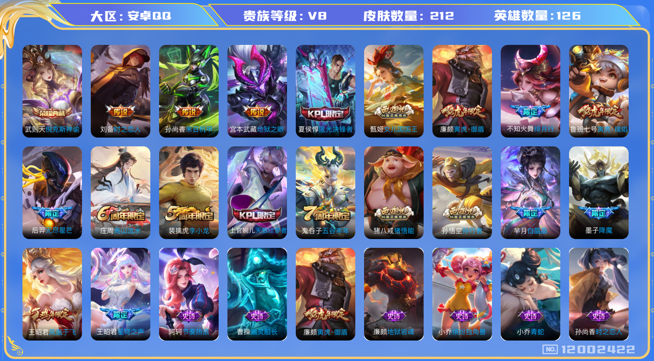 [12002422]V8 1典藏 8传说 126英雄 212皮肤 典藏英雄武则天 可修改实名 优质装备:倪克斯神谕(宇宙婆娘),末日机甲-孙尚香(绿蚂蚱),地狱之眼,时之恋人-刘备(电焊工) 珍宝阁皮:女武神 限定皮:凤凰于飞,星穹之声,绯月行,白晶晶,高山流水,匿光决锋者,降魔,五谷丰年,天狼绘梦者,李小龙,孙行者,猪悟能,女儿国国王,寅虎·御盾(廉颇年限),寅虎·瑞焰(虎皮蛋子),无尽星芒 史诗皮:龙之律动,蔬乡物语(鲁班七号),苍穹之光,电玩小子(小书包),白龙吟,千年之狐,完美假期,魅语,青蛇,偶像歌手,时之恋人-孙尚香,节奏热浪,修罗,摇滚巨星,水果甜心,星夜王子,心灵骇客,时之奇旅-安琪拉,功夫厨神,暗隐猎兽者,幽灵船长,暗渊魔法,心灵战警,地狱岩魂,繁星吟游(呼啦呼啦),拒霜思,缤纷独角兽,水晶猎龙者,唤灵魅影,金属风暴,圣诞狂欢,鹰眼统帅,暗夜贵公子,魅力维加斯,赏金猎手,寅虎·御盾,千筹问战,无心,未来纪元-赵云