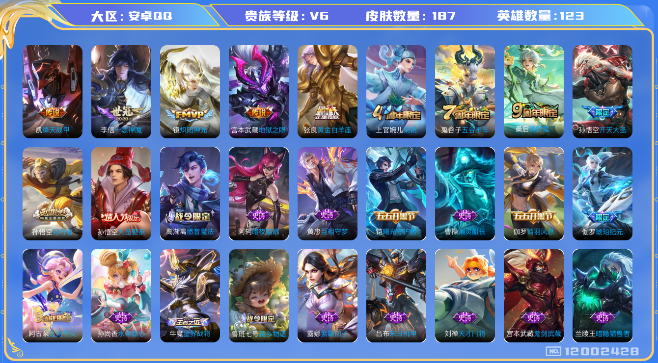 [12002428]V6 7传说 123英雄 187皮肤 可修改实名 优质装备:绛天战甲(鸡嘴战神),黄金白羊座,炽阳神光,一念神魔,地狱之眼 珍宝阁皮:胡桃夹子 限定皮:鸣野蒿,齐天大圣,五谷丰年,梁祝,孙行者,大圣娶亲 史诗皮:星界战将,琥珀纪元伽罗,蔬乡物语(鲁班七号),百相守梦-黄忠,紫霞仙子,江河有灵,百解令(蒙犽),高渐离燃音魔法,暗夜猫娘,龙骑士(小龙虾),末日机甲-吕布,女仆咖啡,摇滚巨星,水果甜心,天才门将,心灵骇客,功夫厨神,暗隐猎兽者,幽灵船长,鬼剑武藏,纤云弄巧,拒霜思,水晶猎龙者,曙光守护者,箭羽风息,金属风暴,原初追逐者,圣诞恋歌,鹰眼统帅,魅力维加斯