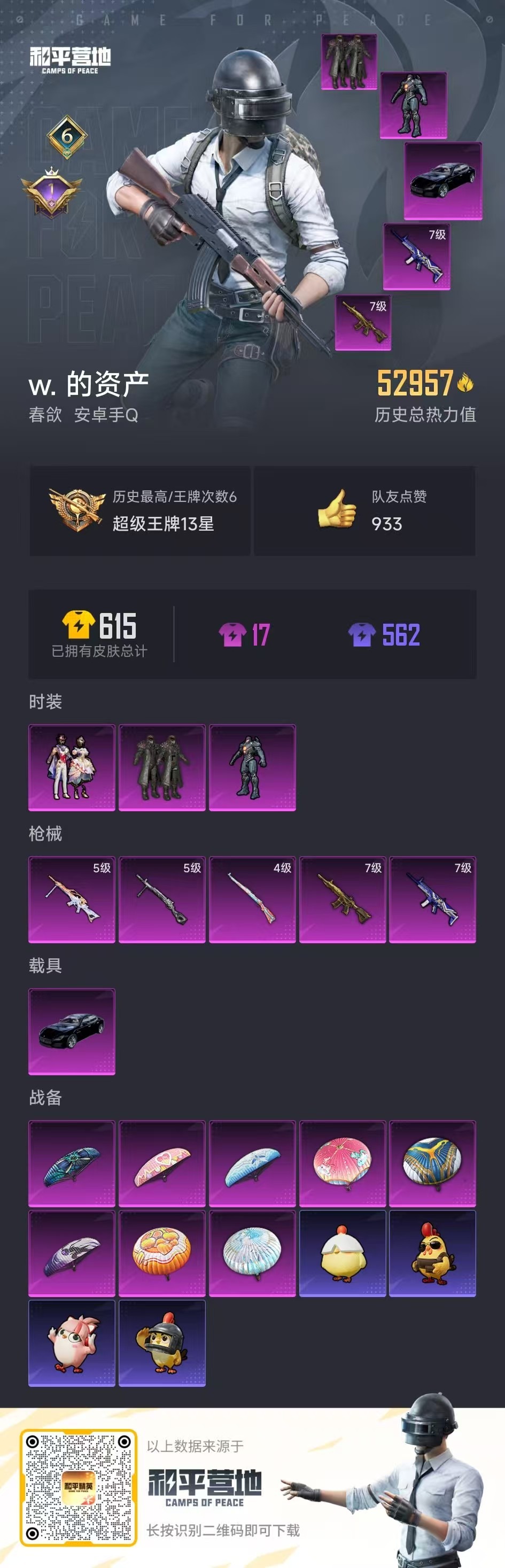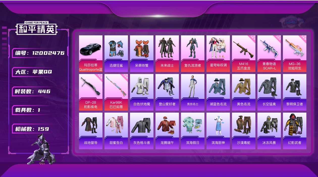 - PX_2106737- 苹果手Q-8王牌印记-4粉装-10特效枪-3载具-49639热力值-112套装-151枪皮-6卓越印记-2传奇印记 【4粉装】,洛天依,星穹咏叹调,羊梦糖心,狂魅哈莉 【10特效枪】SCAR-L-时空协奏-3级 M416-风花雪月-2级 M416-灵猫魔法师-3级 GROZA-镜光银凌-5级 Kar98K-巳巳如意-5级 AMR-智耀战神-5级 Mk14-甜梦熊击-5级 U