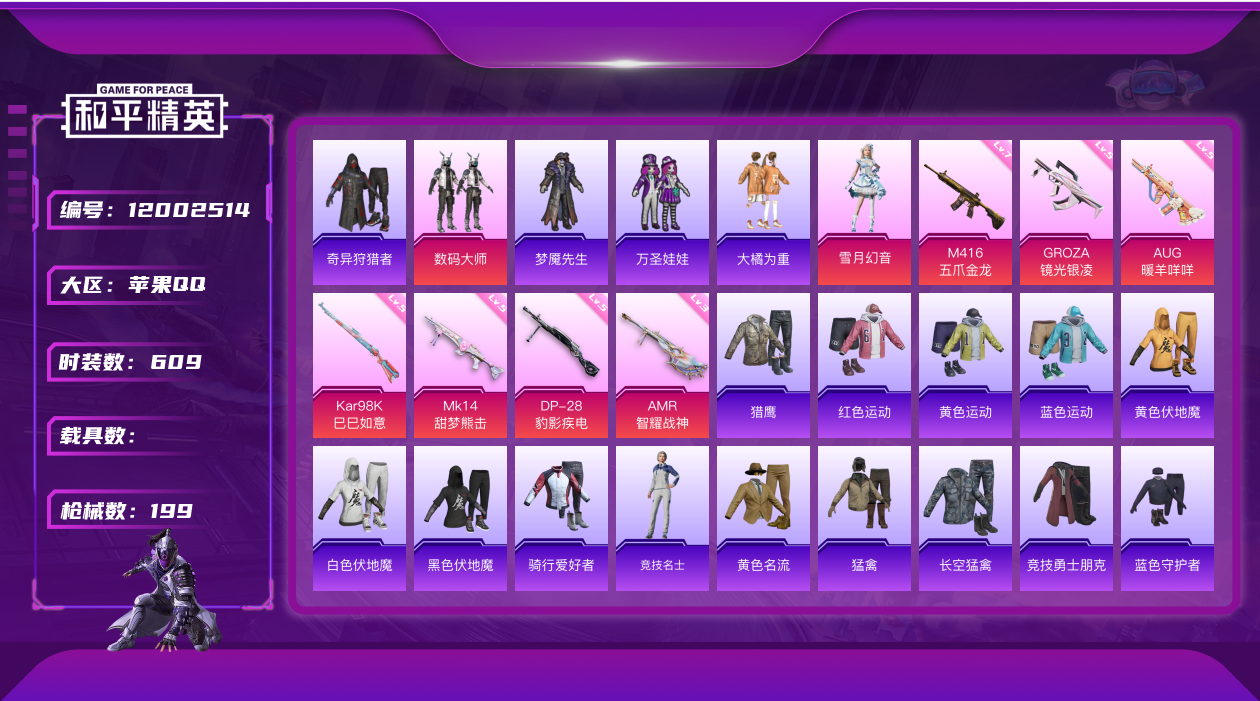 [12002514]2粉装 7特效枪 8印记 可二次 可修改实名 优质装备:M416五爪金龙,奇异狩猎者,数码大师,七级M416-五爪金龙,GROZA-镜光银凌,AUG-暖羊咩咩,雪月幻音,AMR-智耀战神,MK14-甜梦熊击,Kar98K-巳巳如意 热门装扮:大橘为重,万圣娃娃,梦魇先生 稀有枪皮:DP-28-豹影疾电 五级特效枪:五级GROZA-镜光银凌,五级Kar98K-巳巳如意,五级DP-28-豹影疾电,五级MK14-甜梦熊击,五级AUG-暖羊咩咩 三级特效枪:三级AMR-智耀战神 紫色装扮:田园牧歌,轻风白浪,SS22特训,SS23特训,娇憨猪猪,萌趣咩咩,SS21特训,绚烂繁星,SS31特训套装,SS3特训,SS4特训,SS5特训,军械专家,冰原使者,,冰川特警,冷焰舞者,凛冬战士,北国孤狼,SS30特训套装,SS33特训套装,SS15特训,双棍侠客,时空追击者,暴风机械师,SS16特训,遗落祭司,SS13特训,SS14特训,特种颜团子,吉莉礼服,瑞龙福将,团圆交子,SS17特训,冰川谧蓝,异彩先驱,SS18特训,金鼠迎春,长空猛禽,雪山征服者,雪山精英,霓虹极客,霓虹街区,迎春赐吉,缤纷果语,耀眼新星,蓝彩潮人,蓝色守护者,蓝色运动,虎虎生威吉莉,超能勇士,风行保卫者,飞行日记,龙腾端午,骑行爱好者,魅力单车,麻辣教官,黄色伏地魔,黄色名流,黄色格斗者,黄色运动,黑色伏地魔,龟仙人,香桃花海,极速红龙,格斗先锋,沙漠兵团,深蓝色名流,滨海假日,幻影武者,圣诞大吉,坚韧舞者,夜莺强袭者,战地督导,战地菁英,滨海厨神,疯狂小兔子,白色伏地魔,破晓战魂,破蛋小黄鸡,神秘领域,甜蜜告白,福星高照,空投萌叽,竞技勇士朋克,红色运动,甜蜜熊情侣,牛气冲天,灰色格斗者,热血青春,热血骑手,牛气满满,猛禽,特战装甲,狂沙舞者,猎鹰,小熊娃娃,雏菊兔兔,萝兰蝴蝶,SS29特训,星途旅人,火种守护者(套装-火种守卫者),鱼渊荷华,燕燕于飞,巳巳如意,青团波波,糖糖葫芦,棉花软糖,竞技名士,SS24特训(SS24特训套装),SS25特训,粉红小猪,SS27特训,金羽特工,SS26特训,智谋强哥,精神漫游,SS6特训,核芯基因,SS7特训,深蓝冒险家,迷域探索者,黑夜传说,淡雅花蕊,SS8特训,幻世猎手,大橘大利,原初圣火,逆风勇士,SS12特训,众神之王,智慧之神,SS9特训,红酒骑士,风华