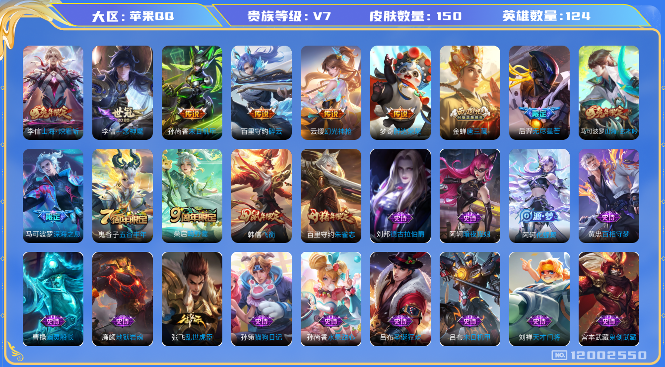 [12002550]V7 9传说 124英雄 150皮肤 可修改实名 优质装备:一念神魔,末日机甲-孙尚香(绿蚂蚱),胖达荣荣,碎云,山海·炽霜斩(李信年限),涂山容容 传说皮:幻光神枪 珍宝阁皮:女武神 限定皮:鸣野蒿,飞衡(韩信年限),五谷丰年,朱雀志(守约年限),无尽星芒,深海之息(深海大菠萝),唐三藏,山海·玄木吟(马可年限) 史诗皮:化蝶舞,龙之律动,蒙犽顽岩魄,百相守梦-黄忠,特工魅影,冰冠公主,暗夜猫娘,末日机甲-吕布,猫狗日记-孙策,乱世虎臣,水果甜心,天才门将,德古拉伯爵,暗隐猎兽者,幽灵船长,鬼剑武藏,地狱岩魂,逐浪之夏,龙鼓争鸣,金属风暴,圣诞狂欢,鹰眼统帅,魅力维加斯,未来纪元-赵云