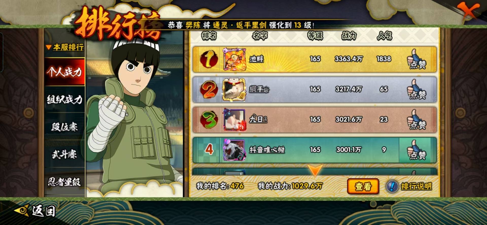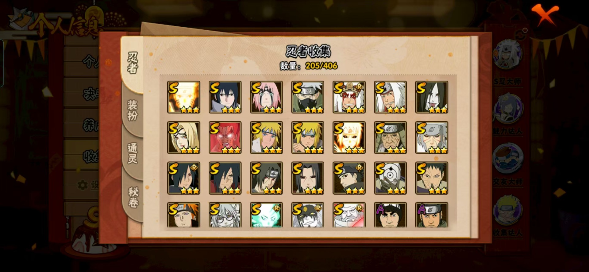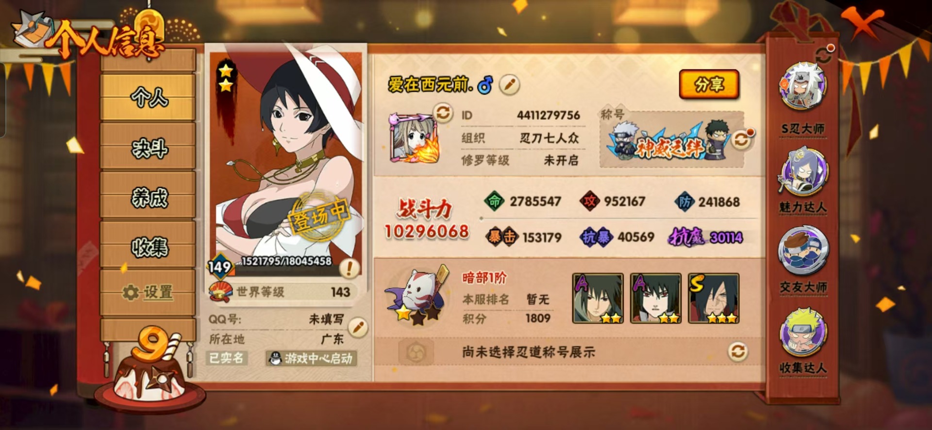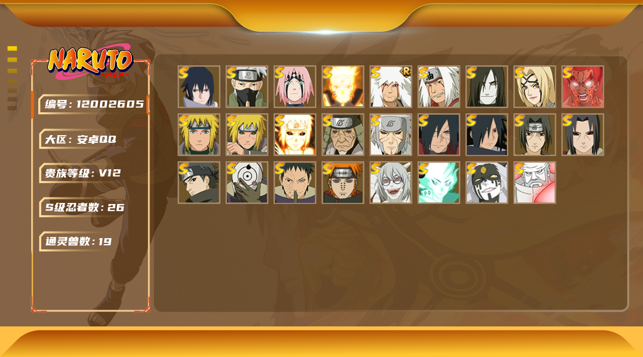 [12002605]V12 26S忍 43A忍 19通灵 1029.6W战力 可二次 可修改实名 优质装备:熊猫,宇智波鼬「秽土转生」,药师兜「仙人模式」,宇智波斑 「木叶创立」,千手扉间「秽土转生」,纲手「百豪」,波风水门「秽土转生」,猿飞日斩「秽土转生」,迈特凯「死门」,宇智波带土 「忍界大战」,“宇智波斑” 「白面具」,漩涡鸣人 「九喇嘛连结」,大筒木金式「博人传」,春野樱 「忍界大战」,宇智波佐助「永恒万花筒」,宇智波斑「秽土转生·解」,大筒木桃式,宇智波止水「须佐能乎」,旗木卡卡西「须佐能乎」,大筒木舍人 「最终章」,自来也 「传说中的三忍」 S级忍者:自来也 「舞之豪杰」,波风水门「九喇嘛连结」,宇智波鼬 「须佐能乎」,佩恩「天道」,波风水门,大蛇丸