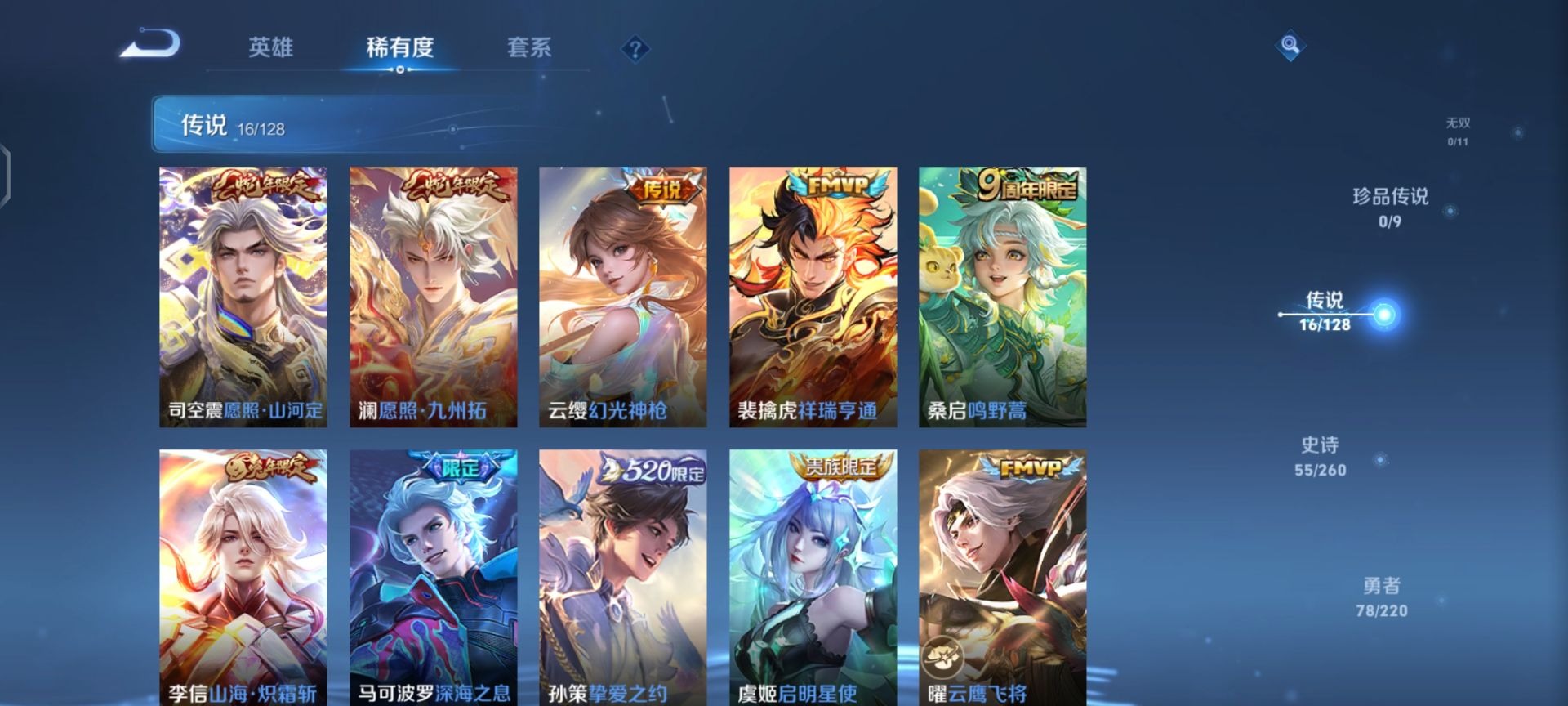 铠青龙志,后羿如梦令,镜匿光追影者,司空震愿照·山河定,公孙离蜜橘之夏,裴擒虎李小龙,上官婉儿梁祝,上官婉儿天狼绘梦者,艾琳陌上桑,马可波罗深海之息,桑启鸣野蒿,马超神威,韩信傲雪梅枪,韩信飞衡,澜愿照·九州拓