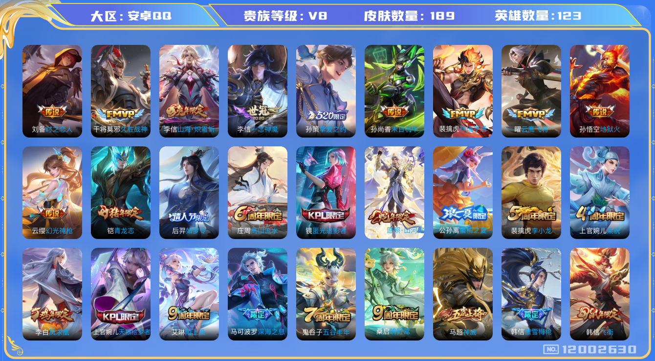 [12002630]V8 16传说 123英雄 189皮肤 可修改实名 优质装备:云鹰飞将(小将军),久胜战神,一念神魔,末日机甲-孙尚香(绿蚂蚱),地狱火,时之恋人-刘备(电焊工),挚爱之约,山海·炽霜斩(李信年限) 传说皮:祥瑞亨通,幻光神枪 珍宝阁皮:妄想食味,玩趣恶龙 限定皮:愿照·九州拓(澜年限),愿照·山河定(司空震年限),陌上桑,鸣野蒿,凤求凰(白切鸡),傲雪梅枪,神威(电光马子),飞衡(韩信年限),高山流水,五谷丰年,青龙志(铠年限),梁祝,天狼绘梦者,李小龙,如梦令-后羿,蜜橘之夏,匿光追影者,深海之息(深海大菠萝) 史诗皮:器灵·浮梦炉,糖绘人间,瑰影绮梦,化蝶舞,谪仙醉月,破空之剑,苍穹之光,黄金分割率,特工魅影,千年之狐,永昼,无限星赏官,白蛇,晚萤,龙骑士(小龙虾),末日机甲-吕布,猫狗日记-孙策,猫狗日记-大乔,修罗,女仆咖啡,水果甜心,星夜王子,心灵骇客,幽灵船长,鬼剑武藏,舞动绿茵,乘风破浪,逐浪之夏,水晶猎龙者,曙光守护者,金属风暴,原初追逐者,鹰眼统帅,魅力维加斯,赏金猎手,奇遇舞章,无心