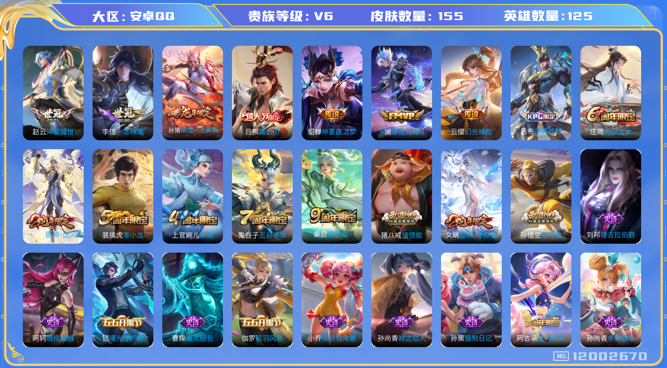 [12002670]V6 10传说 125英雄 155皮肤 可修改实名 优质装备:一念神魔,仲夏夜之梦(大飞蛾),淬星耀世,澜逐花归海 传说皮:乘龙·淬吴钩(孙策年限),吕布曦玄引,幻光神枪 珍宝阁皮:优雅恋人,蔷薇恋人,玩趣恶龙 限定皮:愿照·山河定(司空震年限),愿照·千秋盛(女娲年限),逐霄战戟,鸣野蒿,高山流水,五谷丰年,梁祝,李小龙,孙行者,猪悟能 史诗皮:星界战将,百相守梦-百里守约,千年之狐,江河有灵,百解令(蒙犽),蒙恬荣光圣徽,偶像歌手,暗夜猫娘,猫狗日记-孙策,时之恋人-孙尚香,女仆咖啡,摇滚巨星,水果甜心,绅士熊喵,天才门将,星夜王子,心灵骇客,时之奇旅-安琪拉,德古拉伯爵,暗隐猎兽者,幽灵船长,鬼剑武藏,心灵战警,拒霜思,缤纷独角兽,水晶猎龙者,曙光守护者,箭羽风息,金属风暴,原初追逐者,圣诞狂欢,圣诞恋歌,鹰眼统帅,魅力维加斯,黎明之约