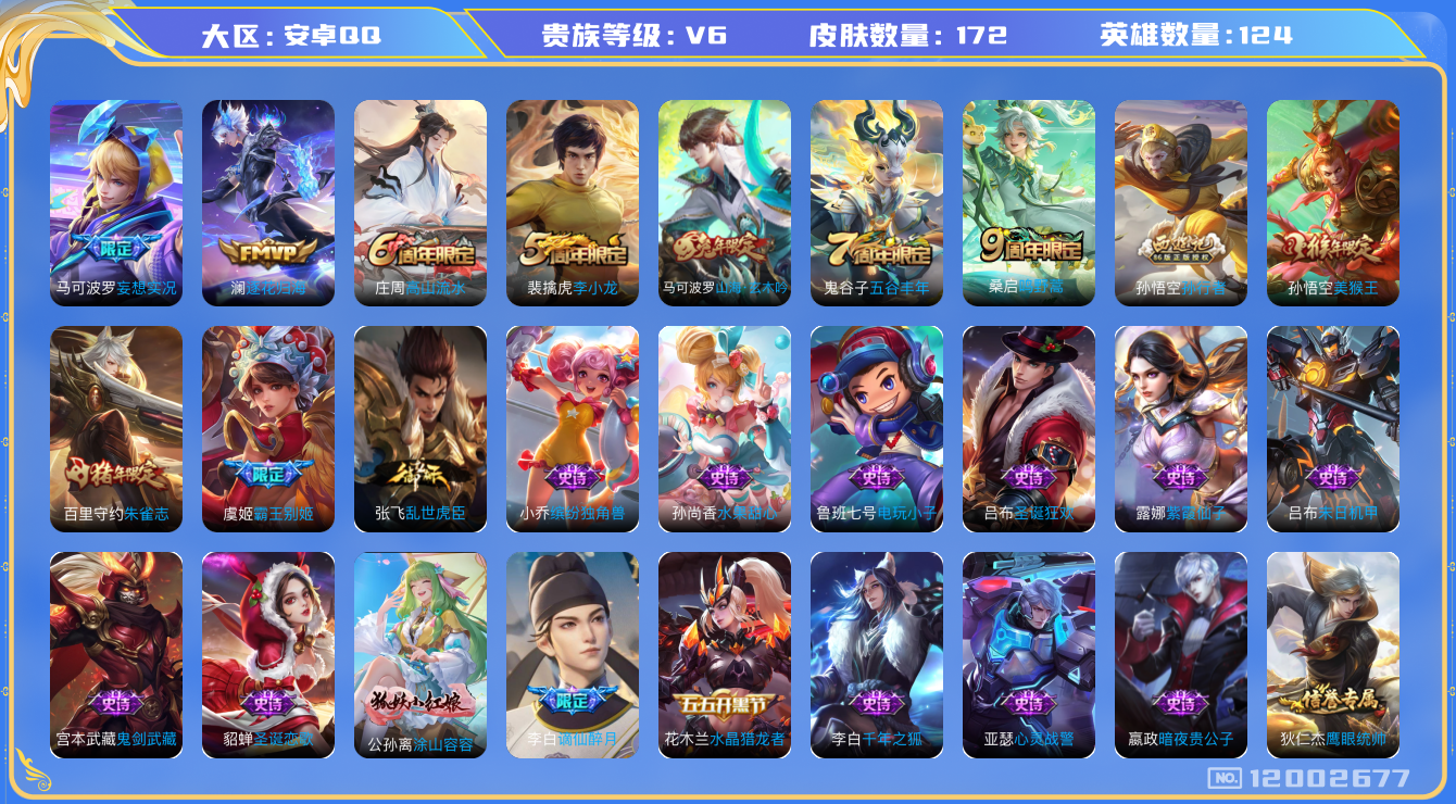 [12002677]V6 3传说 124英雄 172皮肤 可修改实名 优质装备:妄想实况,澜逐花归海,涂山容容 珍宝阁皮:蔷薇恋人 限定皮:鸣野蒿,高山流水,五谷丰年,李小龙,朱雀志(守约年限),霸王别姬-虞姬,孙行者,美猴王,山海·玄木吟(马可年限) 史诗皮:谪仙醉月,紫霞仙子,电玩小子(小书包),特工魅影,千年之狐,真我赫兹(百里守约),蒙恬荣光圣徽,冰冠公主,龙骑士(小龙虾),末日机甲-吕布,乱世虎臣,水果甜心,鬼剑武藏,心灵战警,乐园奇幻夜,舞动绿茵,纤云弄巧,缤纷独角兽,逐浪之夏,水晶猎龙者,原初追逐者,圣诞狂欢,圣诞恋歌,鹰眼统帅,暗夜贵公子,魅力维加斯,黎明之约,赏金猎手