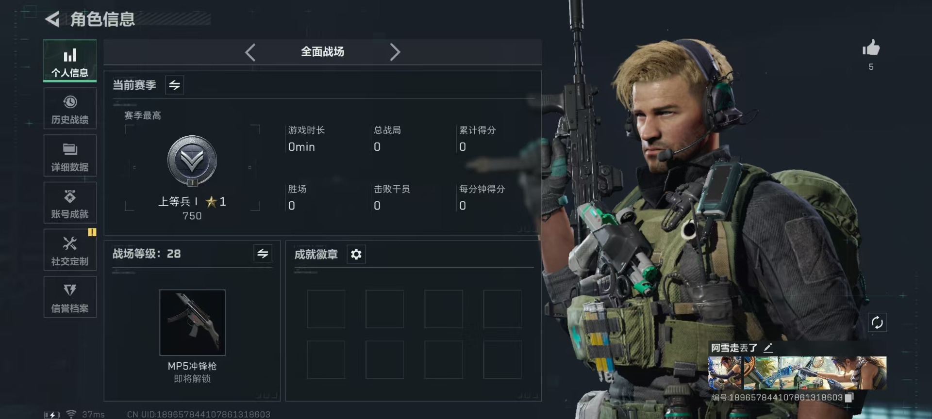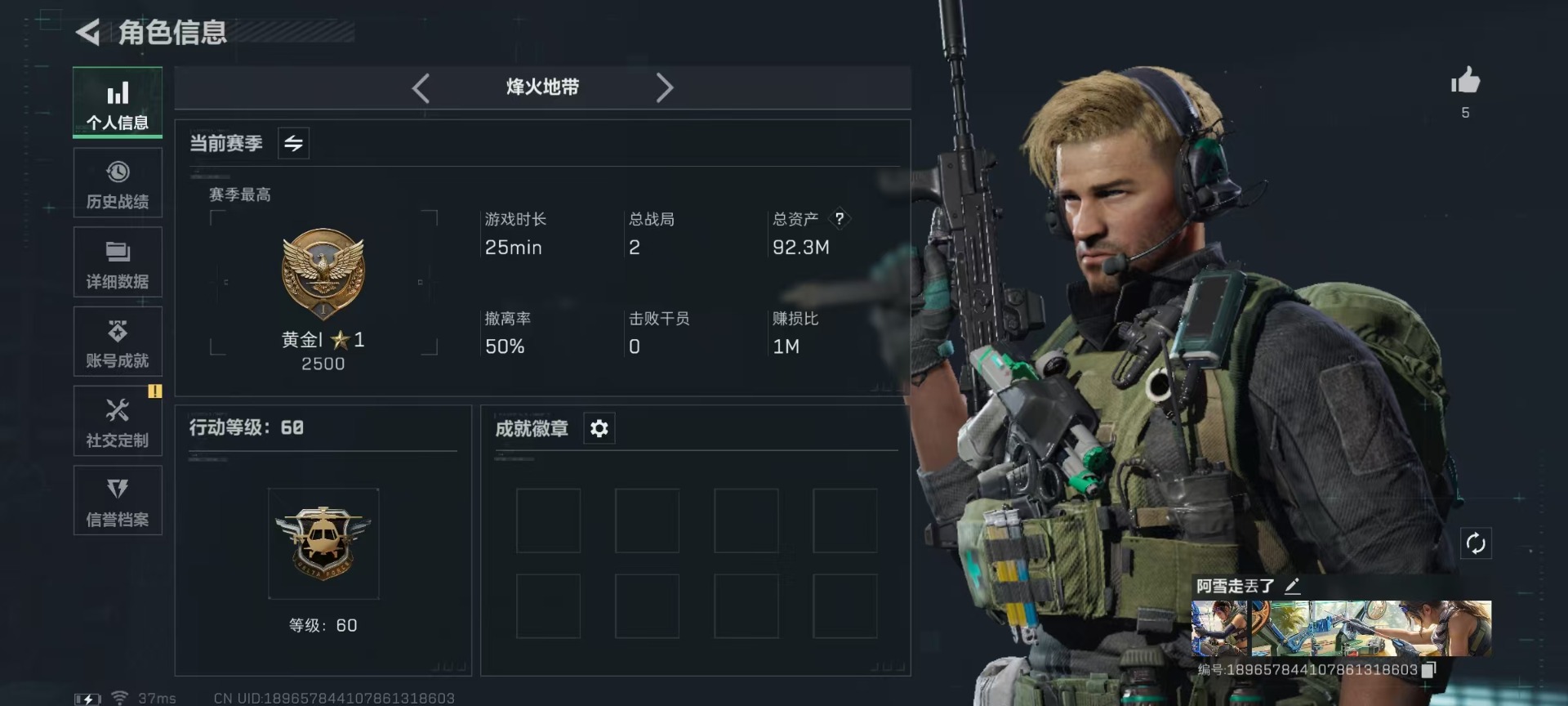 [12002799]总资产:92.3M 6传说枪械 哈夫币:50.194K 可二次 可修改实名 烽火地带段位:黄金 全面战场段位:上等兵 传说武器皮肤:M16A4突击步枪-狩猎时刻,M4A1突击步枪-阿米娅,CAR-15突击步枪-阿米娅,复合弓-黑-天际线,Vector冲锋枪-狩猎时刻,G3战斗步枪-狩猎时刻 史诗武器皮肤:M1014霰弹枪-林中猎手,SCAR-H战斗步枪-囚徒,SV-98狙击步枪-林中猎手,PTR-32突击步枪-英雄,SV-98狙击步枪-囚徒,P90冲锋枪-紧急戒备,QJB201轻机枪-Old Habits,QBZ95-1突击步枪-曙光,MP5冲锋枪-深海恐惧,AKM突击步枪-林中猎手