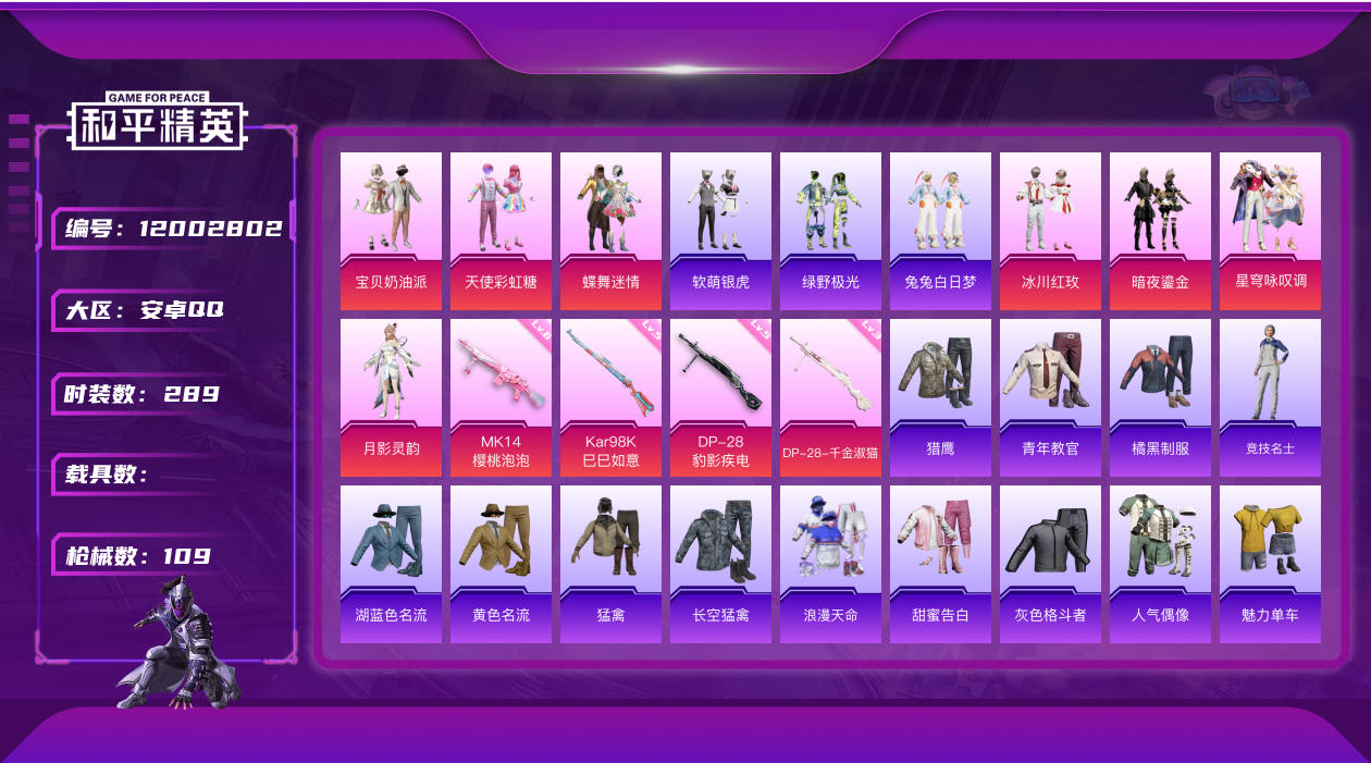 [12002802]7粉装 4特效枪 5印记 可二次 可修改实名 身法装备:暗影哥特(红眼罩) 优质装备:蝶舞迷情,宝贝奶油派,天使彩虹糖,DP-28-千金淑猫,月影灵韵,MK14-樱桃泡泡,星穹咏叹调,Kar98K-巳巳如意 热门装扮:冰川红玫,暗夜鎏金,兔兔白日梦,软萌银虎,绿野极光 稀有枪皮:DP-28-豹影疾电 六级特效枪:六级MK14-樱桃泡泡 五级特效枪:五级Kar98K-巳巳如意,五级DP-28-豹影疾电 三级特效枪:三级DP-28-千金淑猫 紫色装扮:幻彩翩翩,SS23特训,妙红点点,霓虹热舞,SS30特训套装,SS31特训套装,云朵鹅,雪绒豹,SS33特训套装,SS21特训,熠彩粉晶,星夜迷魅,田园牧歌,轻风白浪,SS22特训,莱茵河畔,顶瓜瓜,萌趣咩咩,人气偶像,娇憨猪猪,团圆交子,虚音幻奏,酸甜橘柚,黄色名流,青年教官,飞行日记,魅力单车,麻辣教官,龙的传人,长空猛禽,绛羽幽主,湖蓝色名流,灰色格斗者,牛气冲天,牛气满满,柠萌假日,橘黑制服,竞技达人朋克,缤纷果语,狂沙舞者,猎鹰,猛禽,王牌教练,甜蜜告白,狂花道·娜可露露,星途旅人,玉兔迎春,巳巳如意,智谋强哥,异域银装,青团波波,糖糖葫芦,棉花软糖,竞技名士,都市丽猫,摩登魅猫,街头风暴,暗影哥特(红眼罩),SS25特训,SS27特训,浪漫天命,玲珑飞花,暗夜契约,大橘大利,星影赞美诗,SS32特训服(SS32特训套装),蓝冰羽,紫幽梦,粉恋花,蜜桃派对,恋语绒绒,双彩圣灵 优质战备:千金淑猫降落伞,灵猫魔法师飞行器,灵猫魔法师降落伞,智耀战神降落伞,戏水时光飞行器,樱桃泡泡降落伞,旋转彩虹降落伞,太空嘟嘟飞行器,太空嘟嘟降落伞,环太平洋降落伞,天星战神降落伞,未来歌姬降落伞,仲夏莫吉托降落伞,甜心宝贝降落伞,春暖花开降落伞,神秘黑猫降落伞