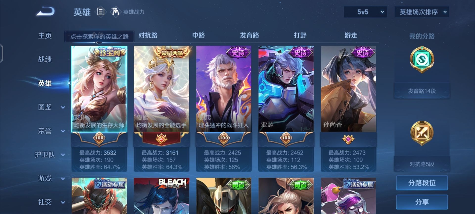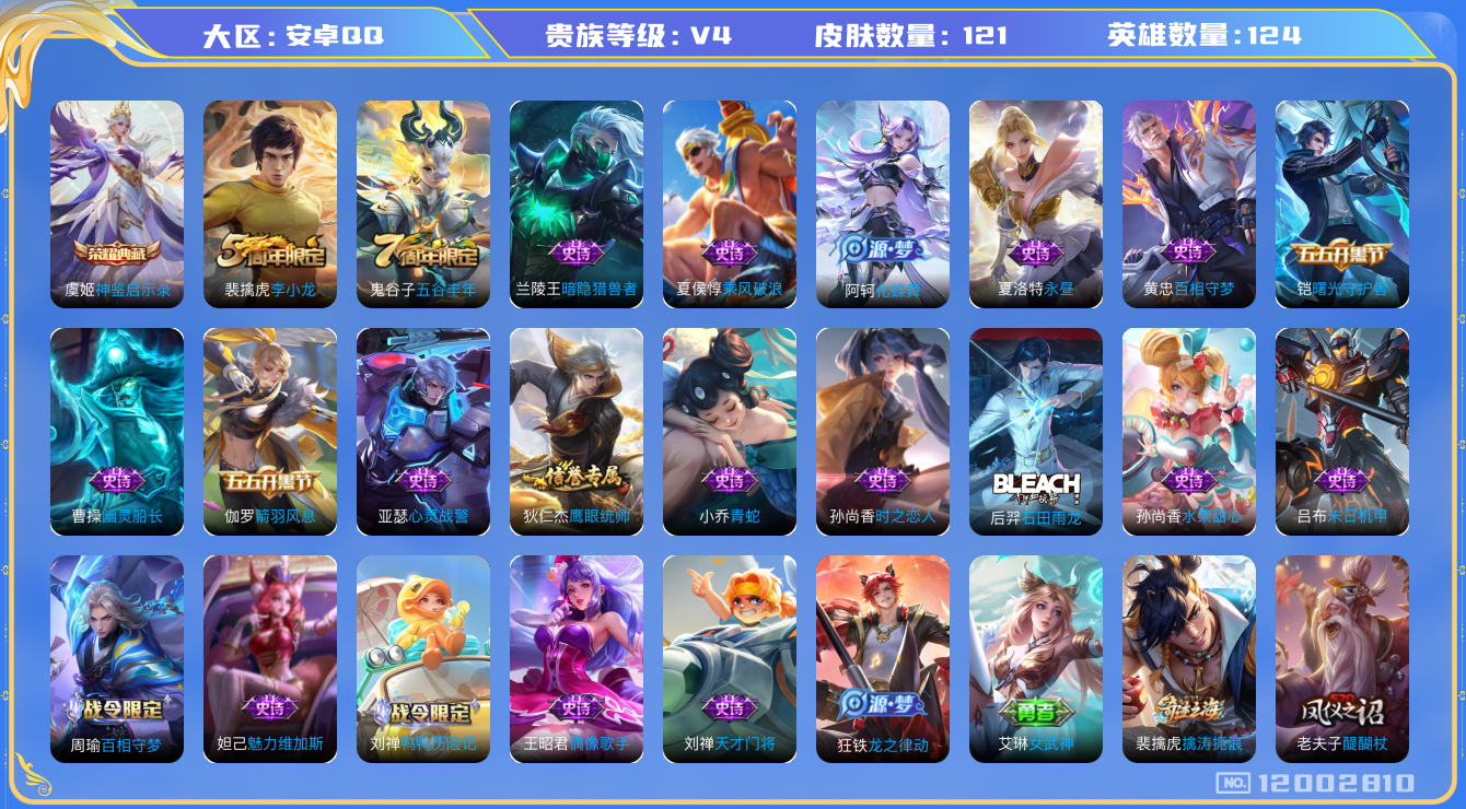 - [12030567]V8 1典藏 2珍品传说 14传说 125英雄 252皮肤 可修改实名 优质装备:弑枪猎影(韩信典藏),朽木白哉,黑崎一护,末日机甲-孙尚香(绿蚂蚱),地狱火,超时空战士-狄仁杰,山海·炽霜斩(李信年限),涂山容容 传说皮:云诺千山,幻光神枪 珍宝阁皮:胡桃夹子,女武神 限定皮:愿照·九州拓(澜年限),鸣野蒿,至尊宝,凤求凰(白切鸡),梅西,武陵仙君(小桃花),飞衡(韩信年限),诗剑行,怒海麟威,冰锋战神,逐梦之影,永曜之星,辉光之辰,大圣娶亲,美猴王 史诗皮:鸭鸭历险记-刘禅,星界战将,龙之律动,石田雨龙,茶境仙,怒海争锋,战舞者,蔬乡物语(鲁班七号),百相守梦-黄忠,紫霞仙子,白龙吟,黄金分割率,千年之狐,江河有灵,末日机甲-莱西奥,魅语,百解令(蒙犽),蒙恬荣光圣徽,偶像歌手,晚萤,电玩·爆裂旋风,龙骑士(小龙虾),末日机甲-吕布,猫狗日记-孙策,乱世虎臣,节奏热浪,女仆咖啡,摇滚巨星,水果甜心,绅士熊喵,天才门将,星夜王子,功夫厨神,德古拉伯爵,暗隐猎兽者,幽灵船长,鬼剑武藏,心灵战警,缤纷独角兽,乘风破浪,逐浪之夏,月团寄思,水晶猎龙者,曙光守护者,箭羽风息,金属风暴,原初追逐者,圣诞狂欢,圣诞恋歌,鹰眼统帅,暗夜贵公子,魅力维加斯,未来纪元-赵云