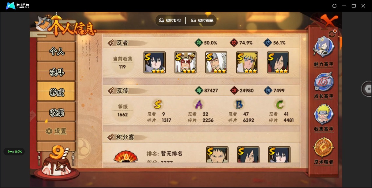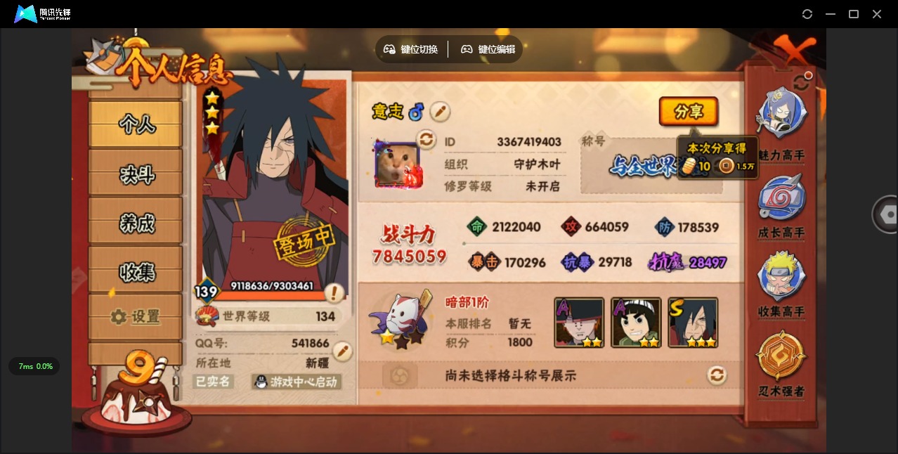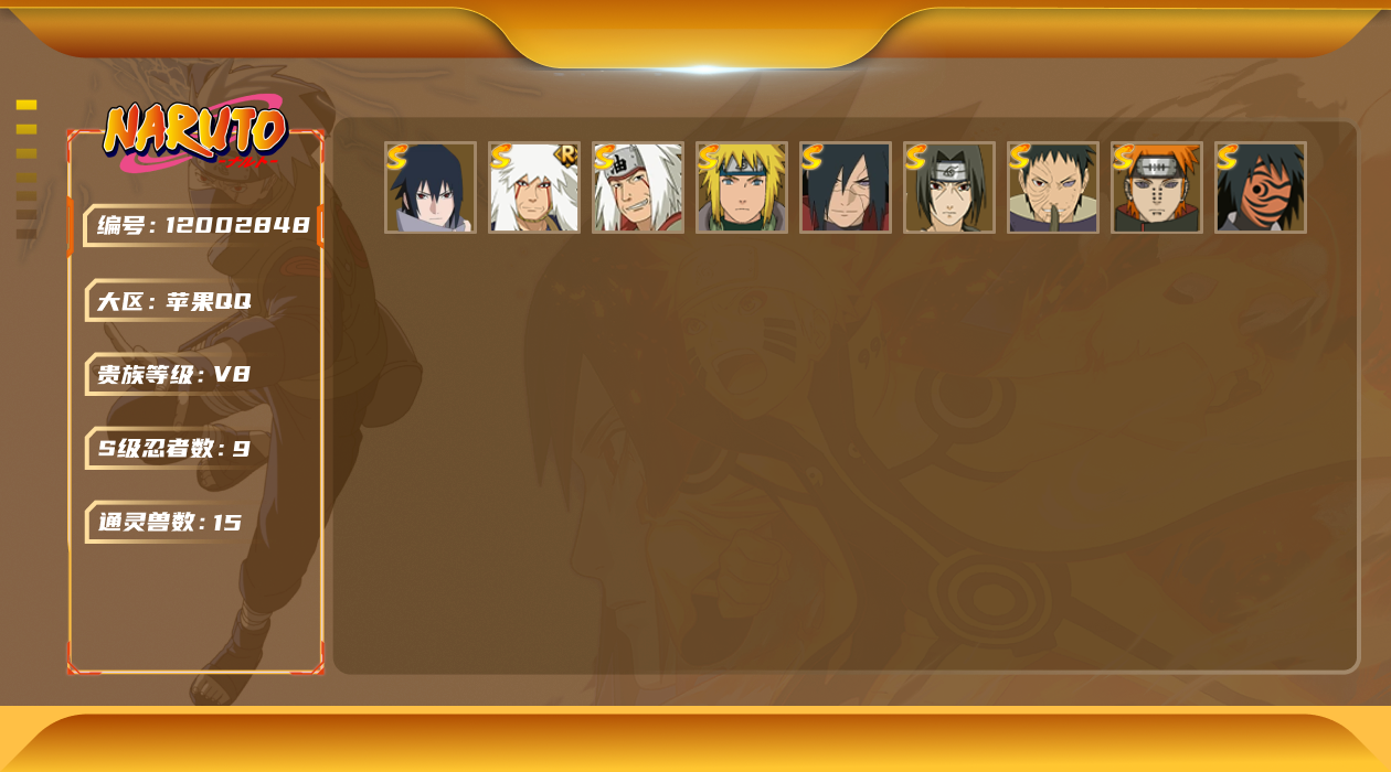 [12002848]V8 9S忍 22A忍 15通灵 784.5W战力 可二次 可修改实名 优质装备:宇智波带土 「忍界大战」,神秘面具男 「红夜之刃」,宇智波佐助「永恒万花筒」,宇智波斑「秽土转生·解」,自来也 「传说中的三忍」 S级忍者:自来也 「舞之豪杰」,宇智波鼬 「须佐能乎」,佩恩「天道」,波风水门