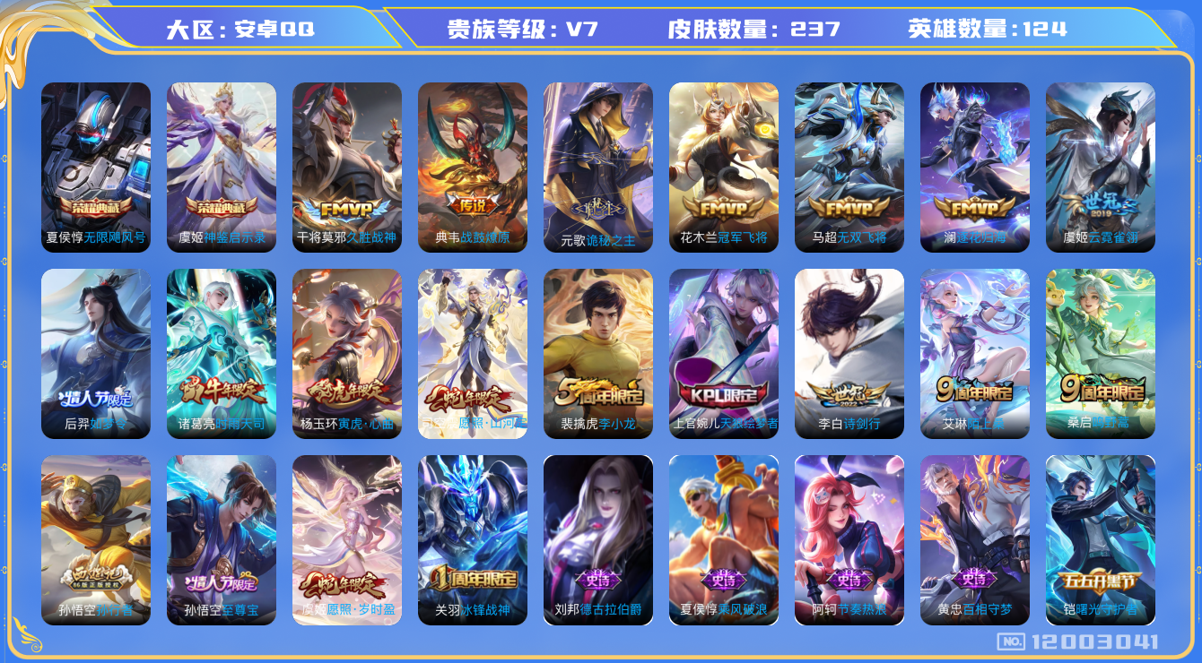 [12003041]V7 2典藏 12传说 124英雄 237皮肤 可修改实名 优质装备:无限飓风号(高达),神鉴启示录,冠军飞将,久胜战神,云霓雀翎,无双飞将,澜逐花归海,诡秘之主,涂山容容 传说皮:典韦战鼓燎原 珍宝阁皮:蔷薇恋人,玩趣恶龙 限定皮:愿照·岁时盈(虞姬年限),愿照·山河定(司空震年限),陌上桑,鸣野蒿,至尊宝,时雨天司(水龙头),诗剑行,冰锋战神,天狼绘梦者,李小龙,如梦令-后羿,孙行者,寅虎·心曲(虎婆) 史诗皮:鸭鸭历险记-刘禅,器灵·浮梦炉,灵蛊蚀心,星界战将,谪仙醉月,龙之律动,石田雨龙,百相守梦-周瑜,茶境仙,破空之剑,百相守梦-百里守约,百相守梦-黄忠,紫霞仙子,特工魅影,千年之狐,偶像歌手,末日机甲-吕布,猫狗日记-孙策,乱世虎臣,节奏热浪,修罗,女仆咖啡,摇滚巨星,水果甜心,绅士熊喵,功夫厨神,德古拉伯爵,暗隐猎兽者,幽灵船长,鬼剑武藏,心灵战警,乐园奇幻夜,天秀·启明,舞动绿茵,地狱岩魂,缤纷独角兽,乘风破浪,逐浪之夏,水晶猎龙者,曙光守护者,箭羽风息,圣诞狂欢,圣诞恋歌,鹰眼统帅,暗夜贵公子,黎明之约,无心,未来纪元-赵云