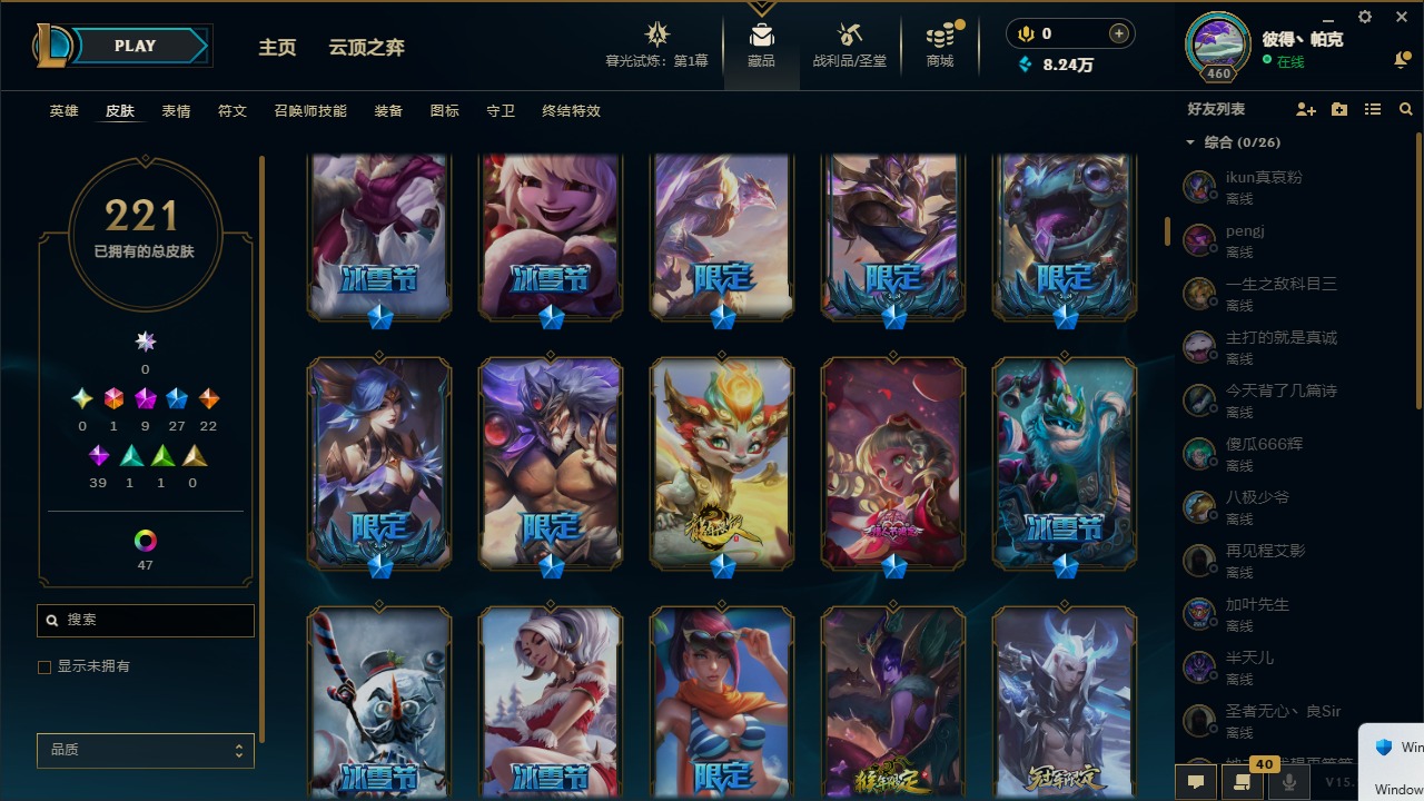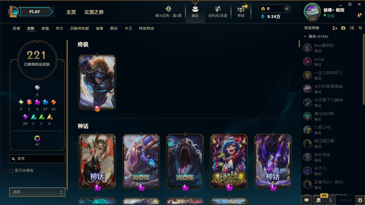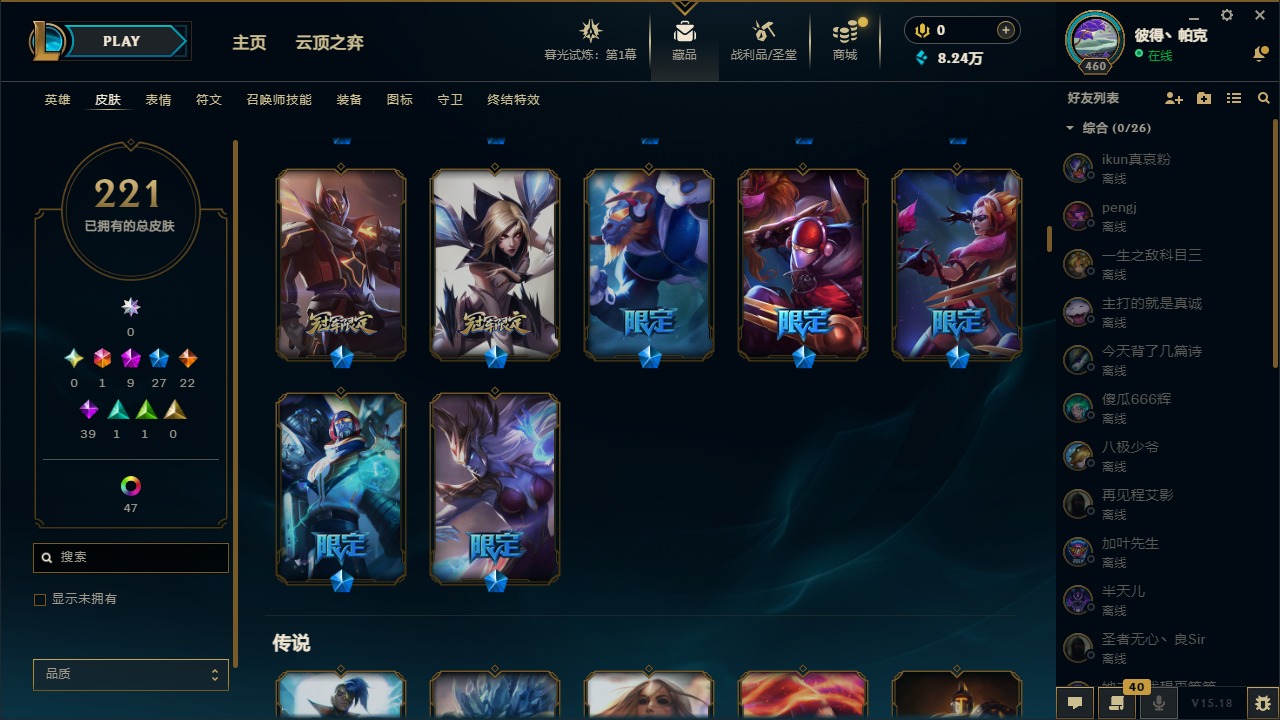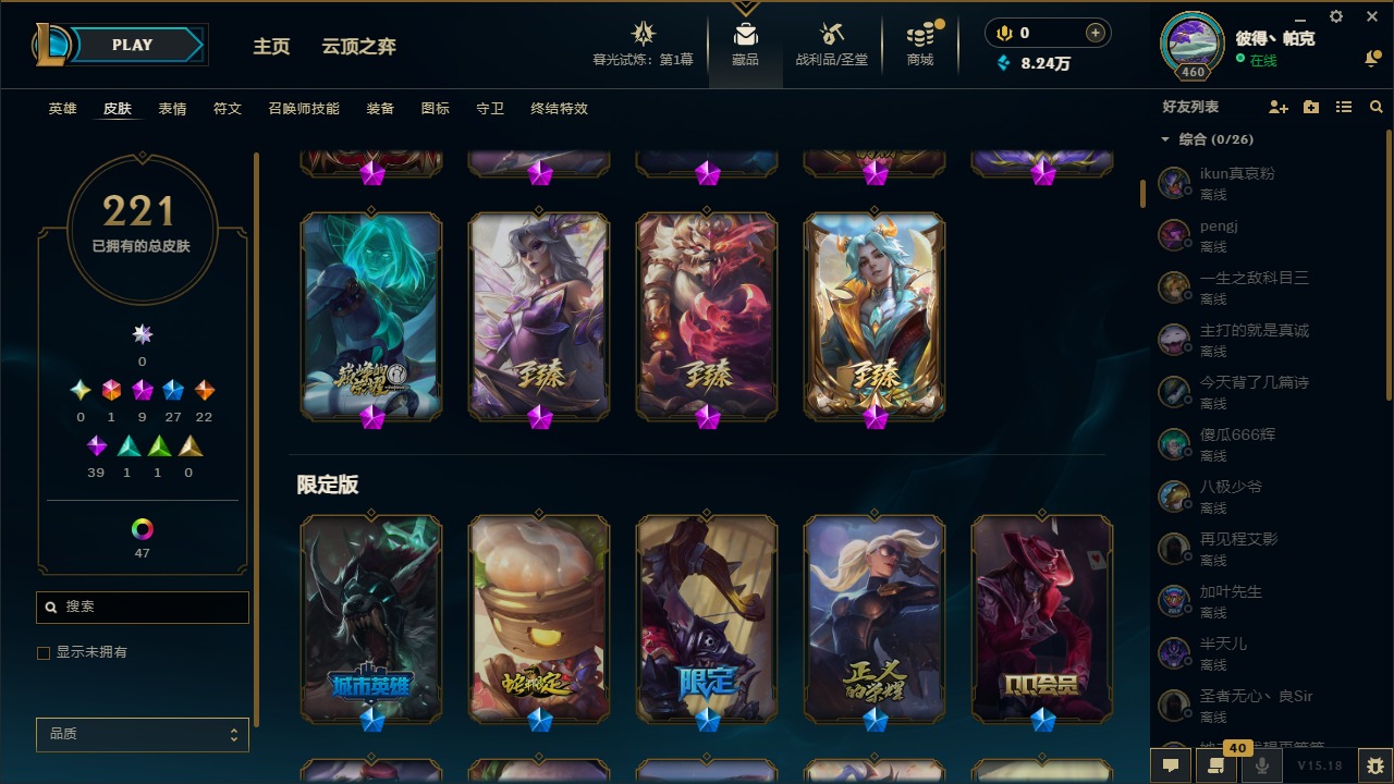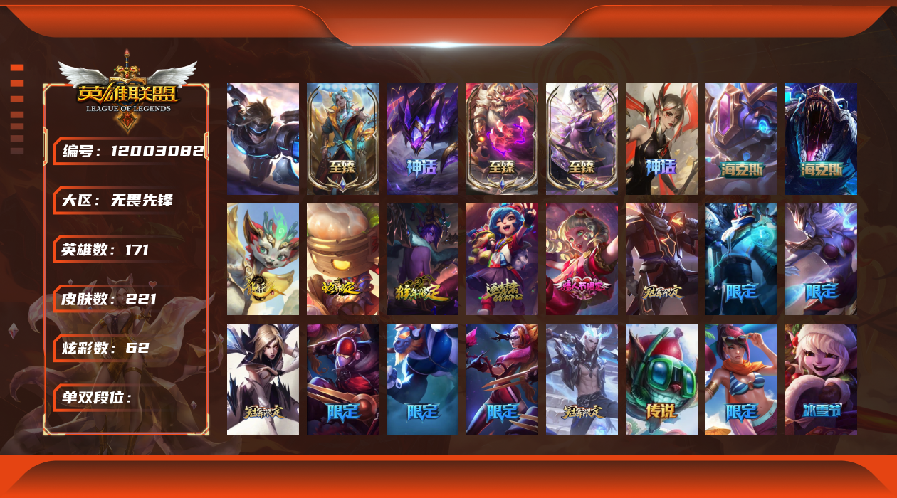 [12003082]1终极 9神话 27限定 22传说 39史诗 221皮肤 62炫彩 171英雄 可二次 可修改实名 优质装备:至臻 神龙尊者均衡之龙 沃利贝尔,源代码 乐芙兰,防爆天使 凯尔,暗影 沃里克,都铎王朝 图奇,红桃杰克 崔斯特,未来战士,至臻 花仙使者 卡特琳娜,弹幕天使 卡莎 炽天使·勇敢,无畏骑士 瑟庄妮 赤子初心,至臻 天龙之子 伊泽瑞尔,可爱可爱粉红红 布里茨,净雪之月 莫甘娜 冬虹,殿堂传奇 乐芙兰 登神,魔女 阿狸 饕餮,殿堂传奇 乐芙兰,水晶掠夺者 卡兹克,魔女 阿卡丽 虚荣 至臻:殿堂传奇 乐芙兰,水晶掠夺者 卡兹克 海克斯:海克斯 雷克顿,海克斯 克格莫 情人节限定:甜心宝贝 安妮 赛季限定皮:胜利凤凰 艾尼维亚,胜利剑圣 易,胜利女神 娑娜,胜利巨口 克格莫,胜利之王 泰达米尔 冠军限定系列:S3 SKT T1 劫,S3 SKT T1 婕拉,S5 SKT T1 阿利斯塔,S5 SKT T1 瑞兹,S6 SKT T1 球女,S8 IG 卡莎,S9 FPX 普朗克,S11 EDG 佛耶戈 冰雪节限定:魄罗骑士 瑟庄妮,圣诞精灵 崔丝塔娜,邪恶圣诞老人 维迦,雪默丁格,雪装 奈德丽 泳池派对:泳池派对 吉格斯,泳池派对 菲奥娜 年限:点心宝贝 阿木木,天龙之子 斯莫德,猴年 莫甘娜 周年:10周年 安妮