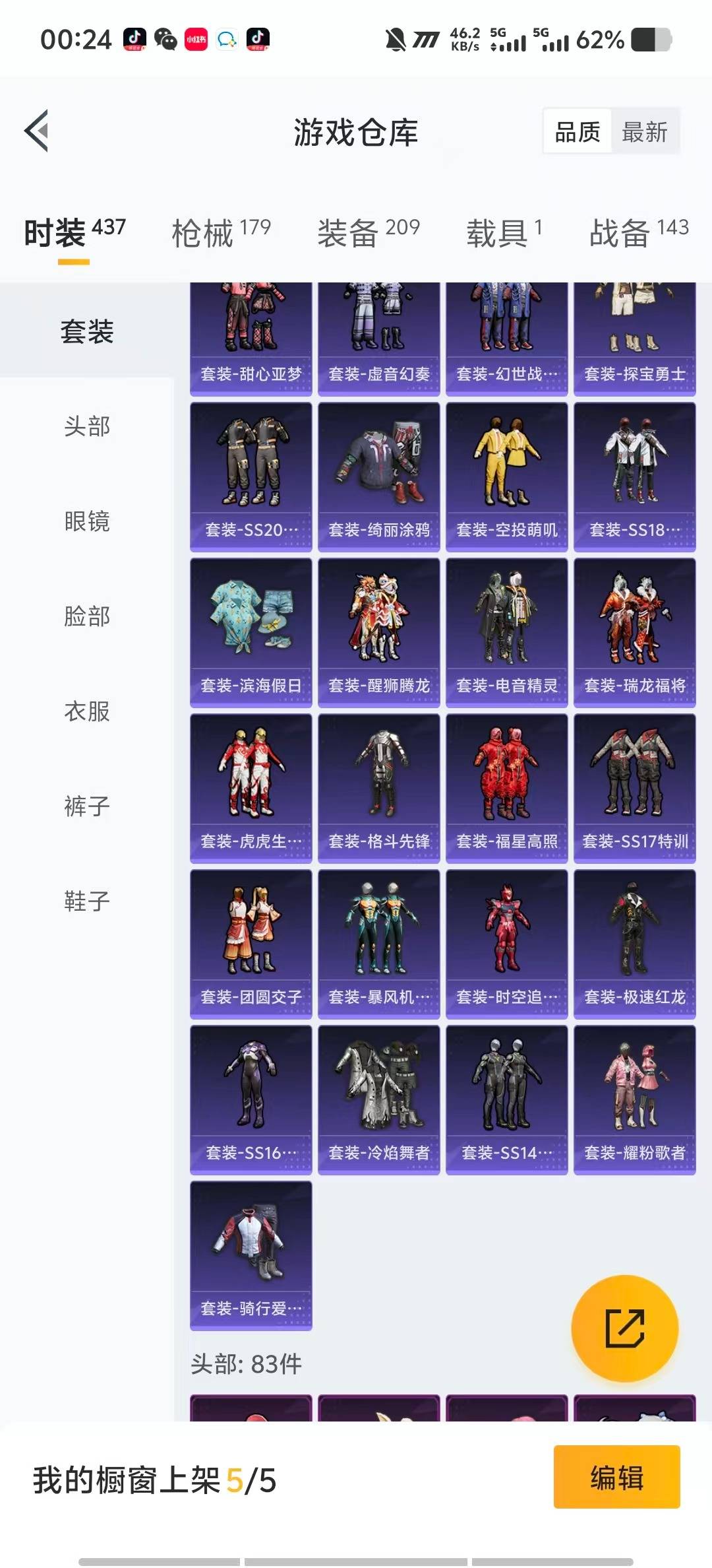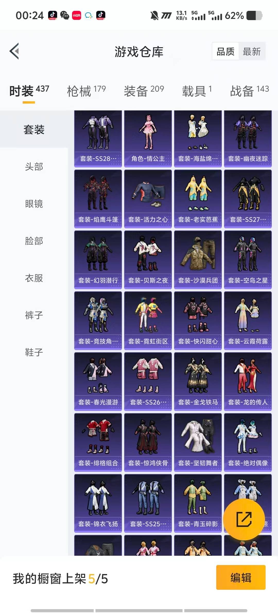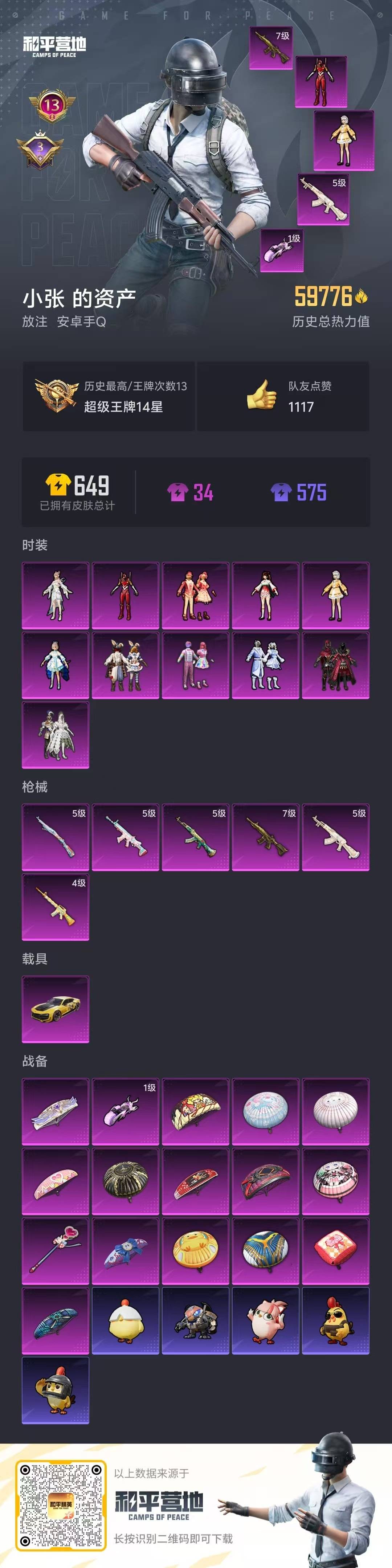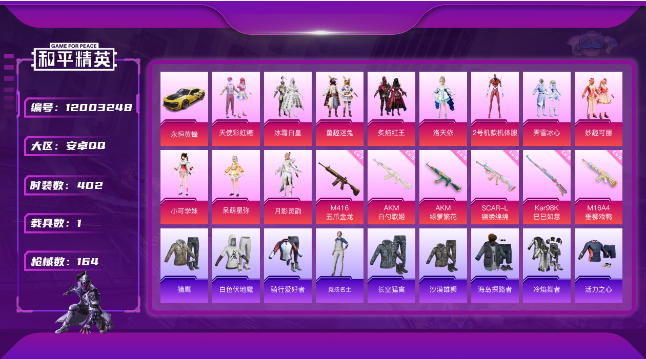 [12003248]11粉装 6特效枪 1载具 13印记 可二次 可修改实名 身法装备:2号机款机体服(红螳螂) 优质装备:2号机款机体服(红螳螂),永恒黄蜂,M416五爪金龙,天使彩虹糖,炙焰红王,冰霜白皇,童趣迷兔,洛天依,AKM白勺歌姬,M16A4垂柳戏鸭,AKM绿萝繁花,SCAR-L-锦绣绵绵,七级M416-五爪金龙,月影灵韵,Kar98K-巳巳如意 热门装扮:妙趣可丽,霁雪冰心,呆萌星弥,小可学妹 五级特效枪:五级Kar98K-巳巳如意,五级AKM-白勺歌姬,五级SCAR-L-锦绣绵绵,五级AKM-绿萝繁花 四级特效枪:四级M16A4-垂柳戏鸭 紫色装扮:SS23特训,SS30特训套装,SS31特训套装,SS21特训,照水倚天,田园牧歌,轻风白浪,和煦暖阳,SS22特训,冷焰舞者,坚韧舞者,幻世战舞者,萌趣咩咩,暖心熊熊,灵幻魔术师,娇憨猪猪,时空追击者,暴风机械师,SS16特训,电音精灵,瑞龙福将,团圆交子,醒狮腾龙,SS17特训,暖风夏荷,SS14特训,微雨春柳,SS20特训,竞技角斗士,香草威化,甜心亚梦,虚音幻奏,猎梦纪元,暖心橘喵,夏雨游龙,SS18特训,飞行日记,骑行爱好者,鹤鸣,麻辣教官,龙的传人,龟仙人,龙魂突击队,香桃花海,霓虹街区,长空猛禽,涂山之恋,滨海假日,滨海厨神,牛气冲天,牛气满满,海岛探路者,探宝勇士,活力之心,极速红龙,柠萌假日,格斗先锋,沙漠兵团,沙漠雄狮,绮丽涂鸦,荣耀,荧惑魅影,虎虎生威吉莉,空投萌叽,猎鹰,空岛之星,白熊同盟,白色伏地魔,福星高照,SS29特训,SS28特训,玉兔迎春,竞技名士,惊鸿侠骨,甜梦熊熊,神气柴柴,懵萌河马,SS24特训(SS24特训套装),绚紫流光,萤火魅影(套装-荧惑魅影),SS25特训,绝对偶像,金戈铁马,锦衣飞扬,SS27特训,焰鹰斗篷,幻羽潜行,幽夜迷踪,情公主,云霞荷露,SS26特训,春光漫游,快闪甜心,贝斯之夜,银河圣歌,纯白誓言,暗夜契约,耀粉歌者,SS32特训服(SS32特训套装),青玉碎影,绯格组合,萌黄之夏,恋语绒绒,光之冒险 优质战备:圣堂之誓降落伞,超新星飞行器,星之彼岸降落伞,彩虹甜喵降落伞,妙趣可丽降落伞,环太平洋降落伞,垂柳戏鸭降落伞,灵感创作师降落伞,歌者泠鸢降落伞,白勺歌姬降落伞,暗夜鎏金降落伞,飒粉甜心降落伞,甜心宝贝降落伞,童趣迷兔降落伞,飞行器-童趣迷兔,暗夜玫瑰