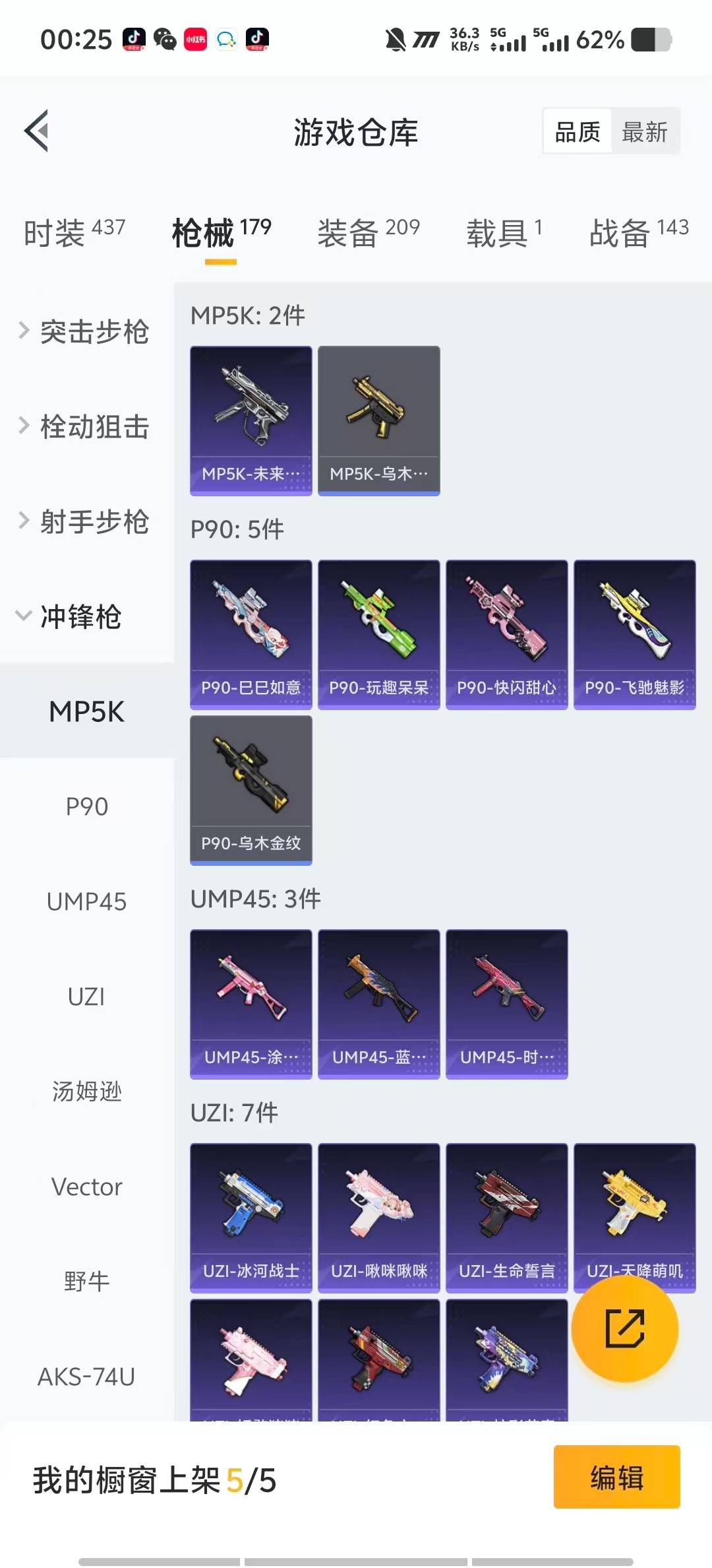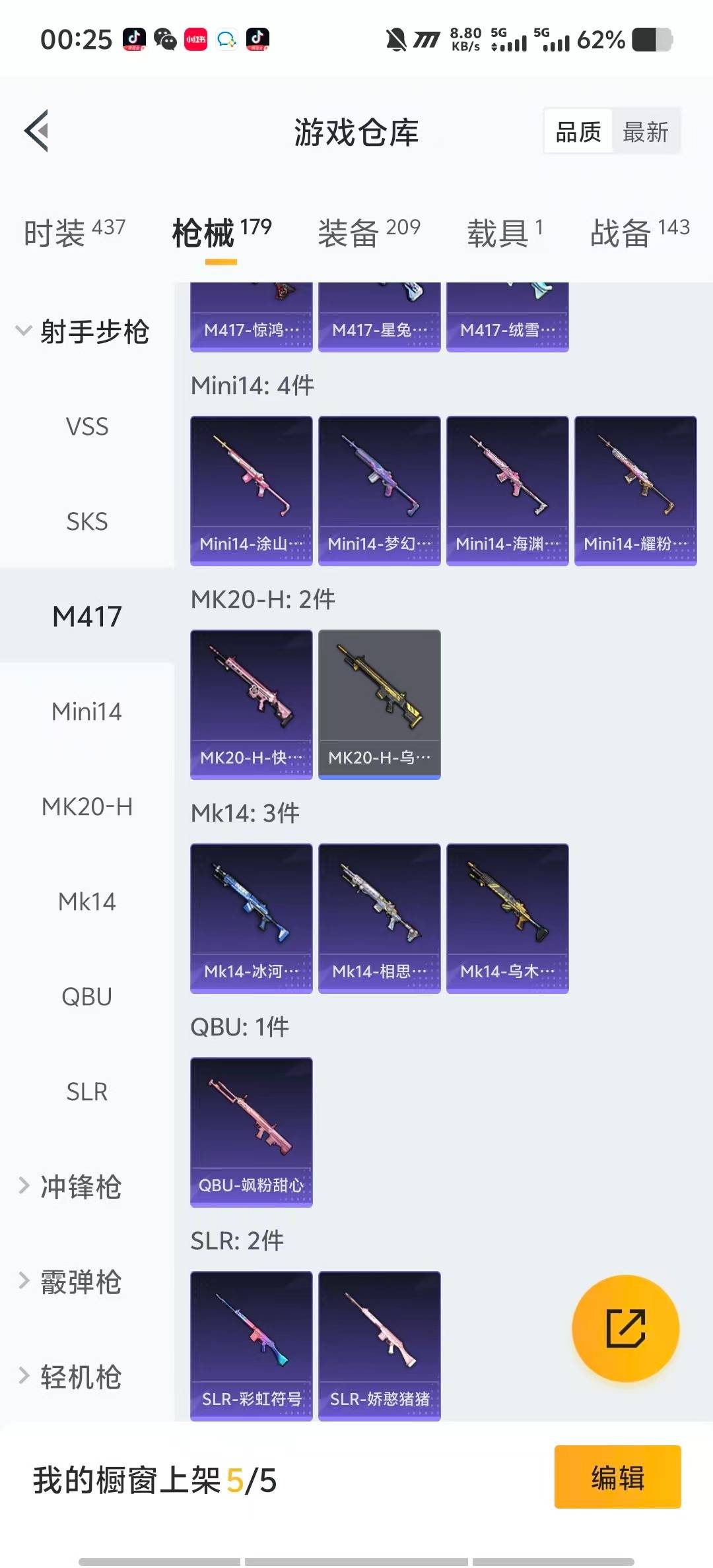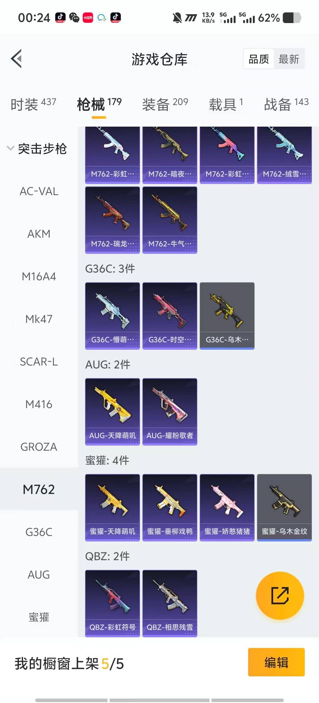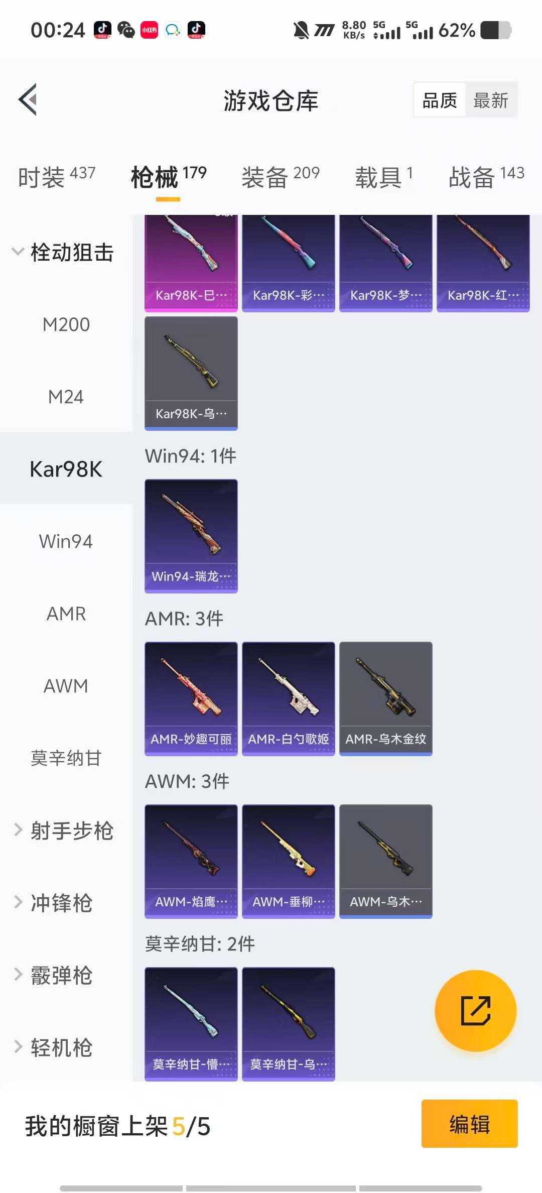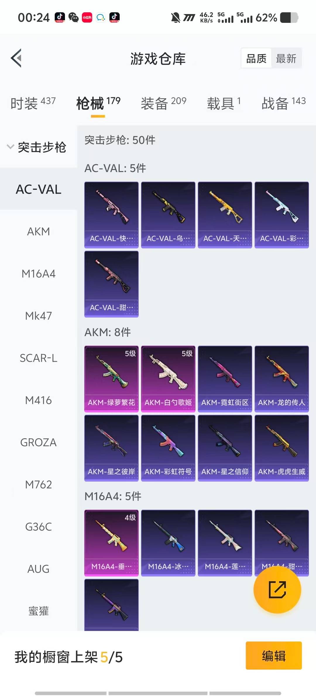 AKM-白勺歌姬,AKM-绿萝繁花,M16A4-垂柳戏鸭,SCAR-L-锦绣绵绵,M416-五爪金龙,Kar98K-巳巳如意