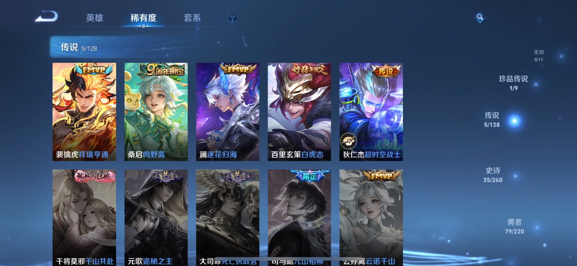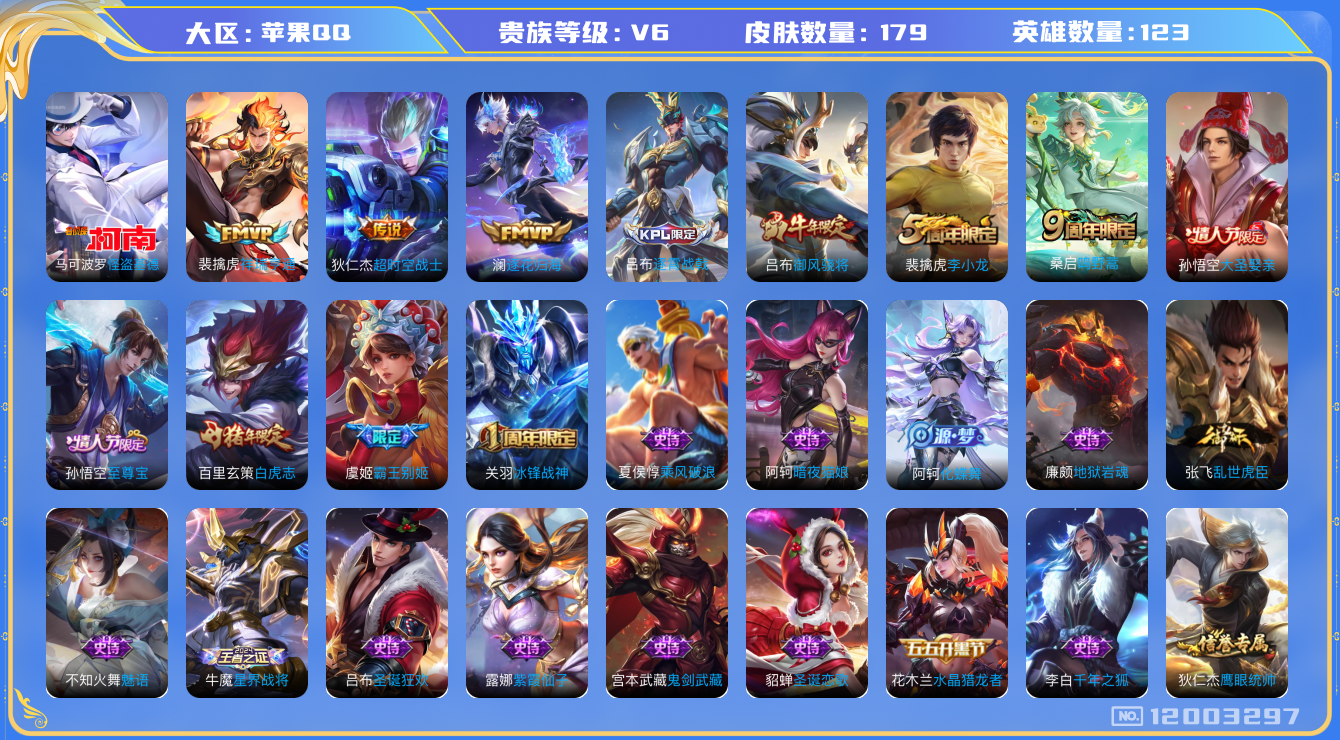 [12003297]V6 1珍品传说 5传说 123英雄 179皮肤 可修改实名 优质装备:怪盗基德,超时空战士-狄仁杰,澜逐花归海 传说皮:祥瑞亨通 珍宝阁皮:蔷薇恋人 限定皮:逐霄战戟,鸣野蒿,至尊宝,白虎志(电光耗子),冰锋战神,御风骁将(吕布年限),李小龙,霸王别姬-虞姬,大圣娶亲 史诗皮:化蝶舞,星界战将,龙之律动,紫霞仙子,白龙吟,千年之狐,魅语,偶像歌手,晚萤,暗夜猫娘,乱世虎臣,修罗,功夫厨神,鬼剑武藏,地狱岩魂,乘风破浪,水晶猎龙者,金属风暴,圣诞狂欢,圣诞恋歌,鹰眼统帅,黎明之约