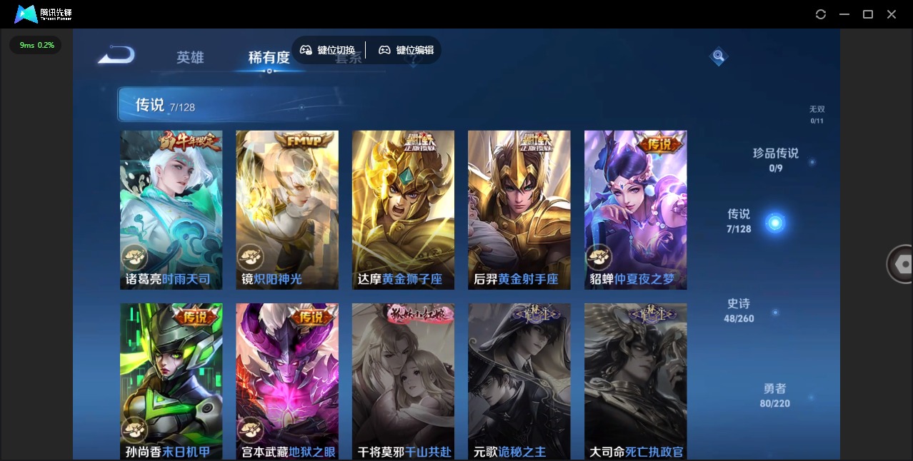 - [11523257]V6 1典藏 1珍品传说 5传说 124英雄 164皮肤 可修改实名 优质装备:最初的交响(伽罗典藏),冠军飞将 珍品传说:时之奇旅-孙策 传说皮:云诺千山,幻光神枪 珍宝阁皮:蔷薇恋人,玩趣恶龙 限定皮:愿照·岁时盈(虞姬年限),鸣野蒿,高山流水,五谷丰年,李小龙,山海·玄木吟(马可年限) 史诗皮:化蝶舞,龙之律动,石田雨龙,茶境仙,破空之剑,百相守梦-百里守约,百相守梦-黄忠,紫霞仙子,特工魅影,千年之狐,江河有灵,魅语,百解令(蒙犽),青蛇,偶像歌手,电玩·爆裂旋风,百相守梦(刘备),猫狗日记-孙策,节奏热浪,女仆咖啡,摇滚巨星,水果甜心,天才门将,星夜王子,暗隐猎兽者,幽灵船长,鬼剑武藏,心灵战警,舞动绿茵,地狱岩魂,缤纷独角兽,乘风破浪,逐浪之夏,水晶猎龙者,曙光守护者,箭羽风息,金属风暴,圣诞狂欢,圣诞恋歌,鹰眼统帅