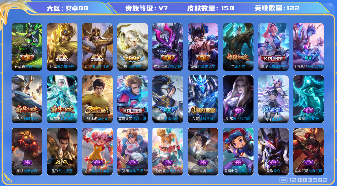 [12003592]V7 7传说 122英雄 158皮肤 可修改实名 优质装备:黄金狮子座,黄金射手座,炽阳神光,末日机甲-孙尚香(绿蚂蚱),仲夏夜之梦(大飞蛾),地狱之眼 珍宝阁皮:蔷薇恋人,玩趣恶龙 限定皮:傲雪梅枪,时雨天司(水龙头),青龙志(铠年限),冰锋战神,御风骁将(吕布年限),逐梦之星,天狼溯光者,李小龙,冰霜恋舞曲 史诗皮:化蝶舞,电玩小子(小书包),特工魅影,永昼,魅语,猫狗日记-孙策,乱世虎臣,修罗,女仆咖啡,水果甜心,功夫厨神,德古拉伯爵,暗隐猎兽者,幽灵船长,鬼剑武藏,心灵战警,天秀·启明,地狱岩魂,纤云弄巧,缤纷独角兽,逐浪之夏,水晶猎龙者,热力回旋,唤灵魅影,原初追逐者,圣诞恋歌,鹰眼统帅,魅力维加斯,黎明之约,无心,未来纪元-赵云