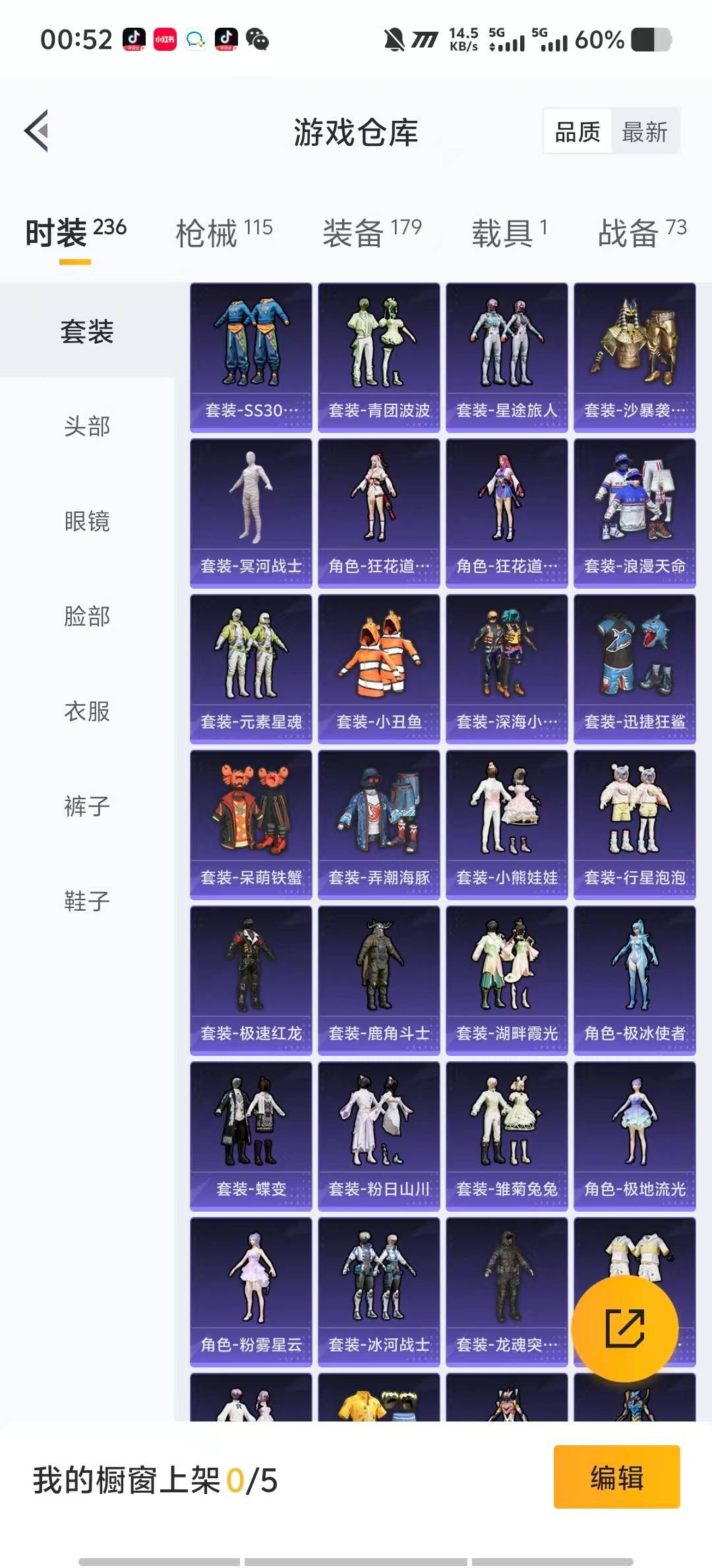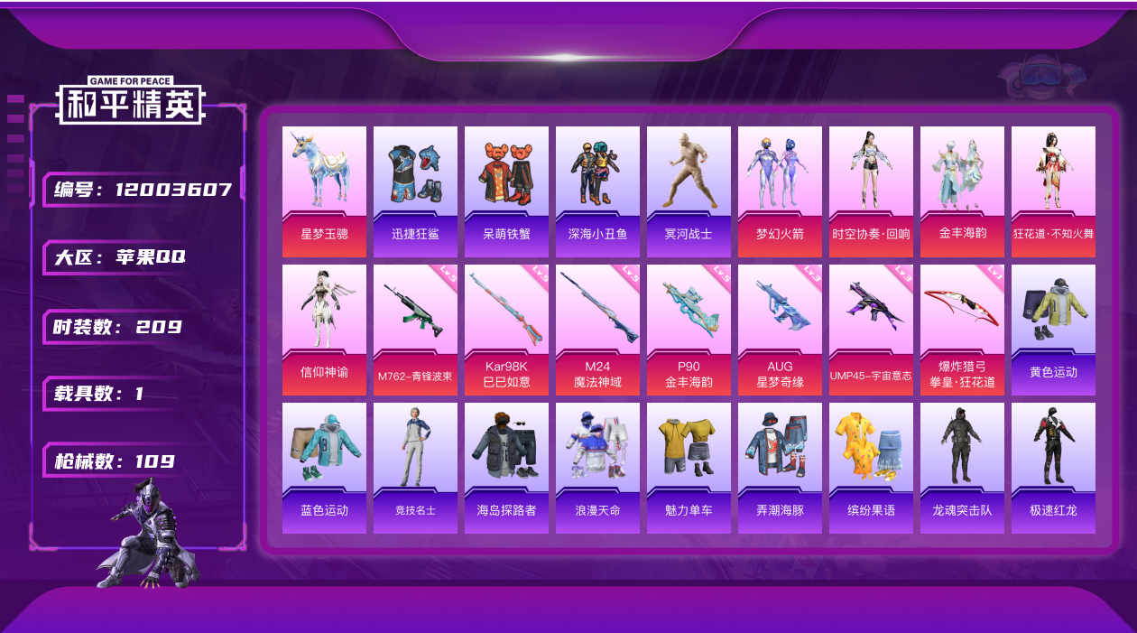 [12003607]5粉装 7特效枪 1载具 3印记 可二次 可修改实名 身法装备:冥河战士(老木乃伊),8号机(新粉螳螂),Mark.06(新蓝螳螂) 优质装备:冥河战士(老木乃伊),木乃伊套装(老)(冥河战士),星梦玉骢,梦幻火箭(新101)(新火箭少女101粉色套装),AUG星梦奇缘,M24-魔法神域,P90-金丰海韵,UMP45-宇宙意志,M762-青锋波束,时空协奏·回响,狂花道·不知火舞,信仰神谕,Kar98K-巳巳如意 热门装扮:金丰海韵,迅捷狂鲨,呆萌铁蟹,深海小丑鱼 稀有枪皮:爆炸猎弓-拳皇·狂花道 五级特效枪:五级M762-青锋波束,五级M24-魔法神域,五级P90-金丰海韵,五级Kar98K-巳巳如意 三级特效枪:三级AUG-星梦奇缘,三级UMP45-宇宙意志 一级特效枪:一级爆炸猎弓-拳皇·狂花道 紫色装扮:SS30特训套装,SS31特训套装,魅力单车,黄色运动,冰河战士,龙魂突击队,蝶变,香桃花海,海岛探路者,极速红龙,缤纷果语,蓝色运动,萝兰蝴蝶,SS29特训,极冰使者,鹿角斗士,行星泡泡,小熊娃娃,狂花道·娜可露露,狂花道·雅典娜,星途旅人,雏菊兔兔,粉日山川,热情海星,曼妙人鱼,SS28特训,粉雾星云,湖畔霞光,极地流光,霓彩节奏,8号机(新粉螳螂),Mark.06(新蓝螳螂),鱼渊荷华,燕燕于飞,镭金极速,巳巳如意,智谋强哥,绿洲幻境,青团波波,糖糖葫芦,棉花软糖,竞技名士,绒宝小鹅,裁决天象,黑曜寓言,俏兔智灵,纯真浪花,浪漫天命,小丑鱼,大橘大利,SS32特训服(SS32特训套装),萌萌史莱姆,弄潮海豚,沙暴袭击者 优质战备:星梦奇缘降落伞,龙翔九天飞行器,星梦奇缘飞行器,拳皇·狂花道降落伞,绿洲幻境降落伞,BEARBRICK降落伞,行星泡泡降落伞,深渊漩涡飞行器,宇宙意志降落伞,金丰海韵降落伞,镜域双华降落伞,沙丘之主天马飞行器,信仰神谕降落伞,梦幻火箭降落伞,梦幻火箭飞行器
