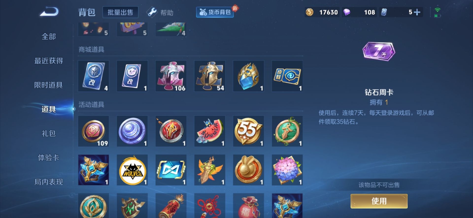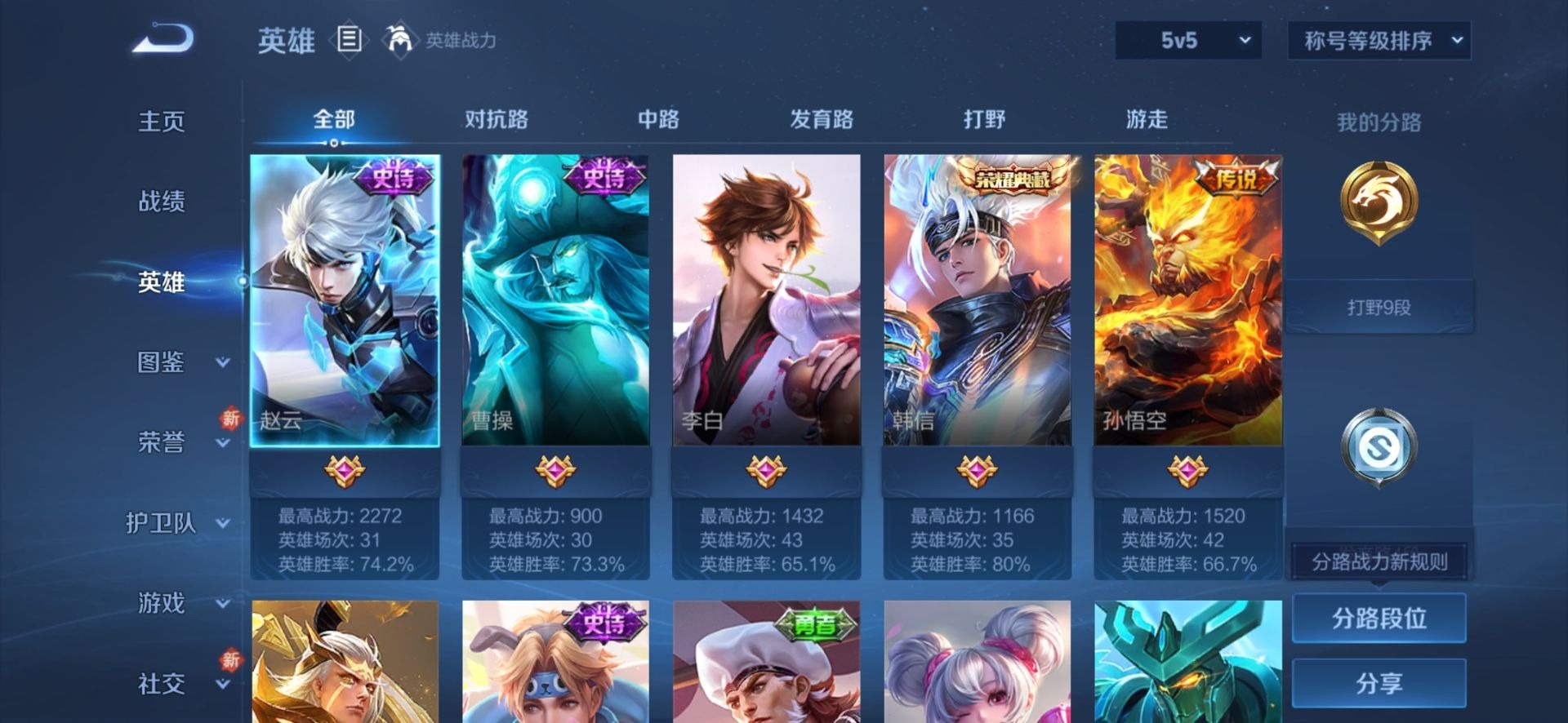 - [36928]英雄数: 122 勇者皮肤数: 78 史诗皮肤数: 39 传说皮肤数: 5 稀有英雄: 韩信,夏洛特,艾琳,橘右京,娜可露露,不知火舞,赵云,金蝉,桑启,戈娅 传说皮肤: 黄金射手座,绛天战甲 当前段位: 钻石 限定皮肤: 遇见飞天,梁祝,引擎之心 内测皮肤: 蔷薇恋人 史诗皮肤: 暗夜猫娘,白蛇,魅语,无限星赏官,末日机甲-吕布,冰冠公主,逐浪之夏,时之恋人-孙尚香,紫霞仙子,箭羽风息,节奏热浪,女仆咖啡,水果甜心,功夫厨神,德古拉伯爵,鬼剑武藏,地狱岩魂,乘风破浪,水晶猎龙者,金属风暴,圣诞狂欢,圣诞恋歌,热浪节奏(弃用),特工魅影,魅力维加斯(废弃),赏金猎手,未来纪元(赵云) 赛季/战令皮肤: 重明,穷奇,御狮,御霄,朔风刀,混沌棋,疑决卦,醍醐杖,原初探秘者,万华元夜,驱傩正仪,海盐诗旅 普通皮肤: 万事如意,五福同心,归虚梦演(曜),海滩派对,海滩丽影,魔术师,皇家上将,沉稳之力,掌控之力,守护之力,敏锐之力,化身博士,乓乓大师,黄金武士,次元突破,天使之翼,功夫老勺,哥特玫瑰,鲨炮海盗猫,教廷特使,进击墨子号,阴阳师,汉昭烈帝,兔女郎,死亡骑士,少女阿狸,忍·炎影,丁香结,黑桃队长,奇妙博物学,爱心护理,白色死神,冰雪圆舞曲,未来纪元(赵云),拳王,科学大爆炸,如懿,街头霸王,幻想奇妙夜,幽兰居士,次元傲视,幻乐之宴,虹云星官,修竹墨客,灼热之刃,荷鲁斯之眼,剑舞者,花见巫女,龙域领主,第七人偶,埃及法老,星航指挥官,激情绿茵,精灵王,海之征途,午夜歌剧院,花间舞,绝影神枪,特种部队,范海辛,绯红之刃,西部大镖客(孙悟空),帝国元帅,精灵公主,华尔街大亨,碧珀绯影,契约魔法,蔚蓝守将,潮玩探月行