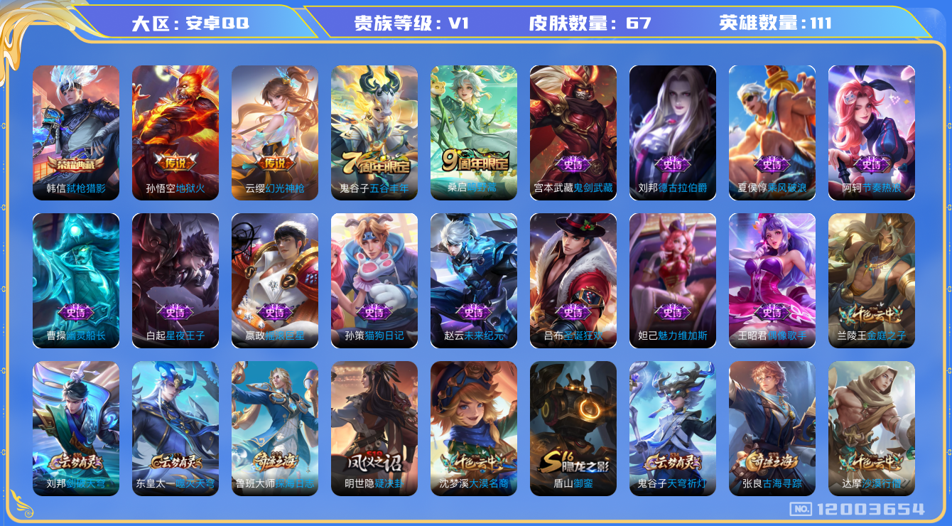 [12003654]V1 1典藏 3传说 111英雄 67皮肤 可修改实名 优质装备:弑枪猎影(韩信典藏),地狱火 传说皮:幻光神枪 限定皮:鸣野蒿,五谷丰年 史诗皮:偶像歌手,猫狗日记-孙策,节奏热浪,摇滚巨星,星夜王子,德古拉伯爵,幽灵船长,鬼剑武藏,乘风破浪,圣诞狂欢,魅力维加斯,未来纪元-赵云