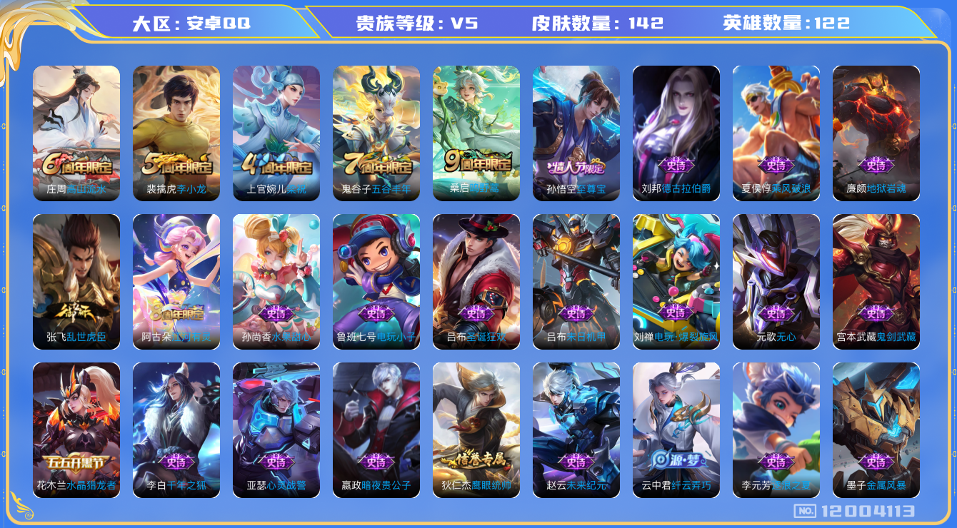- PX_2084093-实名: 可修改 贵族等级: V6 英雄数: 122 皮肤数: 98 传说皮: 绛天战甲,淬星耀世,音你闪耀,琥珀纪元铠 限定皮: 遇见飞天,五谷丰年,鸣野蒿