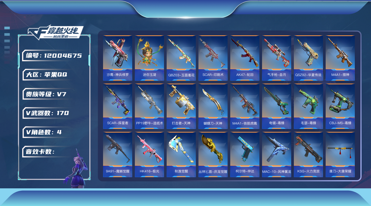 [12004675]可二次 可修改实名 V7 10王者武器 170英雄武器 4英雄角色 309万化 专家S 武器:王者之影,王者之心,王者之势,王者之神,王者之烈,王者之蝶,M12S-雷霆王者,M200-幻神,M4A1-星象,TAC-晴舞,81式-光明之神,加特林-炼狱,王者之魂,王者之隐,M4A1-堕天神,M4A1-机械迷城,AK47-死神,AK47-无影,AK47-燎天净火,M4A1-死神,M4A1-雷神,M4A1-黑龙,M4A1-黑骑士,AK47-木兰,M4A1-游骑兵,巴雷特-极光,巴雷特-毁灭,QBZ03-死神,QBZ03-金色蔷薇,AWM-天使,QBB95-极光,M12S-雷霆,双持斯泰尔-天使,亡命之徒-幻兽,M4A1-猎神,M4A1-破空冰刃,M4A1-赛博雷神,M4A1-运输船,M4A1-海骑士,巴雷特-冬灭,AK47-樱斗士-超觉,AK47-雷麒麟,AK47-猩红传说,AK47-华夏传说,AK47-沙漠郡主-超觉,AK47-血武士,AK47-幸运日,M4A1-龙血,M4A1-玫瑰精灵,M200-心动次元觉醒,09式狙-天神,98K-血月,M200-心动次元,AK12-天启,SCAR-探星者,AN94-四凶觉醒,9A91-天神,QBZ03-湮灭,AWM-天龙,加特林-堡垒,KSG-火力竞放,PP19野牛-造纸术,地狱火,地狱烈炎,打击者-天神,AK47-破空冰刃,AK47-轮回,CBJ-MS-毒蜂,QCW05-变形金刚·大黄蜂,汤姆逊-烈龙,CZS2-血月,CZS2-心动次元觉醒,寒霜烈龙,加特林-星际战舰,SCAR-印刷术,QBZ03-玉面羞花,MK47-鼓龙,柯尔特-仲达,MK23-幻神,9A91-魔蜥觉醒,HK416-极光,丈八蛇矛,墨刃-幻神,沙鹰-冰锋觉醒,沙鹰-修罗,毛瑟-毒蜂,沙鹰-神兵修罗,气手枪-血月,MAC-10-风神翼龙,QSZ92-华夏传说,M4A1-铁胆虎魄,马来剑-毁灭,尼泊尔-冰锋觉醒,尼泊尔-火麒麟,手斧-机械迷城,王者之兽手雷,沙鹰-天神,CZ75-穷奇,唐刀-大唐荣耀,唐刀-华夏传说,麒麟刺,星芒,龙鳞-觉醒,神罚战斧,丛林匕首-庆龙觉醒,秋逸觉醒,屠龙,迷你玉凝,丛林匕首-火力竞放,斩魔刀,电锯-毒蜂,女皇利刃-铁胆虎魄,蝴蝶刀-天神,黑骑士闪光弹,黑骑士烟雾弹,黑骑士手雷,黑武士闪光弹,幻兽手雷,火麒麟闪光弹,烟雾弹-游骑兵