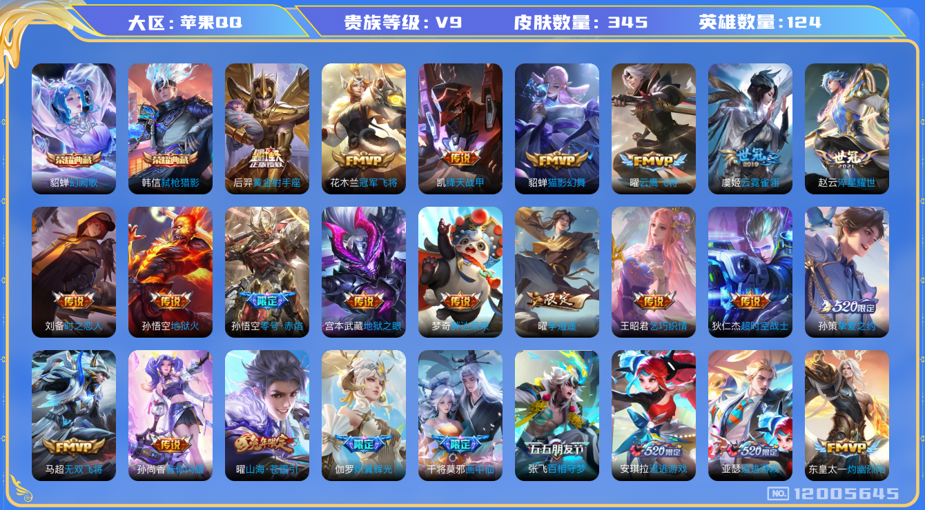 [12005645]【商品标题】:苹果Q-V9-永恒钻石V段位-124英雄-345皮肤-2典藏-0珍品无双-0无双-0珍品传说-37传说-98史诗