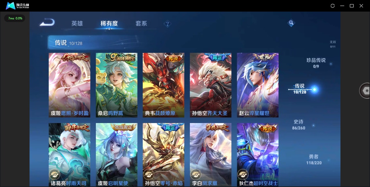 - PX_2080873-97 安卓QQ/至尊星耀/89皮肤/114英雄/0典藏/0珍品无双/0无双/0珍品传说/5传说/15史诗/7稀有英雄 【5 传说皮肤】黄金射手座 后羿,时之恋人 刘备,琥珀纪元 马超,幻光神枪 云缨,愿照·山河定 司空震, 【15 史诗皮肤】紫霞仙子 露娜,鬼剑武藏 宫本武藏,玉兔公主 公孙离,荣光圣徽 蒙恬,鹰眼统帅 狄仁杰,特工魅影 百里守约,猫狗日记 孙策,逐浪之夏 李