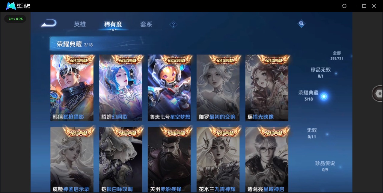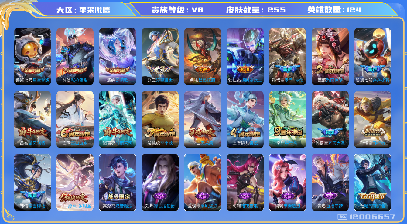 [12006657]V8 3典藏 10传说 124英雄 255皮肤 可修改实名 优质装备:星空梦想(太空人),幻阙歌(貂蝉典藏),弑枪猎影(韩信典藏),零号·赤焰,淬星耀世,超时空战士-狄仁杰,涂山容容 传说皮:典韦战鼓燎原 珍宝阁皮:万物之道,优雅恋人,蔷薇恋人,玩趣恶龙 限定皮:愿照·岁时盈(虞姬年限),鸣野蒿,凤求凰(白切鸡),傲雪梅枪,时雨天司(水龙头),高山流水,齐天大圣,游园惊梦,梁祝,御风骁将(吕布年限),李小龙,孙行者,乒乒小将 史诗皮:器灵·浮梦炉,星界战将,谪仙醉月,石田雨龙,茶境仙,破空之剑,琥珀纪元伽罗,蔬乡物语(鲁班七号),百相守梦-百里守约,百相守梦-黄忠,紫霞仙子,苍穹之光,特工魅影,千年之狐,江河有灵,匿光侦查者,高渐离燃音魔法,蒙恬荣光圣徽,冰冠公主,青蛇,偶像歌手,晚萤,百相守梦(刘备),暗夜猫娘,龙骑士(小龙虾),末日机甲-吕布,猫狗日记-孙策,乱世虎臣,节奏热浪,修罗,女仆咖啡,水果甜心,绅士熊喵,星夜王子,心灵骇客,功夫厨神,德古拉伯爵,暗隐猎兽者,幽灵船长,鬼剑武藏,乐园奇幻夜,天秀·启明,舞动绿茵,纤云弄巧,乘风破浪,逐浪之夏,水晶猎龙者,曙光守护者,热力回旋,唤灵魅影,金属风暴,原初追逐者,圣诞狂欢,圣诞恋歌,鹰眼统帅,魅力维加斯,黎明之约,未来纪元-赵云