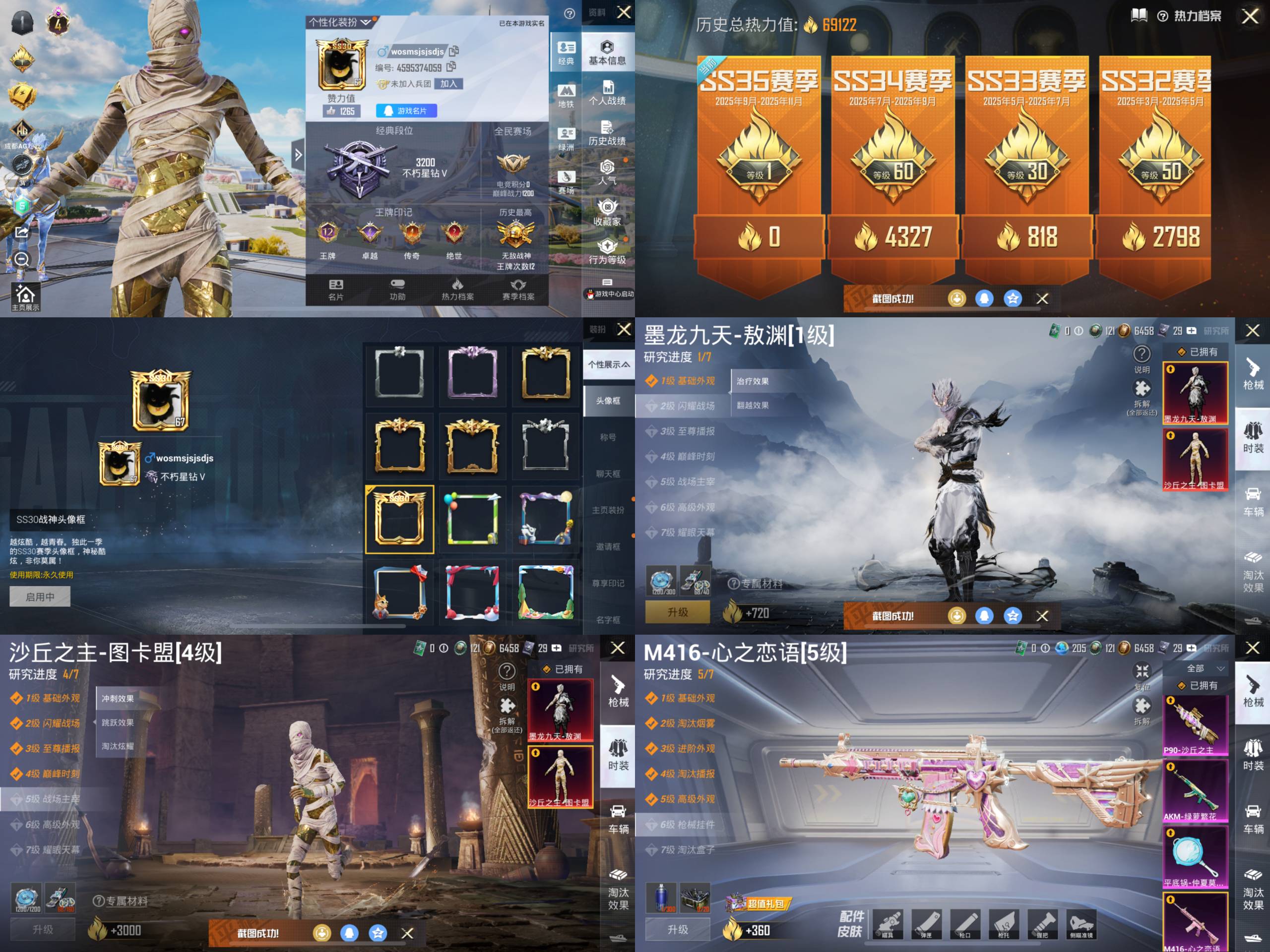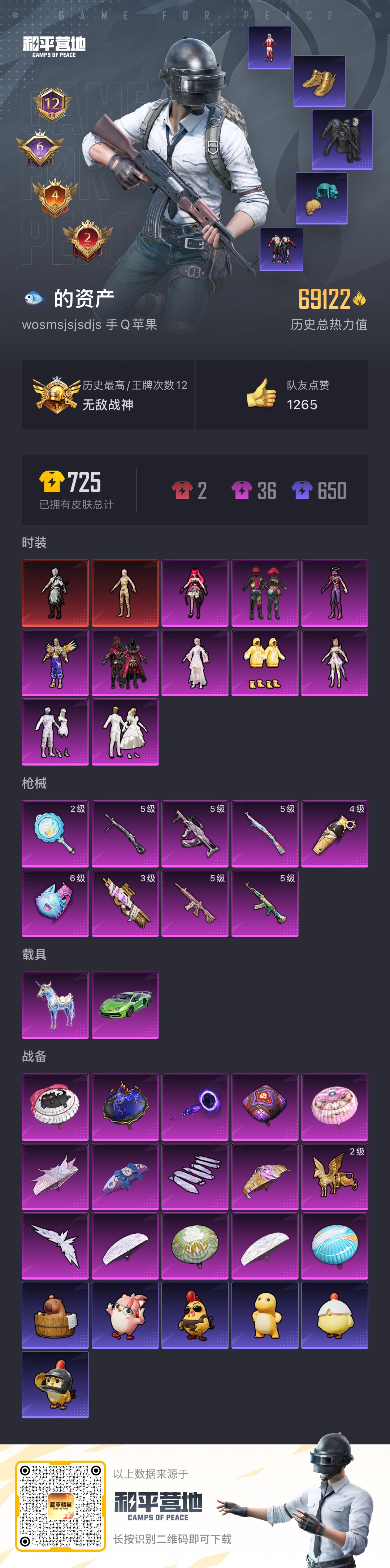 - [12204422]1粉装 5特效枪 1载具 8印记 可二次 可修改实名 优质装备:特斯拉Roadster(水滴蓝),苍蓝魅影,UMP45相思残雪(UMP45-相思残雪),AKM梦之光华,SCAR-L-锦绣绵绵,七级AKM-梦之光华,七级UMP45-相思残雪,Kar98K-巳巳如意 稀有枪皮:DP-28-豹影疾电 五级特效枪:五级Kar98K-巳巳如意,五级SCAR-L-锦绣绵绵 一级特效枪:一级DP-28-豹影疾电 紫色装扮:SS22特训,SS21特训,SS31特训套装,SS2特训,SS3特训,SS4特训,人气偶像,决胜时刻,冷焰舞者,刚毅裁决者,北国孤狼,SS30特训套装,SS33特训套装,SS20特训,青春冒险家,潮流游乐家,SS15特训,暗夜傀儡,SS16特训,银白舞王,SS13特训,星梦畅游,SS14特训,萌趣颜团子,特种颜团子,微雨春柳,暖风夏荷,飞驰魅影,音速流光,SS19特训,吉莉礼服,SS17特训,SS18特训,阳光火鸡,都市漫游者,都市魅力,酒红色名流,长空猛禽,霓虹街区,迎春赐吉,缤纷果语,耀眼新星,蓝彩潮人,蓝色守护者,蓝色运动,虎虎生威吉莉,街头潮人,飞行日记,魅力单车,鹤鸣,麻辣教官,黄色伏地魔,黄色名流,黄色运动,黑色伏地魔,龙的传人,龟仙人,冰河战士,龙魂突击队,蝶变,极速红龙,沙漠兵团,海岛探路者,海滨突袭者,深蓝色名流,幻影武者,坚韧舞者,夏日音浪,夜莺强袭者,完美偶像,帅气教官,幻世战舞者,怒火燎原,战地督导,战地菁英,湖蓝色名流,绮丽涂鸦,疯狂小兔子,白熊同盟,白色伏地魔,破晓战魂,破蛋小黄鸡,福星高照,空岛之星,空投萌叽,竞技勇士朋克,竞技达人朋克,红色运动,牛气冲天,灼焰舞者,炫蓝之夏,热血青春,燃烧卡路里,牛气满满,猛禽,镭射皇者,SS29特训,纯真浪花,热情海星,SS28特训,创世·追猎,鱼渊荷华,玉兔迎春,竞技名士,SS25特训,焰鹰斗篷,幻羽潜行,SS27特训,SS26特训,SS6特训,大橘大利,SS10特训,耀粉歌者,春日漫步,蓝冰羽,紫幽梦,SS32特训服(SS32特训套装),绯格组合,萌黄之夏,蜜桃派对,恋语绒绒,双彩圣灵 优质战备:星之彼岸降落伞,樱桃泡泡降落伞,飞行器-庄周梦蝶,四圣焕新降落伞,相思残雪降落伞,怪笑疯兔降落伞,洛神天依降落伞