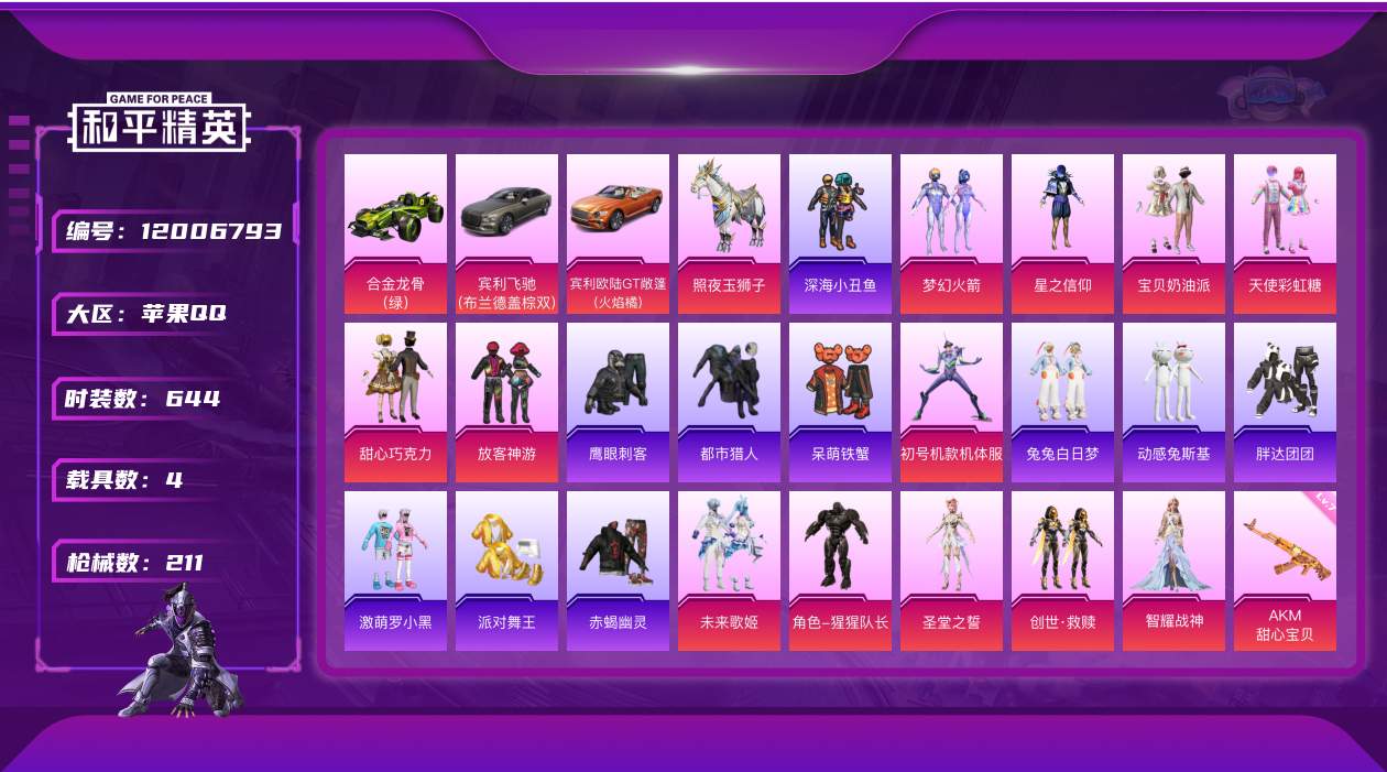 - [12233371]5粉装 6特效枪 1载具 15印记 可二次 可修改实名 优质装备:特斯拉Model 3(珍珠白),M762甜蜜誓约,AKM炫紫旋律,M416心之恋语,金风玉露,缤纷油彩(猪妹猪脸妹),甜蜜誓约,PEL轰鸣竞梦者,精灵迷巫,七级M416-心之恋语,七级M762-甜蜜誓约,MK14-樱桃泡泡,Kar98K-巳巳如意 热门装扮:软萌银虎,奇迹天团,大橘为重,潮萌小黄鸭,仓鼠灰灰 稀有枪皮:DP-28-豹影疾电 六级特效枪:六级AKM-炫紫旋律 五级特效枪:五级Kar98K-巳巳如意,五级DP-28-豹影疾电,五级MK14-樱桃泡泡 紫色装扮:SS31特训套装,SS30特训套装,SS23特训,SS33特训套装,青涩时光,顶瓜瓜,SS22特训,北国孤狼,吉莉礼服,圣诞大吉,夏日音浪,凛冬战士,幻世战舞者,幻影武者,刚毅裁决者,冷焰舞者,SS5特训,冰原使者,,SS21特训,SS17特训,SS14特训,SS15特训,SS20特训,战地督导,SS18特训,SS19特训,风行保卫者,骑行爱好者,魅力单车,麻辣教官,龙腾端午,冰河战士,龙魂突击队,蝶变,野性战心,酷潮明星,金鼠迎春,长空猛禽,雪山征服者,雪山精英,霓虹街区,跃动心情,无面战甲,深蓝色名流,湖蓝色名流,潮流先锋,灰色格斗者,炫蓝之夏,燃烧卡路里,牛气冲天,牛气满满,特殊使命,极速红龙,探宝勇士,格斗先锋,特战装甲,特训学院,绮丽涂鸦,缤纷果语,耀眼新星,蓝彩潮人,蓝色守护者,猎鹰,猛禽,甜蜜告白,疯狂小兔子,竞技勇士朋克,破晓战魂,破蛋小黄鸡,突袭者,SS29特训,狂花道·雅典娜,星途旅人,SS28特训,暗影刺翼,纯真浪花,鱼渊荷华,玉兔迎春,燕燕于飞,巳巳如意,竞技名士,街头风暴,异域银装,热情海星,SS24特训(SS24特训套装),焰鹰斗篷,幻羽潜行,SS27特训,情公主,深蓝冒险家,黑色刀锋,精神漫游,核芯基因,SS7特训,摇滚狂鲨,云丝凤蟒,迷域探索者,无畏开拓者,SS8特训,顽皮玉兔,众神之王,爱神,智慧之神,SS9特训,红酒骑士,风华少年志,幻世尖兵,折纸暴龙,云纹魔法士,拳皇97草薙京,炽焰拳师,格斗专家,SS6特训,赛博空间,不夜海上花,白月香洋装,SS12特训,梦之呓语,SS13特训,SS10特训,纯白誓言,暗夜契约,SS11特训,蓝甜马卡龙,SS32特训服(SS32特训套装),恋语绒绒,街舞达人