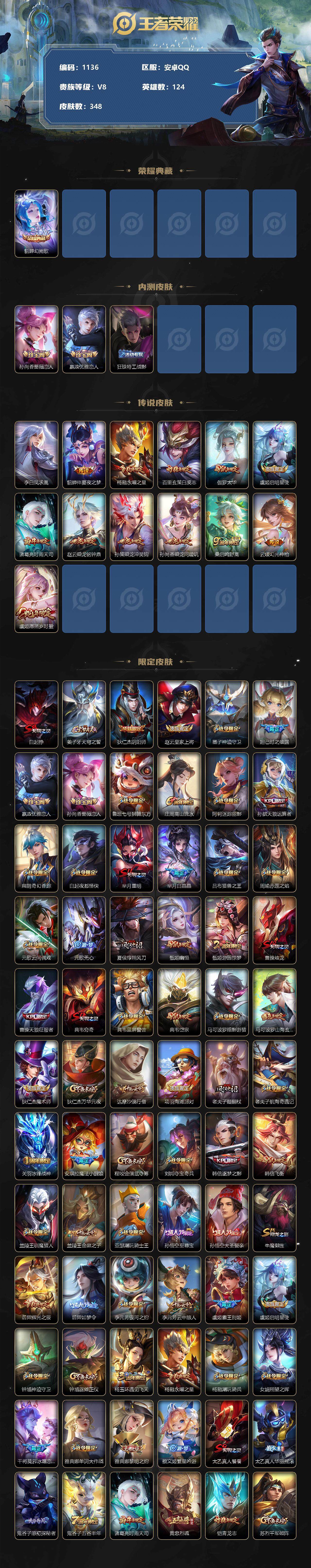 - [12085034]实名: 可修改 贵族等级: V10 英雄数: 125 皮肤数: 466 荣耀水晶: 鸣剑·曳影,全息碎影,九霄神辉 无双皮: 碎月剑心,韩信群星魔术团 珍品传说: 兔狲·蓬尾,酷洛米之心,大耳狗之梦,朽木白哉,黑崎一护 传说皮: 黄金狮子座,黄金射手座,绛天战甲,末日机甲-孙尚香,地狱火,仲夏夜之梦,零号·赤焰,时之恋人-刘备,淬星耀世,遇见胡旋,末日机甲-孙策,挚爱之约,挚爱花嫁,无双飞将,碎云,画中仙,妄想实况,艾琳觅芳踪,乘龙·问璇玑,落雪白狼,幻光神枪,祥瑞亨通,星之鸣奏,续相思,诡秘之主 限定皮: 冰锋战神,遇见飞天,李小龙,祈雪灵祝,游园惊梦,梁祝,时雨天司,引擎之心,魔法小厨娘,辉光之辰,异界灵契,天魔缭乱,神威,飞衡,天狼狩猎者,冰霜恋舞曲,逐梦之影,逐梦之光,神奇女侠,美猴王,白虎志,梅西,至尊宝,一生所爱,武陵仙君,如梦令-后羿,大圣娶亲,默契交锋-花木兰,霸王别姬-虞姬,高山流水,孙行者,猪悟能,寅虎·展翼,补天,百木心枪,玉兔公主,启示之音,匿光决锋者,无尽星芒,五谷丰年,神器·万象笔,山海·碧波行,齐天大圣,至美·化雀舞,至美·乘鲤谣,鸣野蒿,陌上桑,愿照·千秋盛,愿照·众生和,愿照·山河定,愿照·岁时盈,愿照·福禄聚,愿照·九州拓