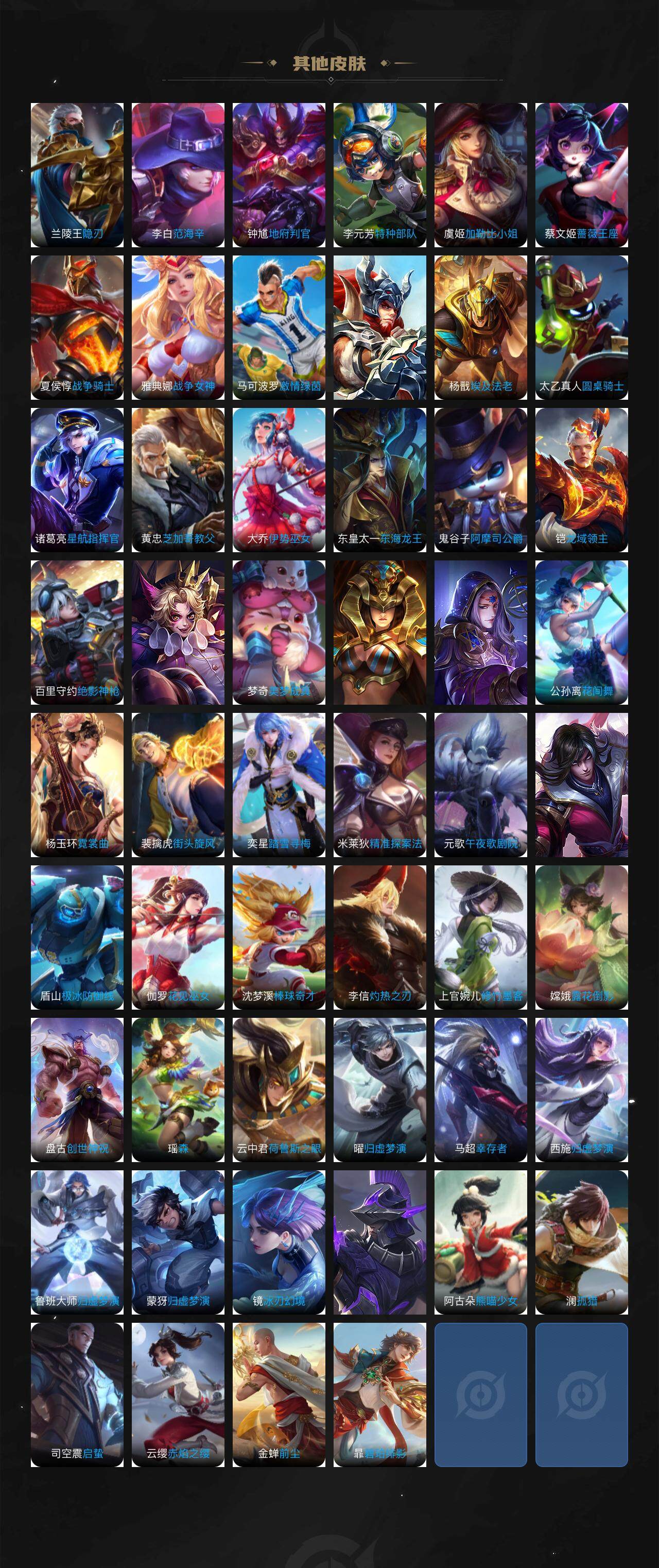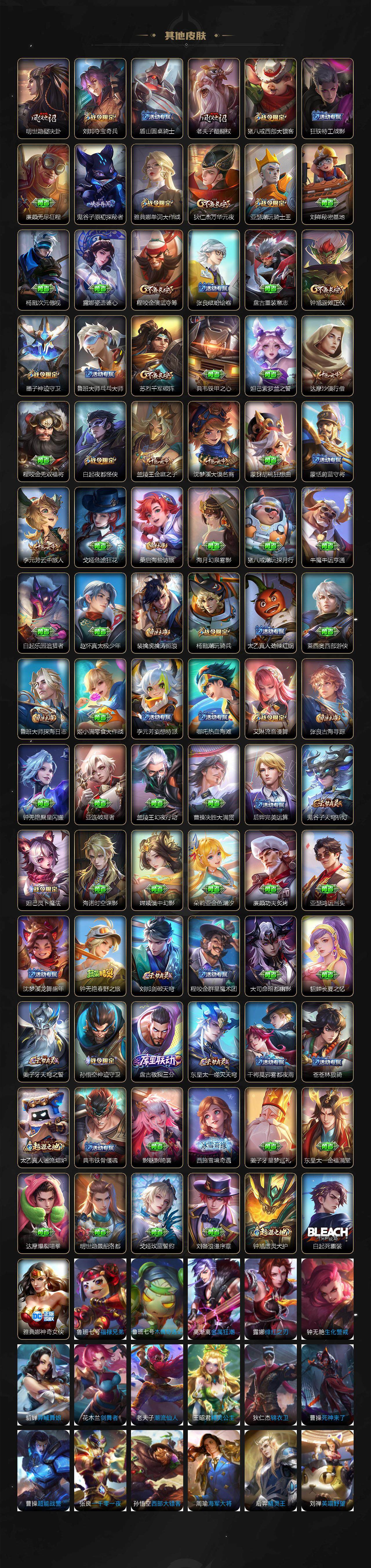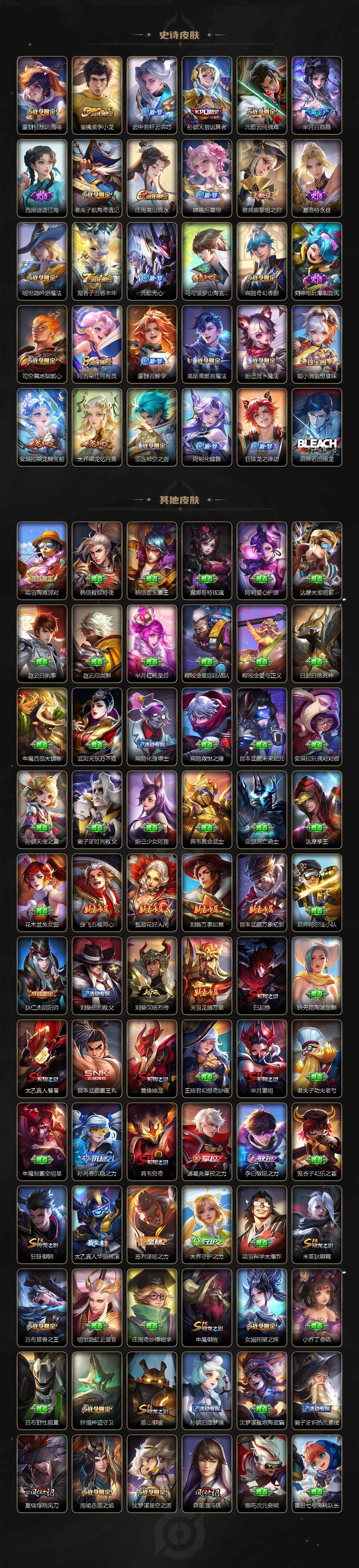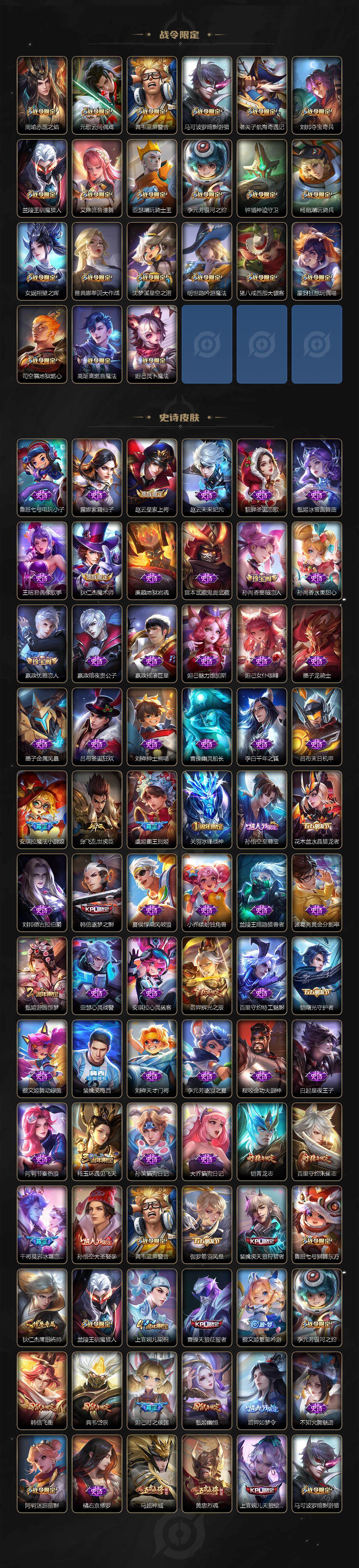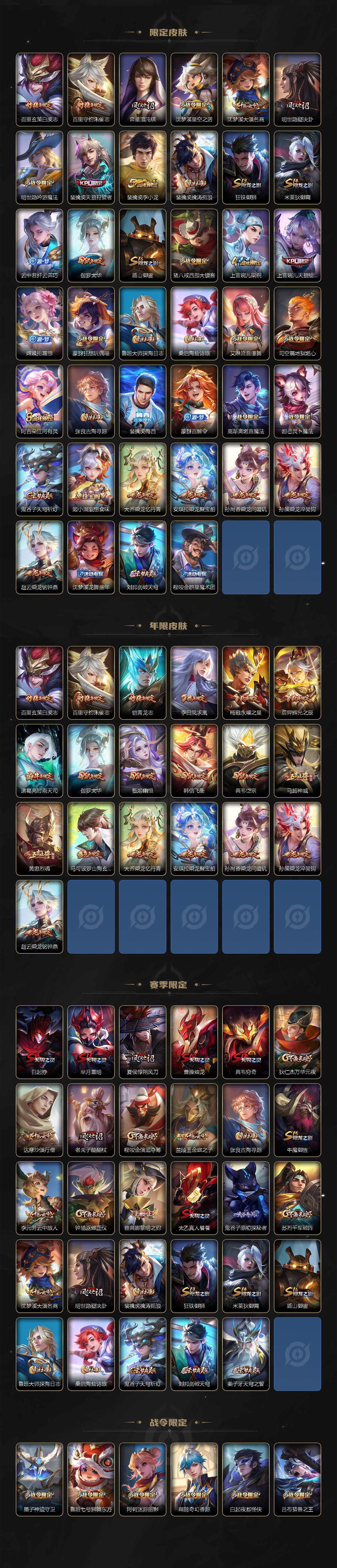 【限定皮肤】:白起狰,姜子牙天穹之誓,狄仁杰阴阳师,赵云皇家上将,墨子神迹守卫,妲己时之彼端,嬴政优雅恋人,孙尚香蔷薇恋人,鲁班七号狮舞东方,庄周高山流水,阿轲迷踪丽影,孙膑天狼运算者,扁鹊奇幻香踪,白起夜都怪侠,芈月重明,芈月白晶晶,吕布猎兽之王,周瑜赤莲之焰,元歌云间偶戏,元歌无心,夏侯惇朔风刀,甄姬幽恒,甄姬游园惊梦,曹操烛龙,曹操天狼征服者,典韦穷奇,典韦蓝屏警告,典韦岱宗,马可波罗暗影游猎,马可波罗山海玄木吟,狄仁杰魔术师,狄仁杰万华元夜,达摩沙漠行僧,项羽海滩派对,老夫子醍醐杖,老夫子航海奇遇记,关羽冰锋战神,安琪拉魔法小厨娘,程咬金演武夺筹,刘邦夺宝奇兵,韩信逐梦之影,韩信飞衡,兰陵王驯魔猎人,兰陵王金庭之子,亚瑟潮玩骑士王,孙悟空至尊宝,孙悟空大圣娶亲,牛魔御旌,后羿辉光之辰,后羿如梦令,李元芳银河之约,李元芳云中旅人,虞姬霸王别姬,虞姬启明星使,钟馗神迹守卫,钟馗驱傩正仪,杨玉环遇见飞天,杨戬永曜之星,杨戬潮玩骑兵,女娲朔望之晖,干将莫邪冰霜恋舞曲,雅典娜单词大作战,雅典娜黎明之约,蔡文姬繁星吟游,太乙真人饕餮,太乙真人华丽摇滚,鬼谷子原初探秘者,鬼谷子五谷丰年,诸葛亮时雨天司,黄忠烈魂,铠青龙志,苏烈千军破阵,百里玄策白虎志,百里守约朱雀志,弈星混沌棋,沈梦溪星空之诺,沈梦溪大漠名商,明世隐疑决卦,明世隐吟游魔法,裴擒虎天狼狩猎者,裴擒虎李小龙,裴擒虎擒涛扼浪,狂铁御狮,米莱狄御霄,云中君纤云弄巧,伽罗太华,盾山御銮,猪八戒西部大镖客,上官婉儿梁祝,上官婉儿天狼绘梦者,嫦娥拒霜思,蒙犽狂想玩偶喵,鲁班大师探海日志,桑启海盐诗旅,艾琳流音漫舞,司空震地狱燃心,阿古朵江河有灵,张良古海寻踪,裴擒虎梅西,蒙犽百解令,高渐离燃音魔法,妲己灵卜魔法,鬼谷子天穹祈灯,姬小满妄想食味,大乔乘龙忆丹青,安琪拉乘龙聚宝船,孙尚香乘龙问璇玑,孙策乘龙