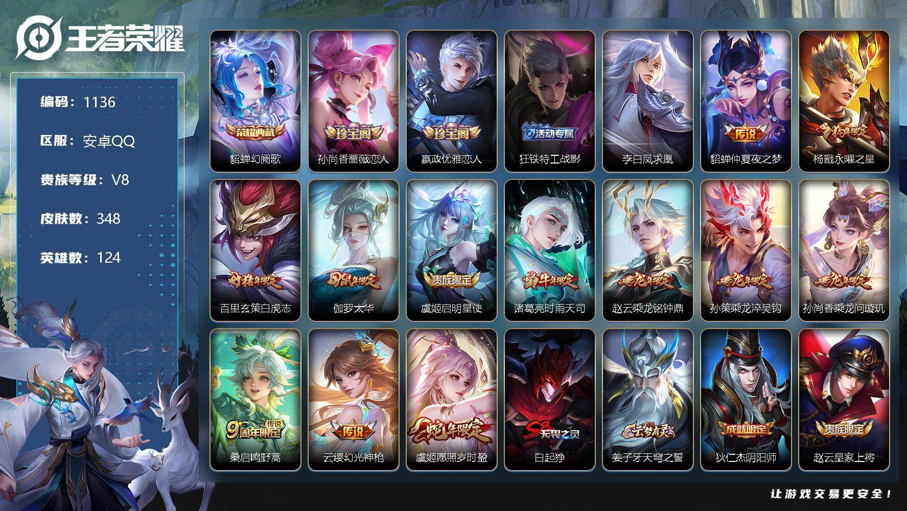 [12007766]【商品标题】:安卓Q-V7-永恒钻石III段位-124英雄-348皮肤-1典藏-0珍品无双-0无双-0珍品传说-13传说-107史诗