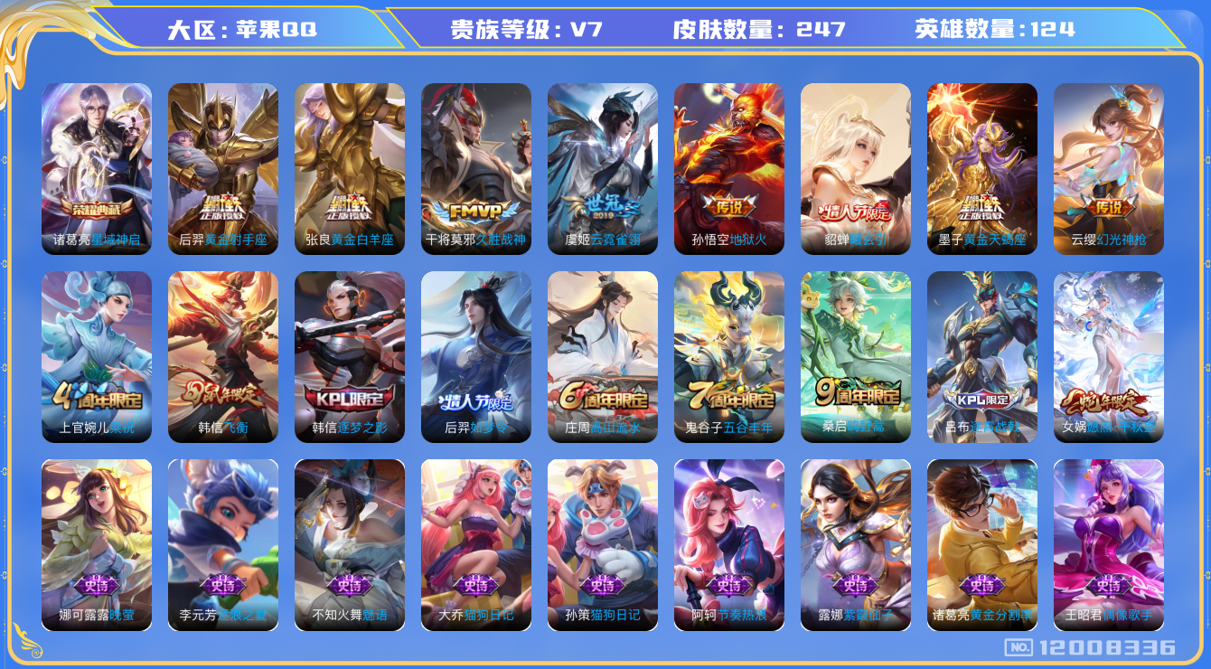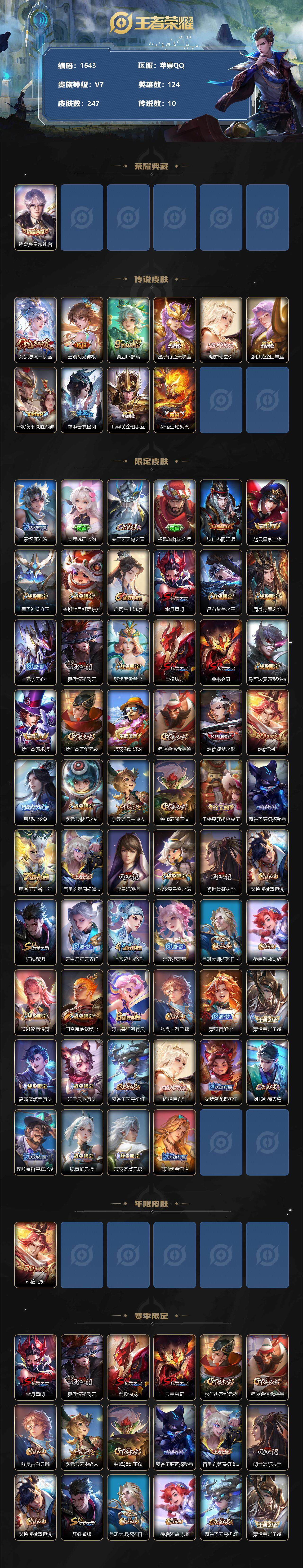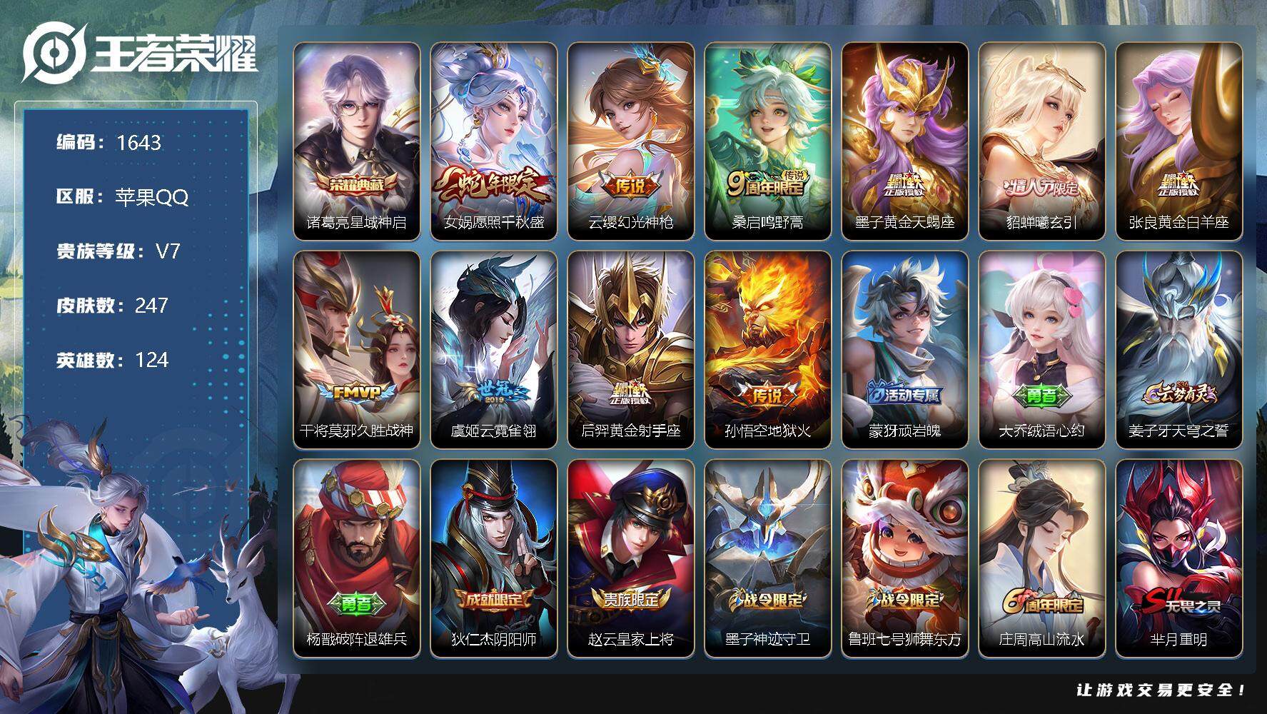 [12008336]【商品标题】:苹果Q-V7-最强王者段位-124英雄-247皮肤-1典藏-0珍品无双-0无双-0珍品传说-10传说-76史诗