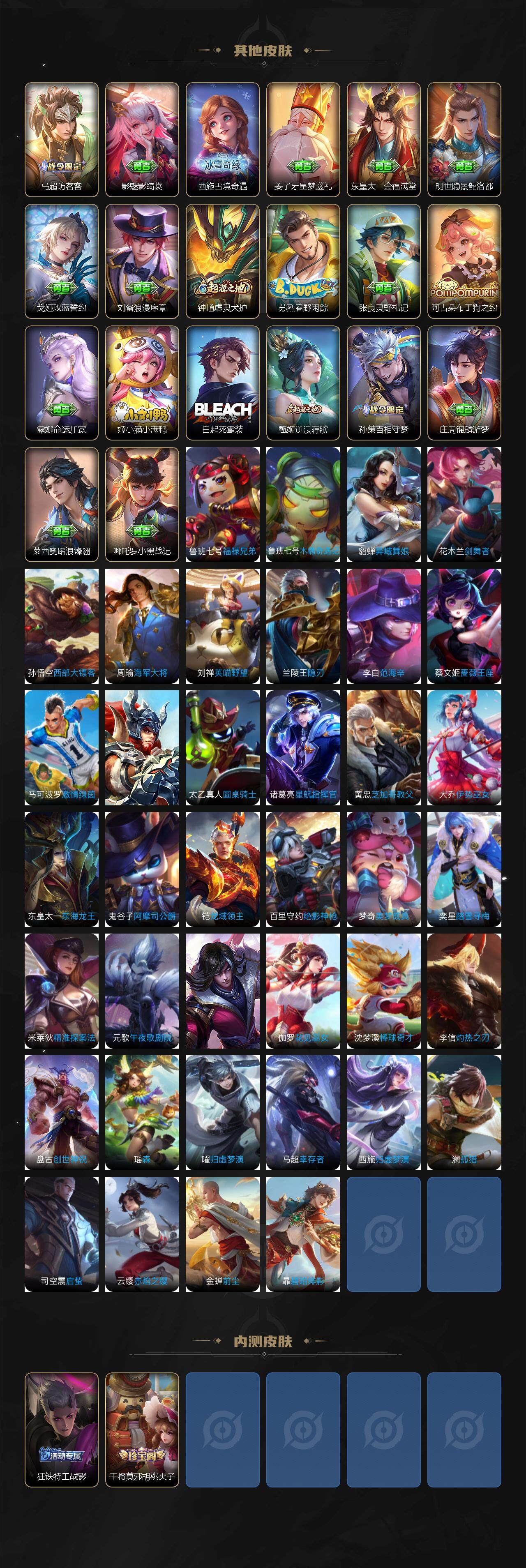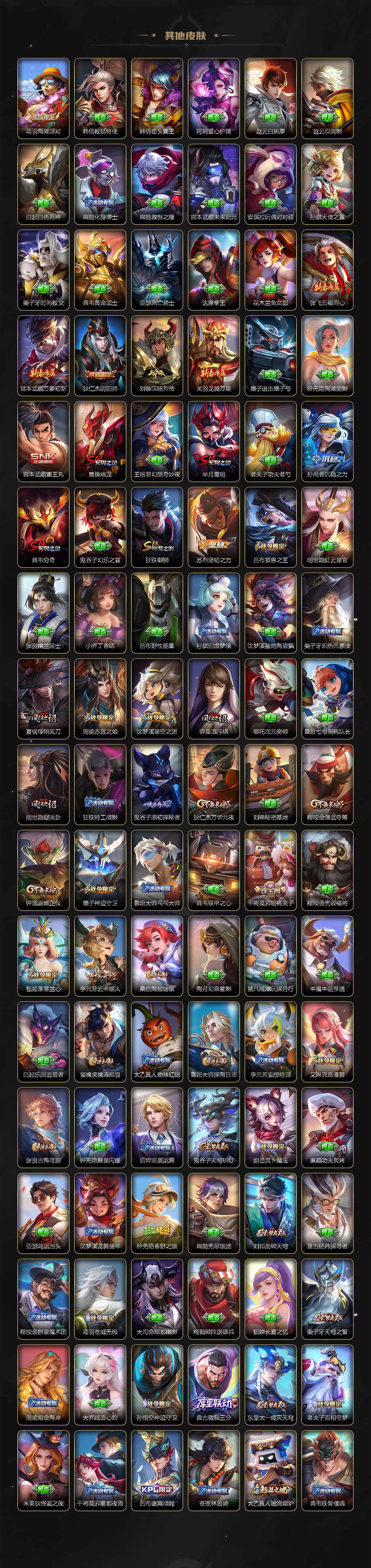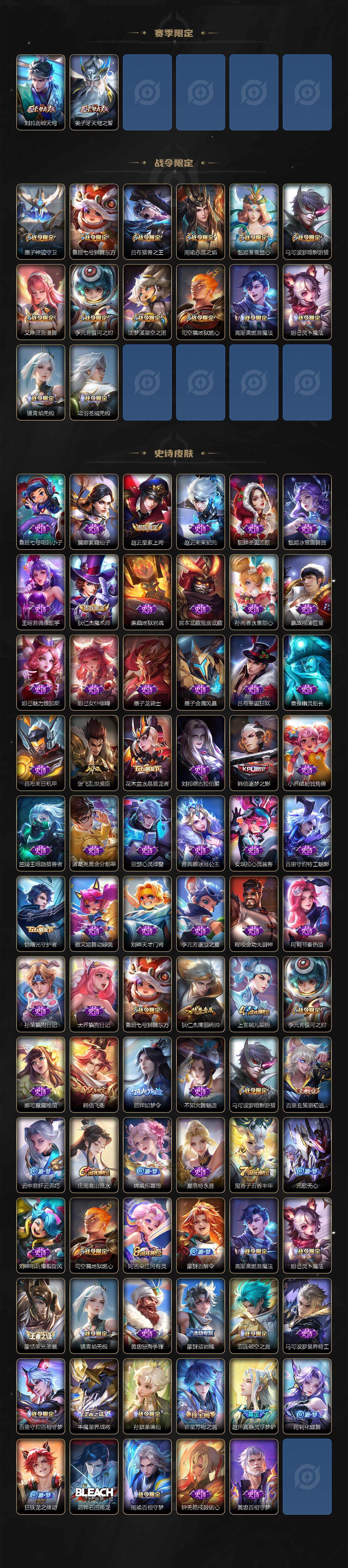 【赛季限定】:芈月重明,夏侯惇朔风刀,曹操烛龙,典韦穷奇,狄仁杰万华元夜,程咬金演武夺筹,张良古海寻踪,李元芳云中旅人,钟馗驱傩正仪,鬼谷子原初探秘者,百里玄策原初追逐者,弈星混沌棋,明世隐疑决卦,裴擒虎擒涛扼浪,狂铁御狮,鲁班大师探海日志,桑启海盐诗旅,鬼谷子天穹祈灯,蒙恬荣光圣徽,刘邦剑破天穹,姜子牙天穹之誓
