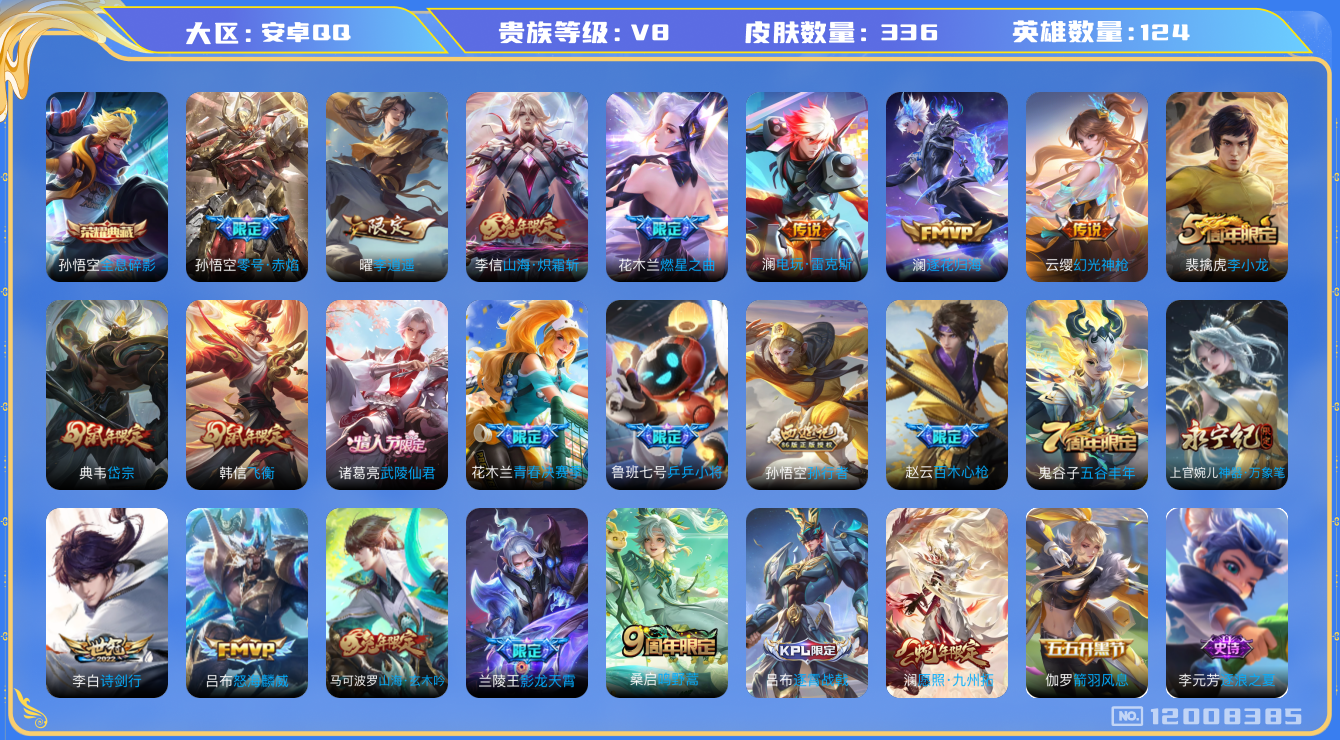 [12008385]【商品标题】:安卓Q-V8-至尊星耀V段位-124英雄-336皮肤-1典藏-0珍品无双-0无双-0珍品传说-14传说-103史诗