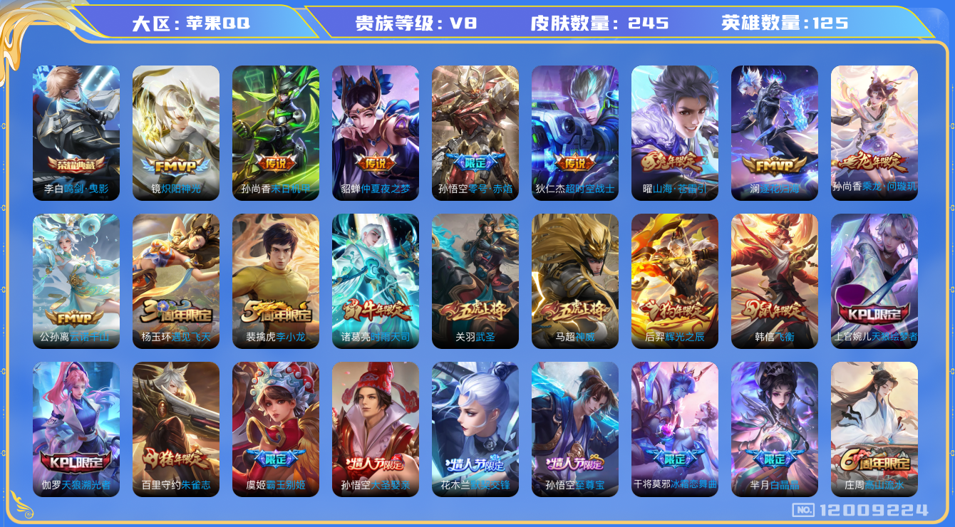 [12009224]【商品标题】:苹果Q-V8-最强王者段位-125英雄-245皮肤-1典藏-0珍品无双-0无双-0珍品传说-16传说-82史诗