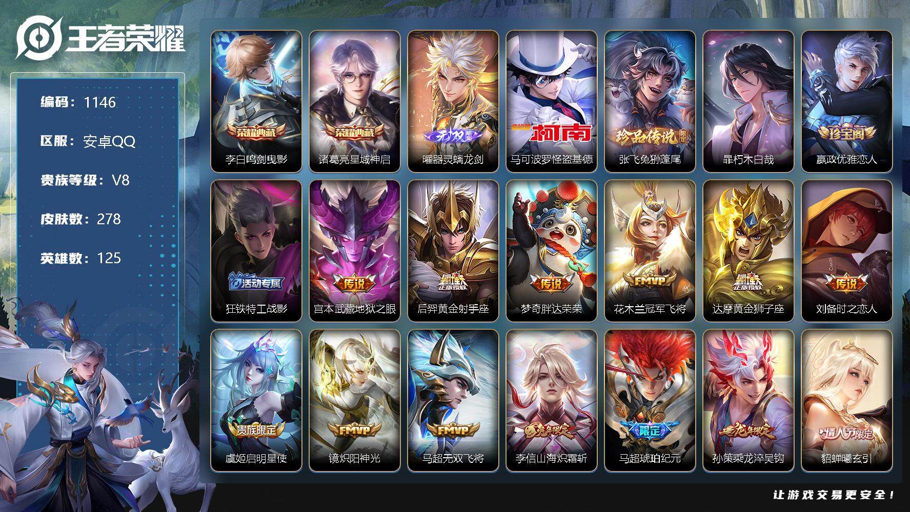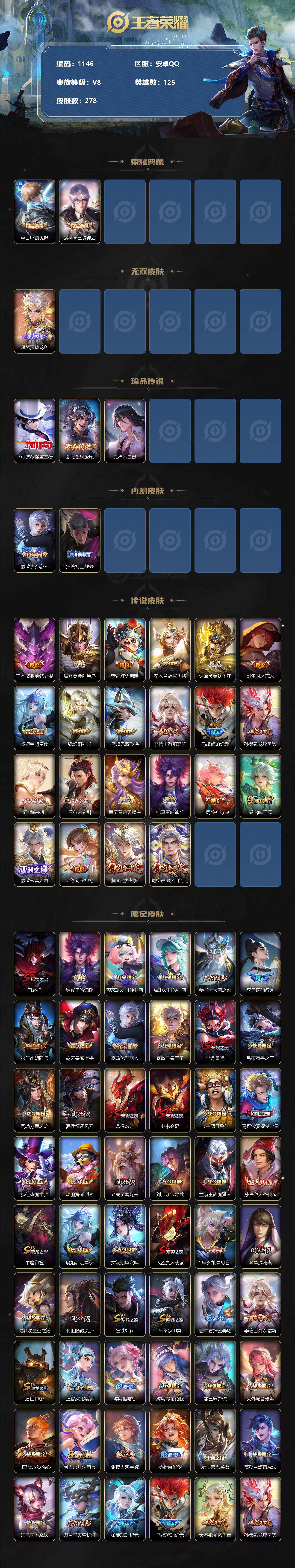 [12010956]【商品标题】:安卓Q-V8-最强王者段位-125英雄-278皮肤-2典藏-0珍品无双-1无双-3珍品传说-22传说-79史诗