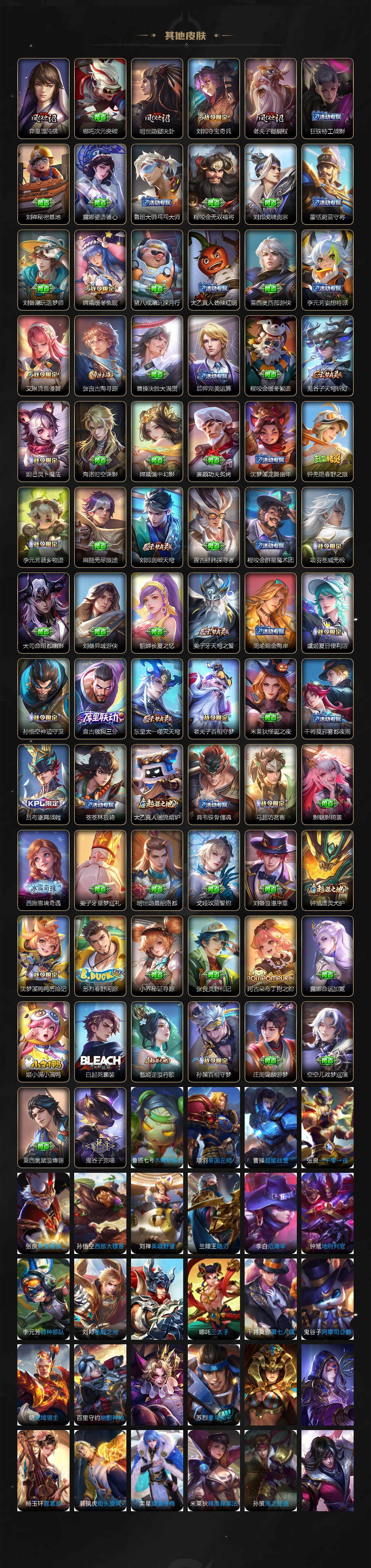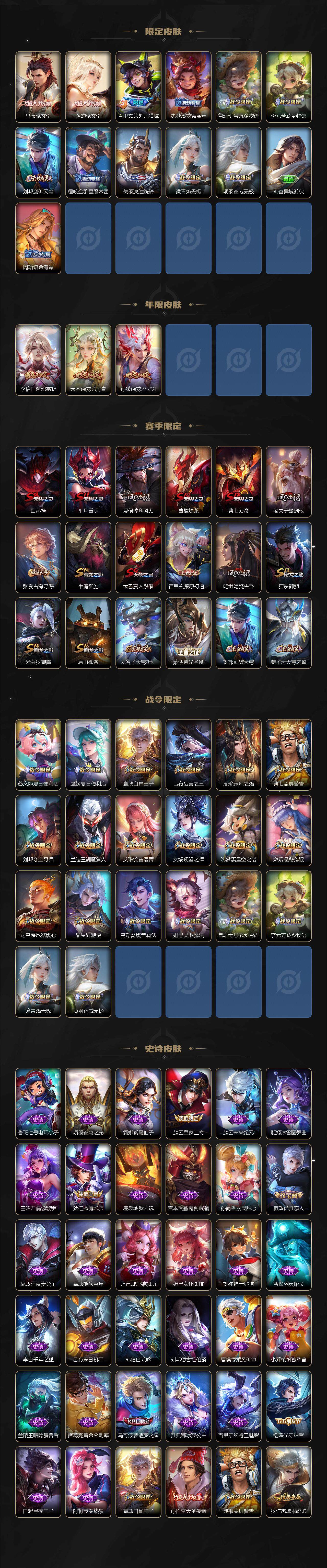 【限定皮肤】:白起狰,铠冥王哈迪斯,蔡文姬夏日便利店,虞姬夏日便利店,姜子牙天穹之誓,李白谪仙醉月,狄仁杰阴阳师,赵云皇家上将,嬴政优雅恋人,嬴政白昼王子,芈月重明,吕布猎兽之王,周瑜赤莲之焰,夏侯惇朔风刀,曹操烛龙,典韦穷奇,典韦蓝屏警告,马可波罗逐梦之星,狄仁杰魔术师,项羽海滩派对,老夫子醍醐杖,刘邦夺宝奇兵,兰陵王驯魔猎人,孙悟空大圣娶亲,牛魔御旌,虞姬启明星使,女娲朔望之晖,太乙真人饕餮,百里玄策原初追逐者,弈星混沌棋,沈梦溪星空之诺,明世隐疑决卦,狂铁御狮,米莱狄御霄,云中君纤云弄巧,李信山海炽霜斩,盾山御銮,上官婉儿梁祝,嫦娥拒霜思,嫦娥暖冬兔眠,暃星界游侠,艾琳流音漫舞,司空震地狱燃心,阿古朵江河有灵,张良古海寻踪,蒙犽百解令,蒙恬荣光圣徽,高渐离燃音魔法,妲己灵卜魔法,鬼谷子天穹祈灯,伽罗琥珀纪元,马超琥珀纪元,大乔乘龙忆丹青,孙策乘龙淬吴钩,吕布曦玄引,貂蝉曦玄引,百里玄策超元猎域,沈梦溪龙舞盛年,鲁班七号蔬乡物语,李元芳蔬乡物语,刘邦剑破天穹,程咬金群星魔术团,关羽决胜骁骑,镜青焰无极,项羽苍威无极,刘备异域游侠,周瑜熔金海岸