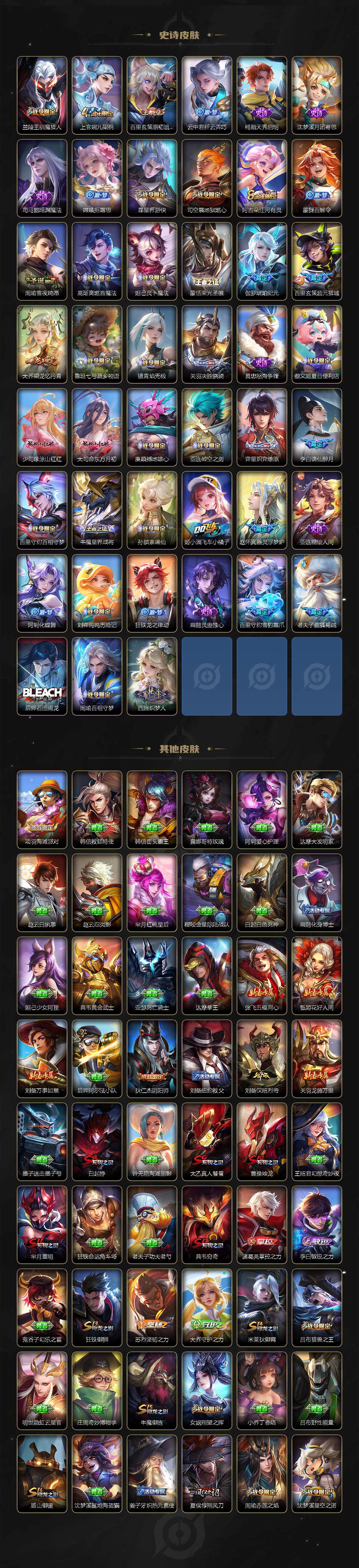 - [12091101]V8 1典藏 15传说 125英雄 319皮肤 可修改实名 优质装备:鸣剑·曳影,黄金狮子座,云鹰飞将(小将军),绛天战甲(鸡嘴战神),猫影幻舞,久胜战神,一念神魔,地狱火,零号·赤焰,地狱之眼,游龙清影(小青龙),末日机甲-孙策 传说皮:幻光神枪 珍宝阁皮:女武神,玩趣恶龙 限定皮:逐霄战戟,鸣野蒿,至尊宝,傲雪梅枪,白鹤梁神女,魔法小厨娘,时雨天司(水龙头),神威(电光马子),遇见飞天,高山流水,五谷丰年,冰锋战神,天狼运算者,游园惊梦,梁祝,御风骁将(吕布年限),天狼溯光者,李小龙,朱雀志(守约年限),圣诞老人,默契交锋-花木兰,孙行者,猪悟能,大圣娶亲 史诗皮:化蝶舞,紫霞仙子,电玩小子(小书包),白龙吟,特工魅影,千年之狐,永昼,江河有灵,魅语,百解令(蒙犽),蒙恬荣光圣徽,冰冠公主,偶像歌手,晚萤,电玩·爆裂旋风,暗夜猫娘,龙骑士(小龙虾),末日机甲-吕布,猫狗日记-孙策,乱世虎臣,节奏热浪,修罗,女仆咖啡,摇滚巨星,水果甜心,绅士熊喵,天才门将,星夜王子,心灵骇客,时之奇旅-安琪拉,功夫厨神,德古拉伯爵,暗隐猎兽者,幽灵船长,鬼剑武藏,心灵战警,天秀·启明,舞动绿茵,地狱岩魂,纤云弄巧,拒霜思,缤纷独角兽,乘风破浪,逐浪之夏,水晶猎龙者,金属风暴,原初追逐者,圣诞狂欢,圣诞恋歌,鹰眼统帅,暗夜贵公子,魅力维加斯,黎明之约,无心,未来纪元-赵云