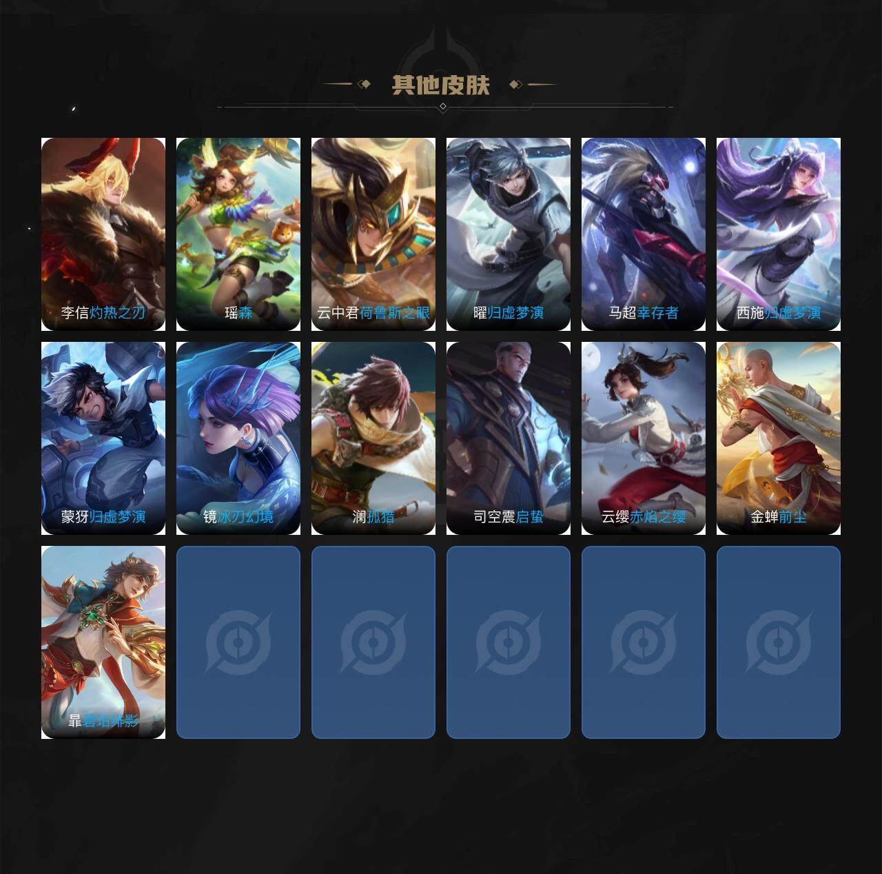 【赛季限定】:白起狰,芈月重明,夏侯惇朔风刀,曹操烛龙,典韦穷奇,老夫子醍醐杖,张良古海寻踪,牛魔御旌,太乙真人饕餮,百里玄策原初追逐者,弈星混沌棋,明世隐疑决卦,狂铁御狮,米莱狄御霄,盾山御銮,鬼谷子天穹祈灯,蒙恬荣光圣徽,刘邦剑破天穹,姜子牙天穹之誓