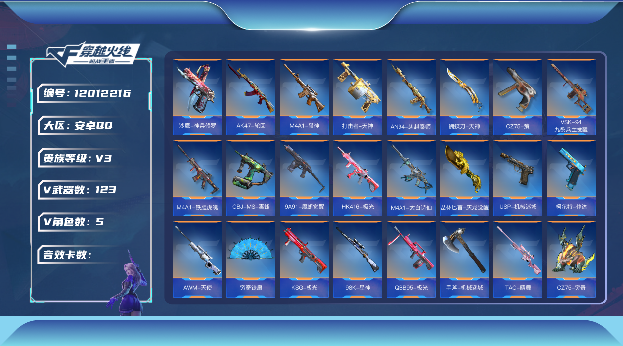 [12012216]V3 4王者武器 123英雄武器 5英雄角色 可二次 可修改实名 优质装备:MK47-仁德,CZ75-策,CZS2-仲康 v武器:沙鹰-神兵修罗,AK47-轮回,M4A1-猎神,打击者-天神,AN94-赳赳秦师,蝴蝶刀-天神,VSK-94-九黎兵主觉醒,M4A1-铁胆虎魄,CBJ-MS-毒蜂,9A91-魔蜥觉醒,HK416-极光,M4A1-太白诗仙,丛林匕首-庆龙觉醒,USP-机械迷城,柯尔特-仲达,AWM-天使,穷奇铁扇,KSG-极光,98K-星神,QBB95-极光,手斧-机械迷城,TAC-晴舞,CZ75-穷奇,QSZ92-冰魂觉醒,MAC-10-孟获,烈焰弓,HK417-炎龙铠甲,末日裁决觉醒,QBZ97-浩瀚征途,DDM4-PDW-星际宇航觉醒,AWM-大湾溢彩,巴雷特-朱雀,双持沙鹰-元让,气勇胆烈戟,AWM-指南针,AWM-指南针觉醒,唐刀-华夏传说,左轮-卧龙觉醒,甩棍-卧龙觉醒,SCAR-心动PICK,破邪蛇棍觉醒,GLOCK18-猎神,马来剑-耀金伯爵,女皇利刃-铁胆虎魄,龙鳞-觉醒,思召剑,SCAR-幽暗骑士,98K-血月,M4A1-雷神,AK47-无影,M4A1-黑骑士,M4A1-死神,AK47-沙漠领主,AK12-天启,加特林-炼狱,AWM-天龙,巴雷特-毁灭,巴雷特-极光,09式狙-天神,AWM-裁决,98K-黑骑士,AK47-燎天净火,AK47-血武士,81式-光明之神,MK47-云舞,M4A1-龙血,QBZ03-金色蔷薇,AK47-黑鲨,QBZ03-死神,星芒,麒麟刺,神罚战斧,马来剑-毁灭,AK47-华夏传说,屠龙,地狱火,双持斯泰尔-天使,沙鹰-修罗,双持柯尔特-极光 王者武器:王者之霆,王者之迹 枪械皮肤:激昂霸王枪