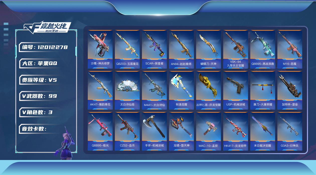 [12012278]V5 1王者武器 99英雄武器 3英雄角色 可二次 可修改实名 优质装备:AK47-奉先,M200-幻神 v武器:沙鹰-神兵修罗,QBZ03-玉面羞花,SCAR-探星者,AN94-赳赳秦师,蝴蝶刀-天神,VSK-94-九黎兵主觉醒,QBB95-再战涿鹿,M16-恶魔,AK47-雅韵青花,太白诗仙扇,M4A1-太白诗仙,秋逸觉醒,丛林匕首-庆龙觉醒,USP-机械迷城,唐刀-大唐荣耀,加特林-堡垒,QBB95-极光,CZS2-血月,手斧-机械迷城,龙啸-堕天神,MAC-10-孟获,HK417-炎龙铠甲,末日裁决觉醒,G3A3-衍神兵,环刃-炫光掠影觉醒,AWM-大湾溢彩,双持沙鹰-元让,沙鹰-宇航兔兔,气勇胆烈戟,AWM-指南针,M4A1-神工天巧,左轮-卧龙觉醒,甩棍-卧龙觉醒,破邪蛇棍觉醒,马来剑-耀金伯爵,女皇利刃-铁胆虎魄,龙鳞-觉醒,蟒蛇-鼓龙,SCAR-幽暗骑士,AK12-天启,巴雷特-毁灭,巴雷特-极光,M4A1-竞界荣光,M4A1-赛博雷神,AK47-血武士,M4A1-海骑士,尼泊尔-机械纪元,M4A1-心动次元,QBZ03-金色蔷薇,AK47-黑鲨,星芒,神罚战斧,屠龙,地狱烈炎,汤姆逊-烈龙,双持斯泰尔-天使,沙鹰-修罗,双持柯尔特-极光 王者武器:王者之霆 枪械皮肤:激昂霸王枪