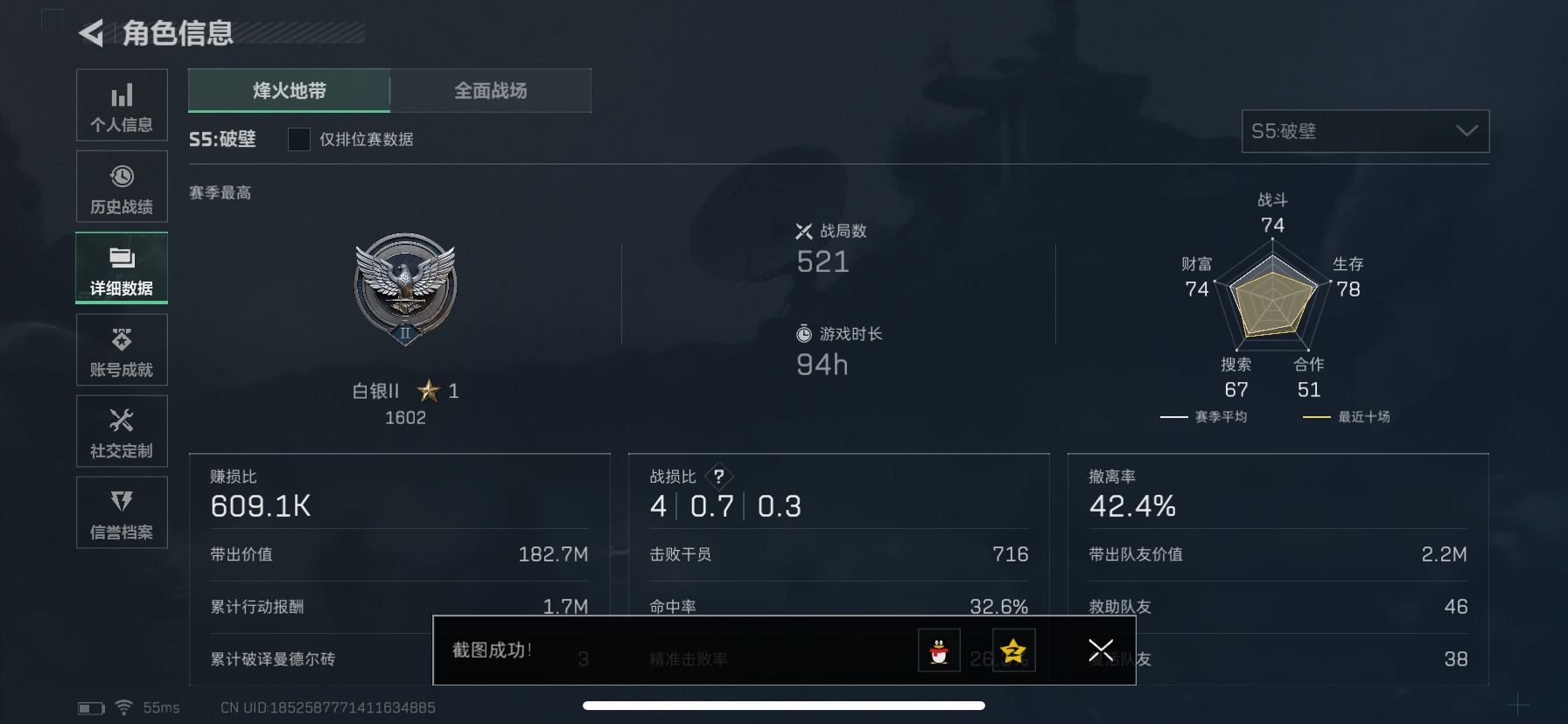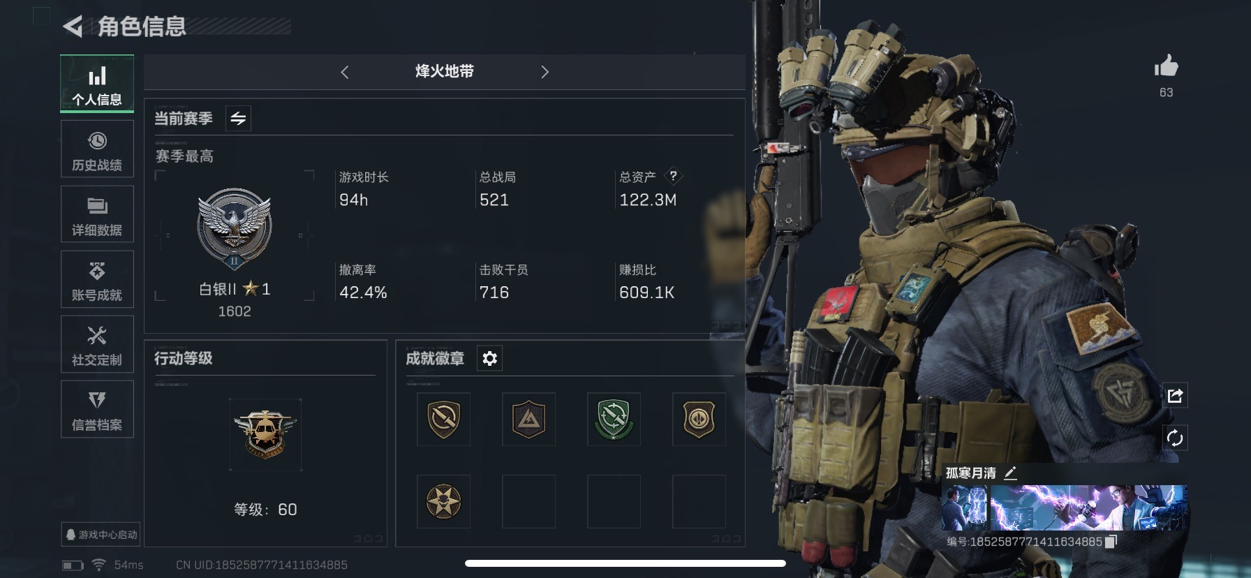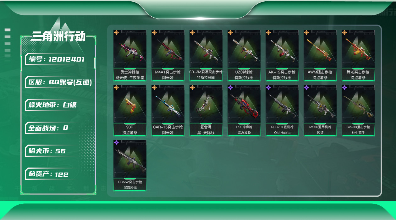 [12012401]总资产:122.3M 10传说枪械 哈夫币:56.276K 可二次 可修改实名 烽火地带段位:白银 全面战场段位:上等兵 传说武器皮肤:AK-12突击步枪-特斯拉线圈,SR-3M紧凑突击步枪-特斯拉线圈,UZI冲锋枪-特斯拉线圈,勇士冲锋枪-能天使-午夜邮差,腾龙突击步枪-捞点薯条,93R-捞点薯条,AWM狙击步枪-捞点薯条,M4A1突击步枪-阿米娅,CAR-15突击步枪-阿米娅,复合弓-黑-天际线 史诗武器皮肤:SV-98狙击步枪-林中猎手,M250通用机枪-囚徒,P90冲锋枪-紧急戒备,QJB201轻机枪-Old Habits,SG552突击步枪-深海恐惧