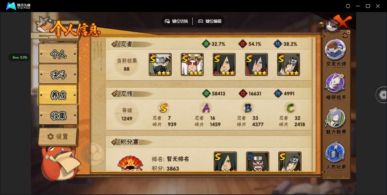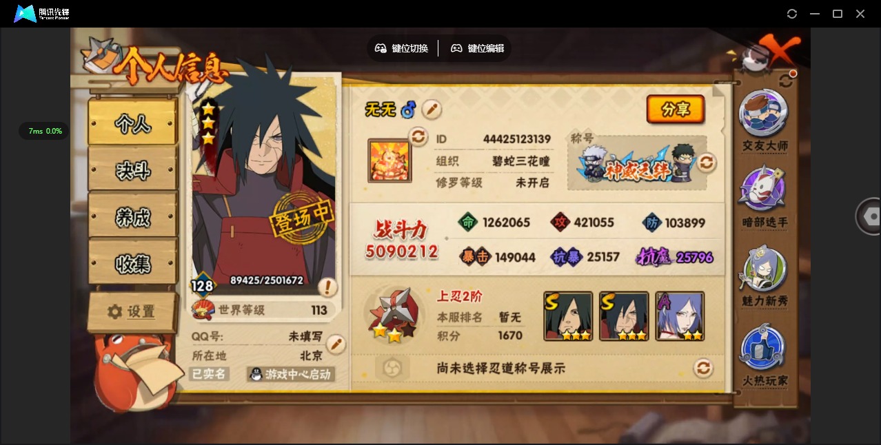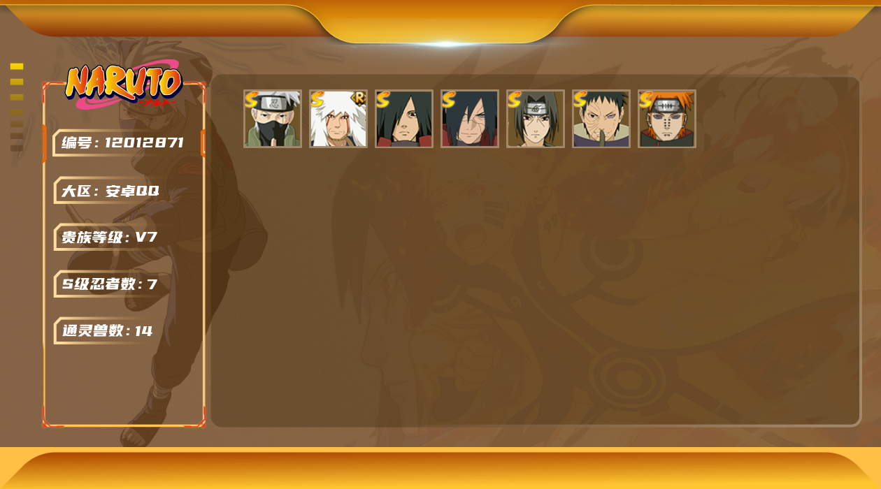 [12012871]V7 7S忍 16A忍 14通灵 509W战力 可二次 可修改实名 优质装备:熊猫,宇智波斑,宇智波带土 「忍界大战」,宇智波斑「秽土转生·解」,旗木卡卡西「须佐能乎」 S级忍者:自来也 「舞之豪杰」,宇智波鼬 「须佐能乎」,佩恩「天道」