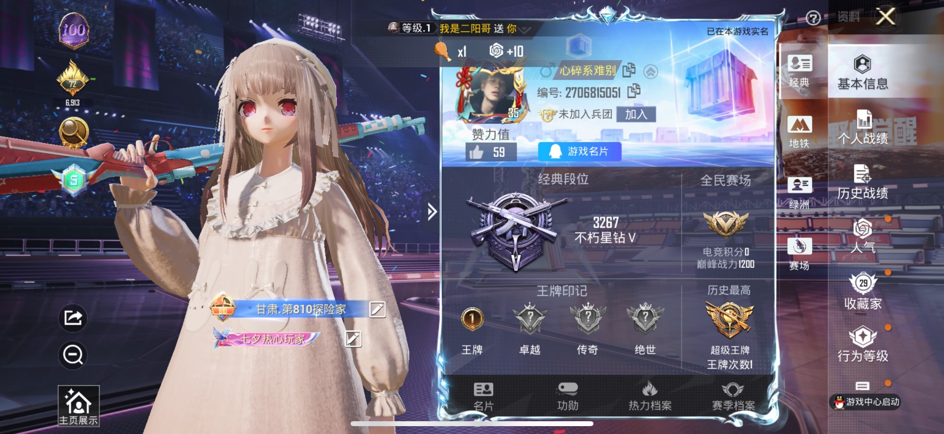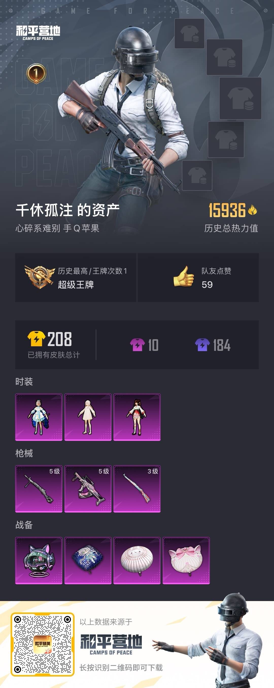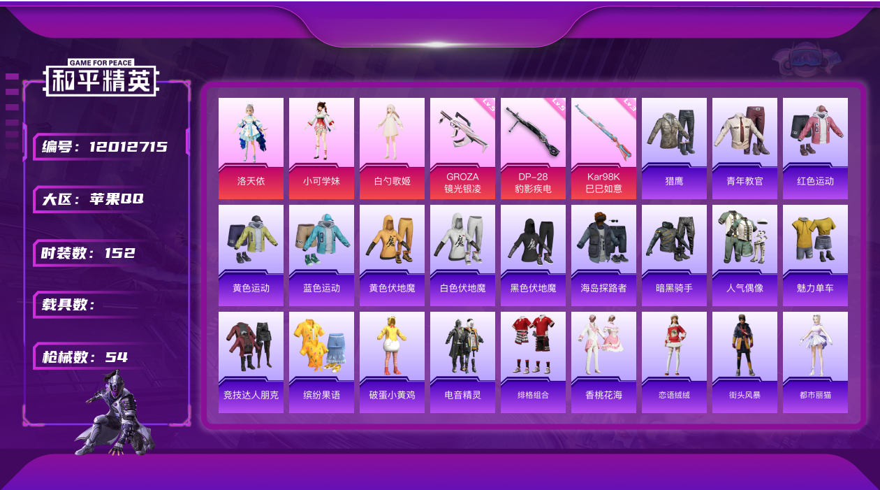 [12012715]3粉装 3特效枪 1印记 可二次 可修改实名 优质装备:洛天依,GROZA-镜光银凌,Kar98K-巳巳如意 热门装扮:白勺歌姬,小可学妹 稀有枪皮:DP-28-豹影疾电 五级特效枪:五级GROZA-镜光银凌,五级DP-28-豹影疾电 三级特效枪:三级Kar98K-巳巳如意 紫色装扮:SS31特训套装,人气偶像,SS30特训套装,SS33特训套装,电音精灵,青年教官,缤纷果语,蓝色运动,绛羽幽主,魅力单车,黄色伏地魔,黄色运动,黑色伏地魔,香桃花海,海岛探路者,暗黑骑手,白色伏地魔,破蛋小黄鸡,竞技达人朋克,红色运动,猎鹰,星途旅人,鱼渊荷华,燕燕于飞,巳巳如意,都市丽猫,青团波波,糖糖葫芦,棉花软糖,街头风暴,智谋强哥,SS32特训服(SS32特训套装),绯格组合,恋语绒绒 优质战备:星途旅人降落伞,千金淑猫降落伞,白勺歌姬降落伞,洛神天依降落伞