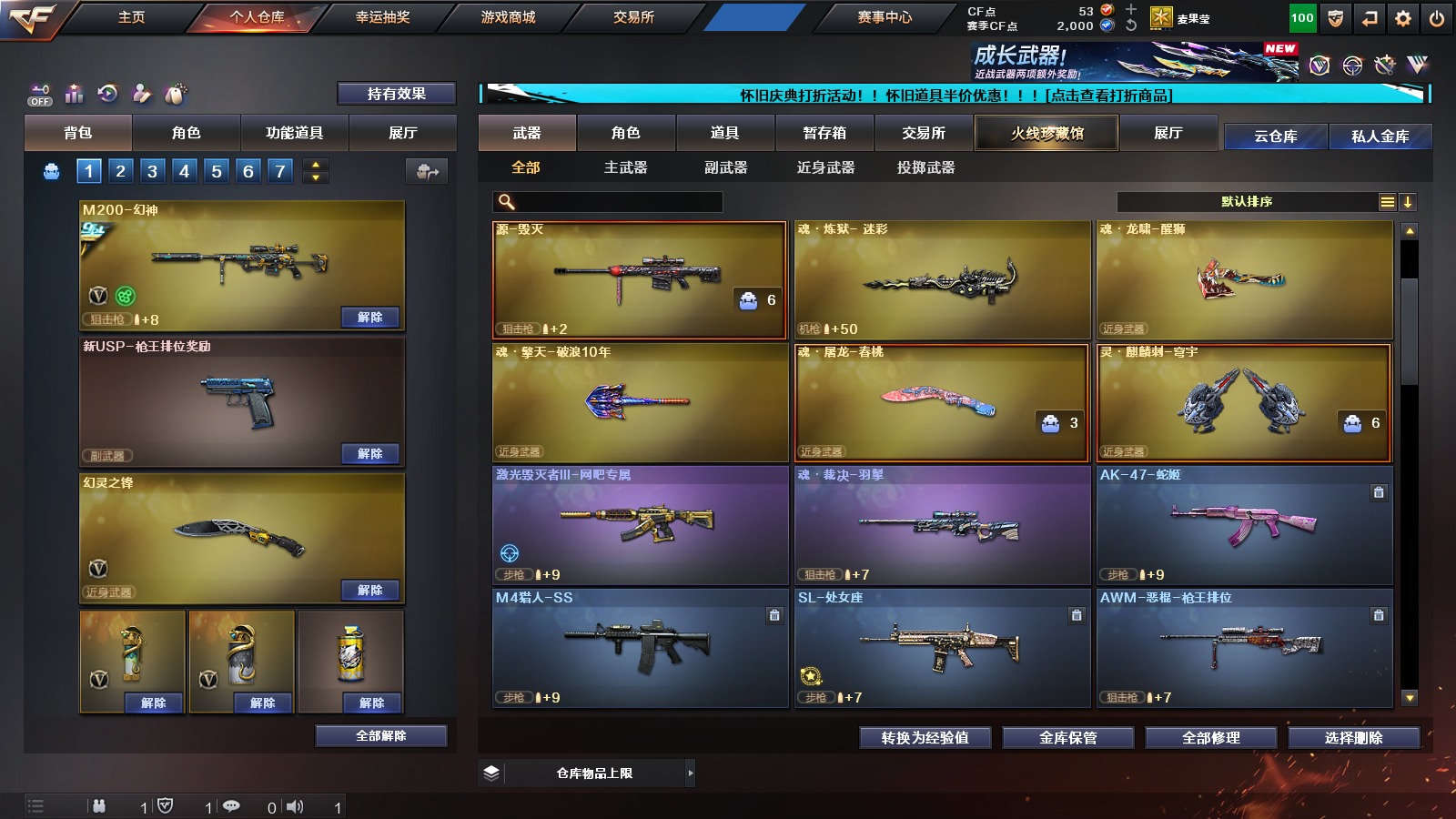 [12012911]1传说角色 10V武器 可二次 可修改实名 优质装备:M200-幻神,AK47-火麒麟,M4A1-雷神,M4A1-黑骑士,沙鹰-修罗,沙鹰-天神,幻灵之锋,修罗-古蛇迷踪,死神-雪域霜狐 排位资格:有 V武器:AK47-黑鲨