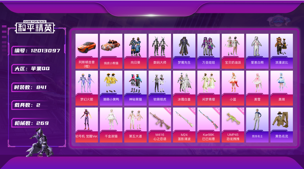 [12013097]11粉装 4特效枪 2载具 7印记 可二次 可修改实名 身法装备:初号机 觉醒Ver.(新紫螳螂),8号机(新粉螳螂),Mark.06(新蓝螳螂) 优质装备:阿斯顿·马丁DBX(橙),M416心之恋语,梦幻火箭(新101)(新火箭少女101粉色套装),数码大师,宝贝奶油派,向日葵(套装-向日葵先生),冰霜白皇,UMP45恐龙拽拽,M24莲影清波,七级M24-莲影清波,七级M416-心之恋语,千金淑猫,Kar98K-巳巳如意 热门装扮:第五大道,闲梦青缨,美雪,美琪,小蓝,初号机 觉醒Ver.(新紫螳螂),神秘黑猫,软萌银虎,潮萌小黄鸭,万圣娃娃,梦魇先生,爱崽白熊,浪漫波比 载具:俏皮小熊猫 五级特效枪:五级Kar98K-巳巳如意 二级特效枪:二级UMP45-恐龙拽拽 紫色装扮:田园牧歌,轻风白浪,和煦暖阳,SS22特训,白啸长虹,SS23特训,娇憨猪猪,暖心橘喵,萌趣咩咩,暖心熊熊,SS21特训,SS31特训套装,SS2特训,SS3特训,SS4特训,SS5特训,人气偶像,六六大吉,军械专家,冰原使者,,冰川特警,决胜时刻,凛冬战士,刚毅裁决者,北国孤狼,午夜朋克,SS33特训套装,青涩时光,SS20特训,SS15特训,SS16特训,闪金天王,银白舞王,SS13特训,星梦畅游,治愈之星,科技之星,SS14特训,军刀雅典娜,豚鼠丹丹,吉莉礼服,雪兔飞飞,天籁歌者,向日葵先生,阳光火鸡,野性战魂,金鼠迎春,长空猛禽,雪山征服者,雪山精英,霓虹街区,风暴特警,苍穹猎鹰,荣耀,街头潮人,跃动心情,飞行日记,魅力单车,麻辣教官,黄色名流,黄色格斗者,黎明保卫者,龙的传人,龟仙人,冰河战士,龙魂突击队,蝶变,香桃花海,熔岩游骑兵连帽夹克,和平特警,沙漠毒蛇,极地朋克,柠萌假日,派对绅士,海滨突袭者,深蓝色名流,滨海假日,圣诞大吉,坚韧舞者,夜莺强袭者,完美偶像,帅气教官,幻世战舞者,怒火燎原,战地菁英,探宝勇士,攀登者,滨海厨神,绮丽涂鸦,甜蜜菠萝,疯狂小兔子,破蛋小黄鸡,神秘领域,游猎者,福星高照,空岛之星,竞技勇士朋克,王牌教练,牛气冲天,灼焰舞者,热血青春,燃烧卡路里,牛气满满,猛禽,特工青苹果,特战英豪,特战装甲,狂战萌兔,镭射皇者,雏菊兔兔,萝兰蝴蝶,SS29特训,达芬奇,多纳泰罗,星途旅人,白光莹,纯真浪花,热情海星,曼妙人鱼,SS28特训,8号机(新粉螳螂),